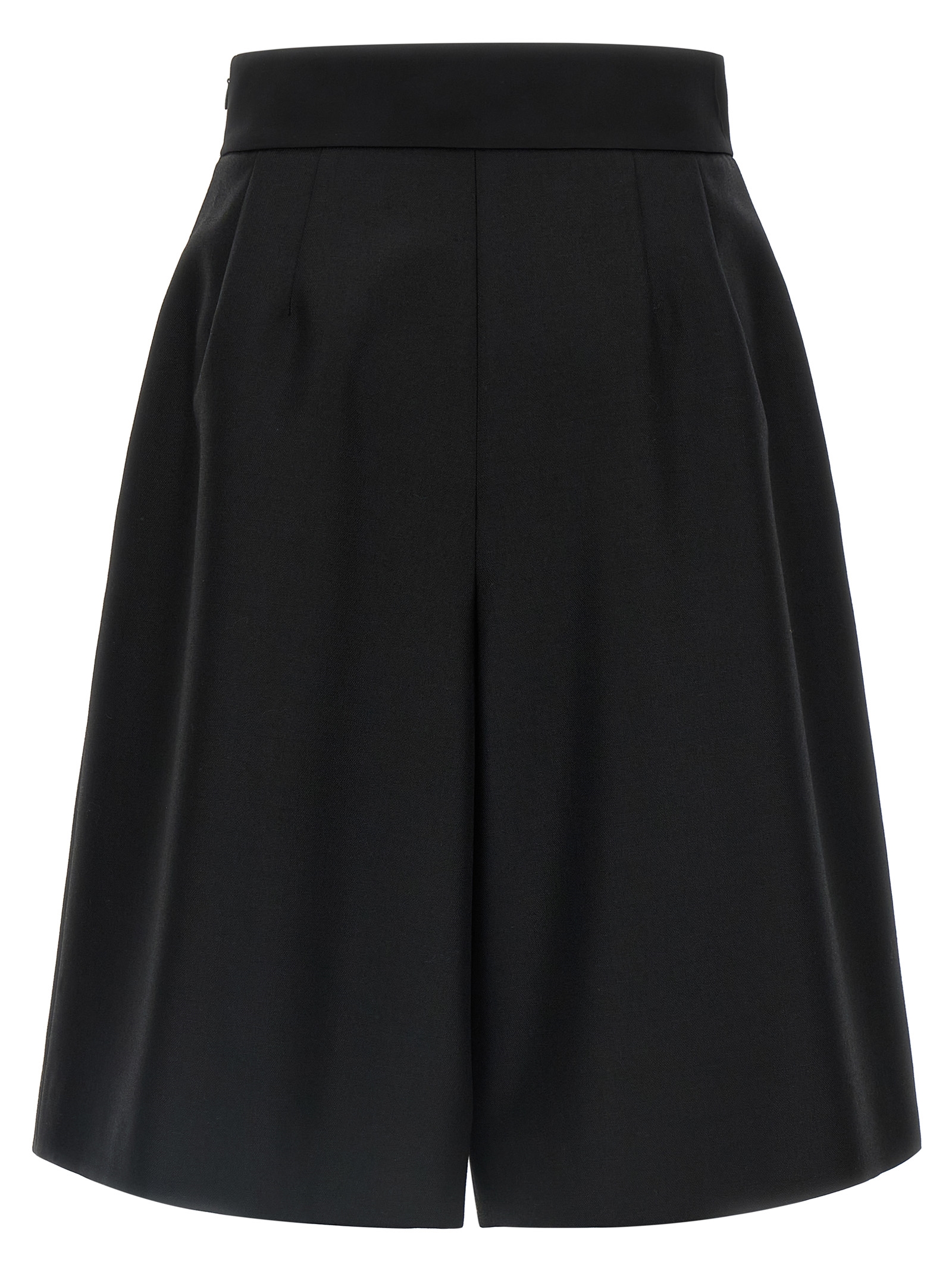 Mohair wool bermuda shorts, wide leg, front pleats, belt detail with maxi silk bow at the waist, side zip and hook closure, side pockets.