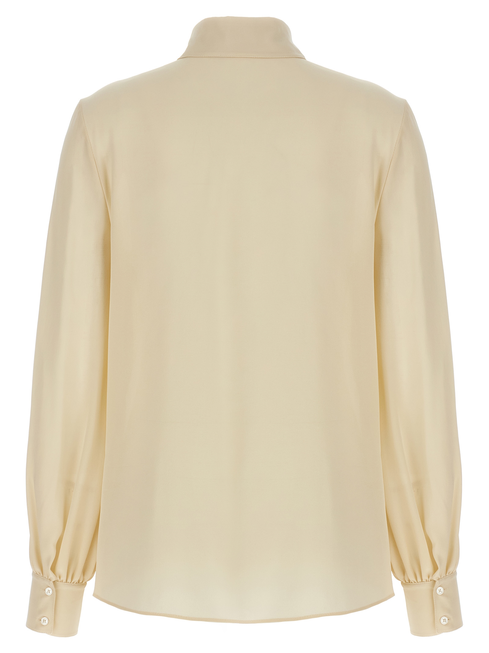 De Chine crepe shirt with front snap button closure with contrast bow detail, long cuffed sleeves.