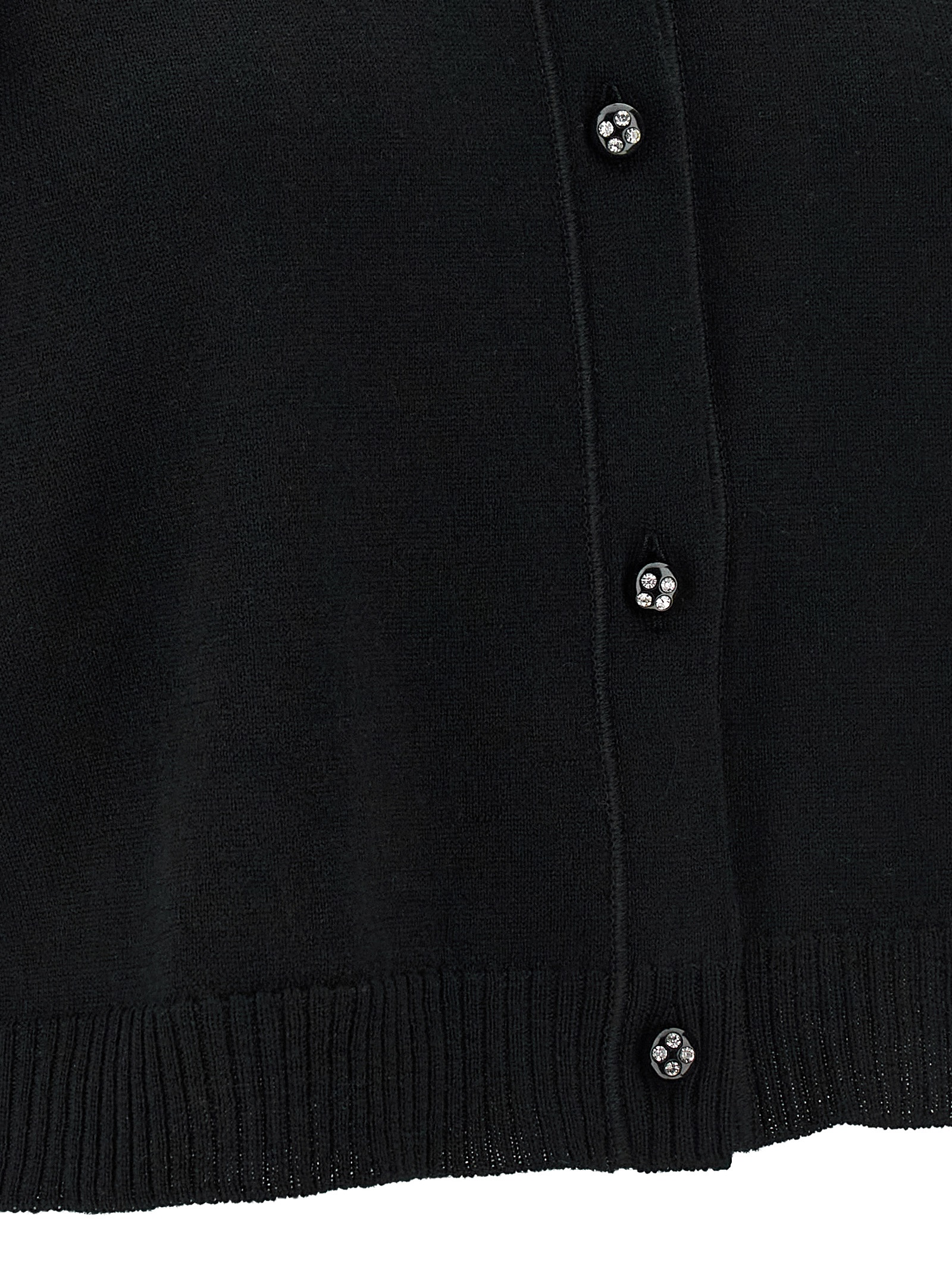 Wool knit cardigan, crew neck, front closure with jewel buttons, feather detail on the shoulders, sleeveless.