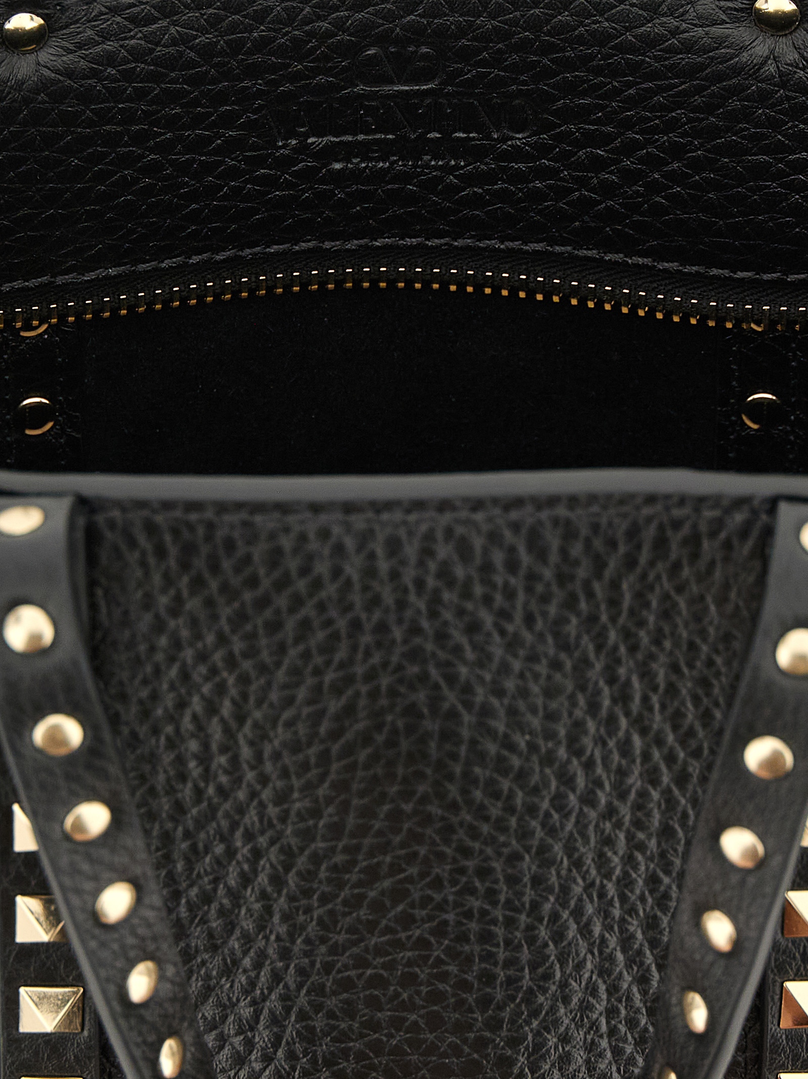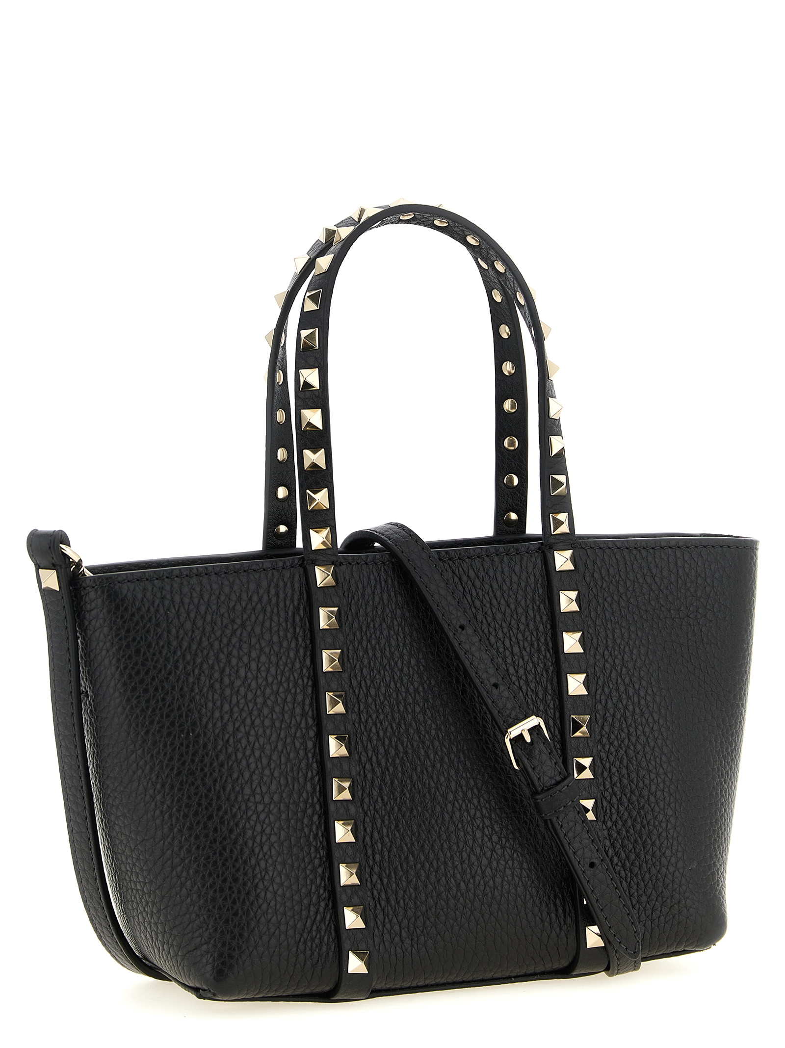 ‘Rockstud’ mini hammered leather shopping bag with metal stud application, double fixed handle, upper inner zip closure, rigid base with metal feet, nappa lining, adjustable and removable shoulder strap.