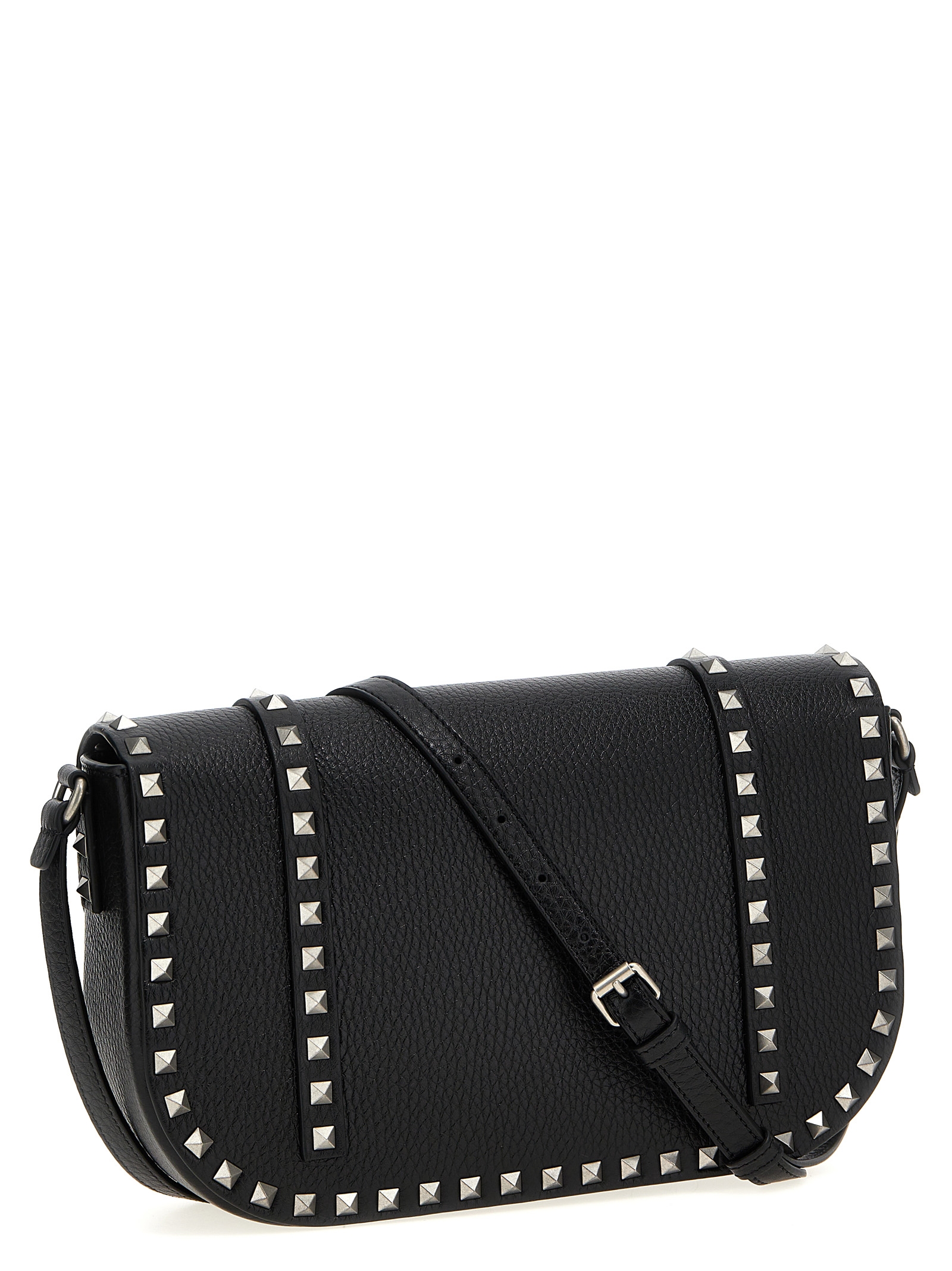 ‘Rockstud’ crossbody bag in grenade leather with antiqued metal studs, magnetic flap closure, adjustable shoulder strap.
