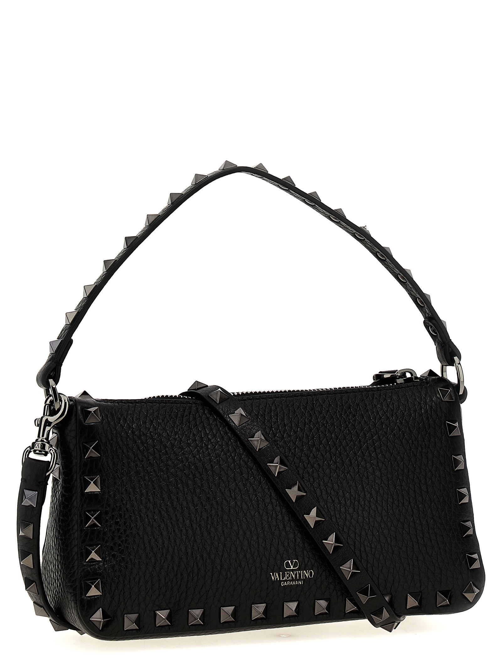 ‘Rockstud Small’ leather shoulder bag with stud applications, zip closure, fixed handle, removable shoulder strap.