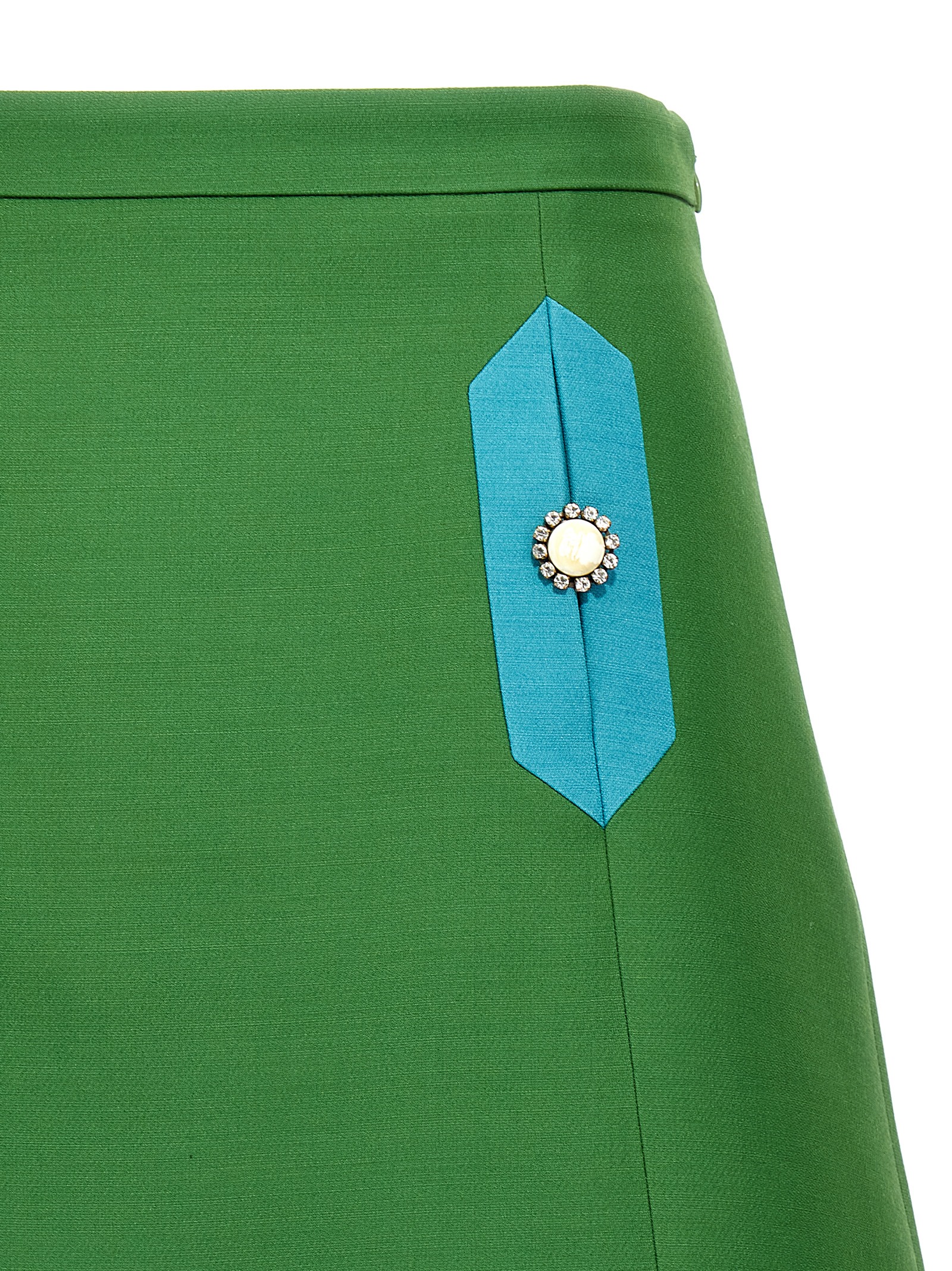 Solid’ skirt in wool and silk crepe couture, contrast pockets with jewel button closure, side zip closure.
