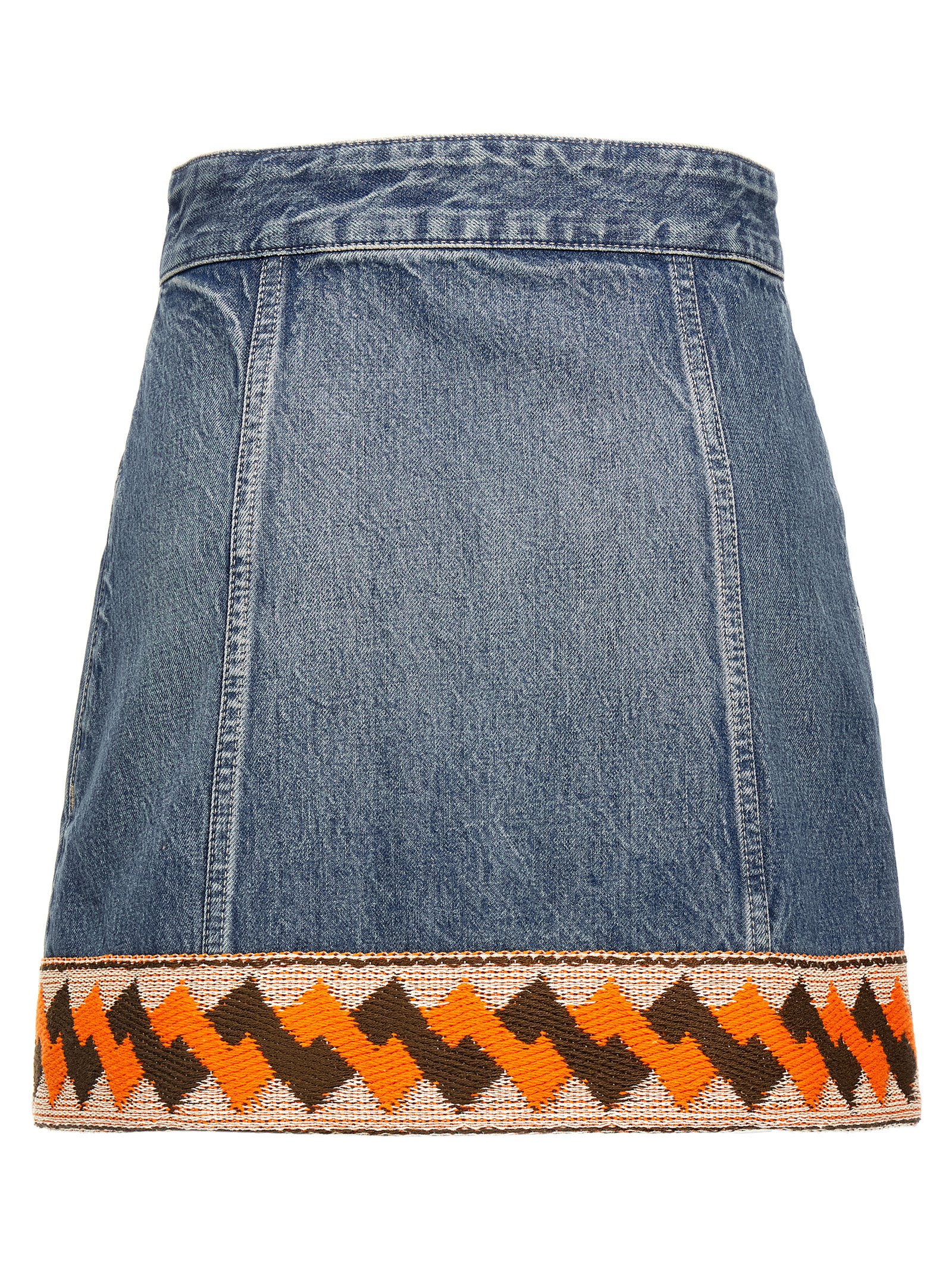 Cotton denim mini skirt with trimming detail on the hem, front button closure, pockets.