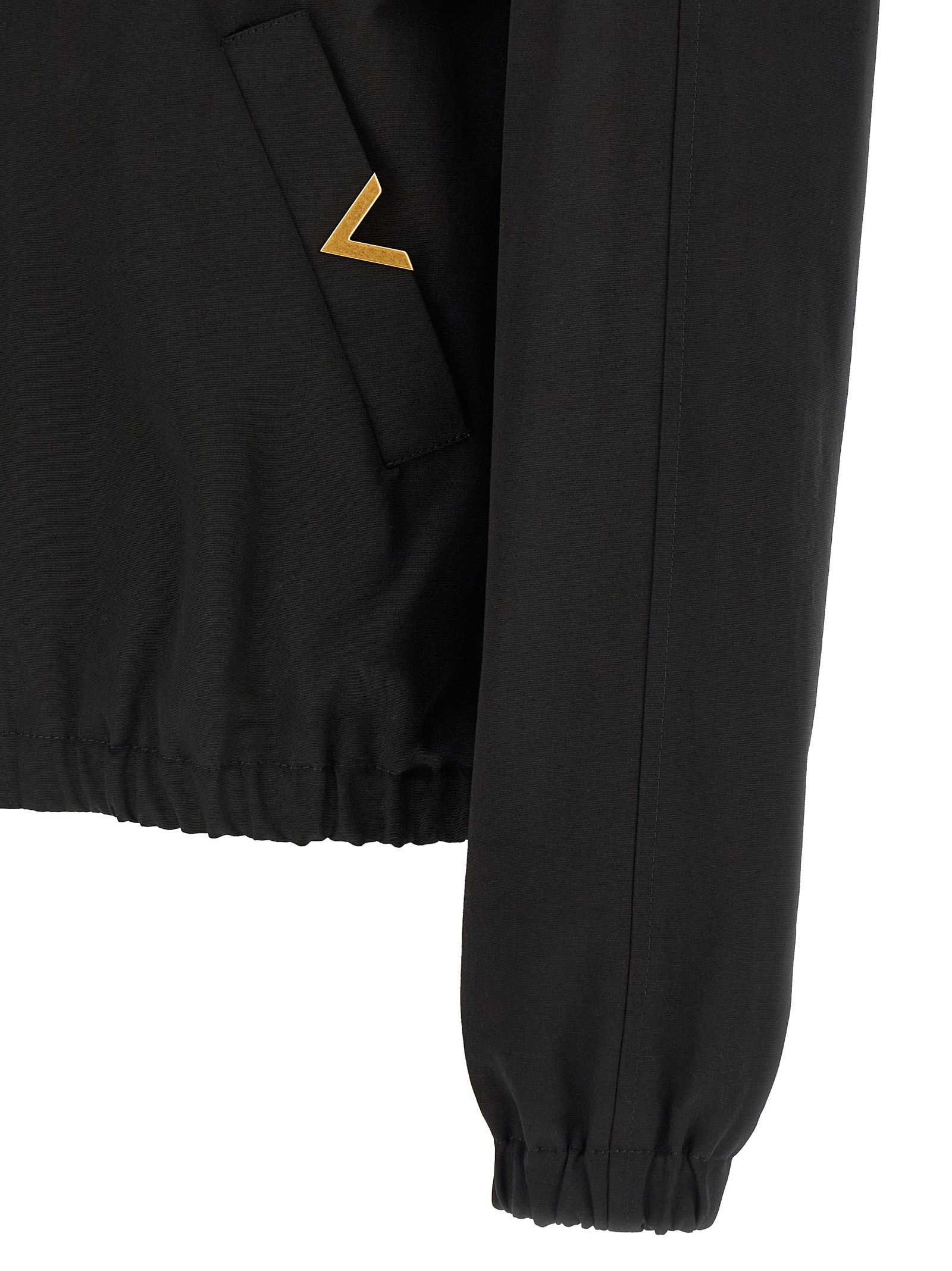 ‘Valentino’ cotton bomber jacket with cupro lining, shirt collar, front zip closure, pockets with antiqued metal ‘VGold’ logo detail, long raglan sleeves with elastic cuffs, elastic hem.