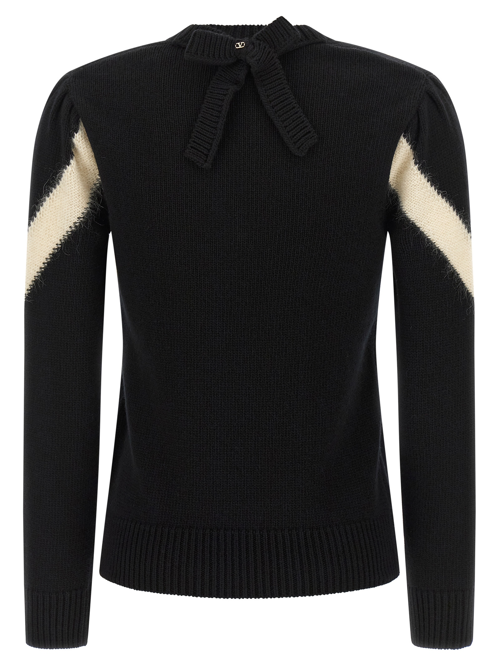 Virgin wool sweater with VLogo Signature contrast intarsia, V-neck, bow detail with VLogo Signature metallic on the back, long cuffed sleeves.