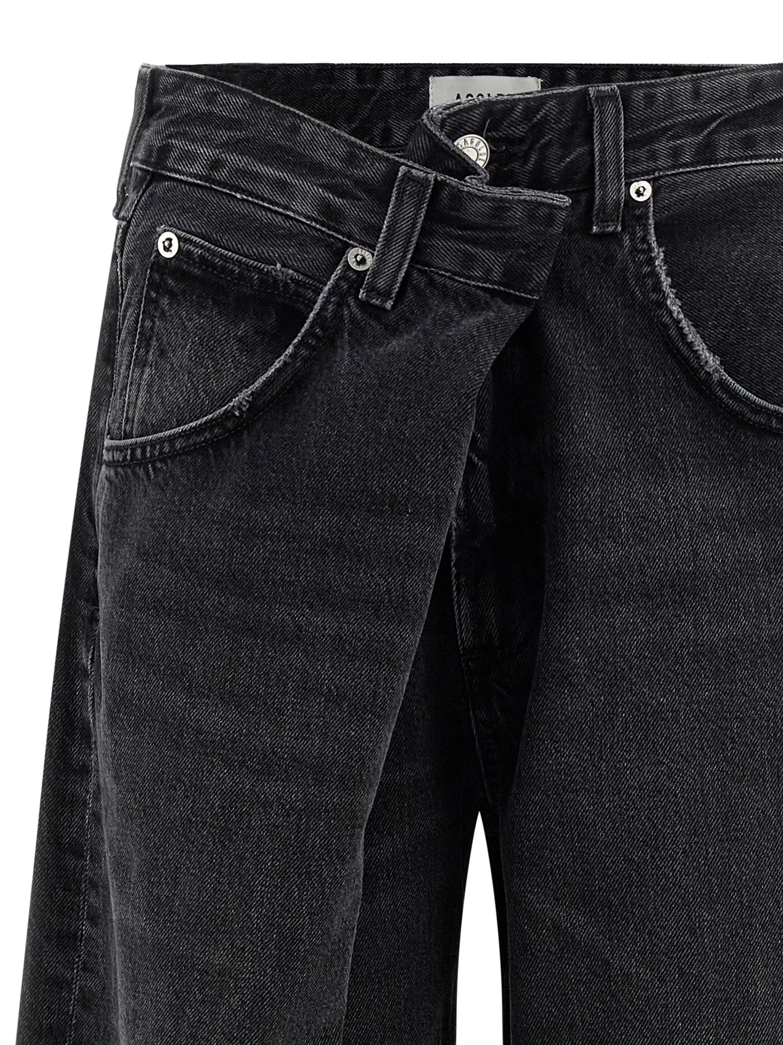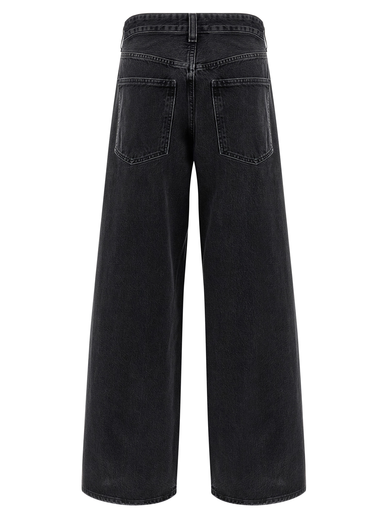 ‘Vana’ stonewashed cotton denim jeans with low crotch and wide leg, book closure with zip, hook and front button, five pockets.