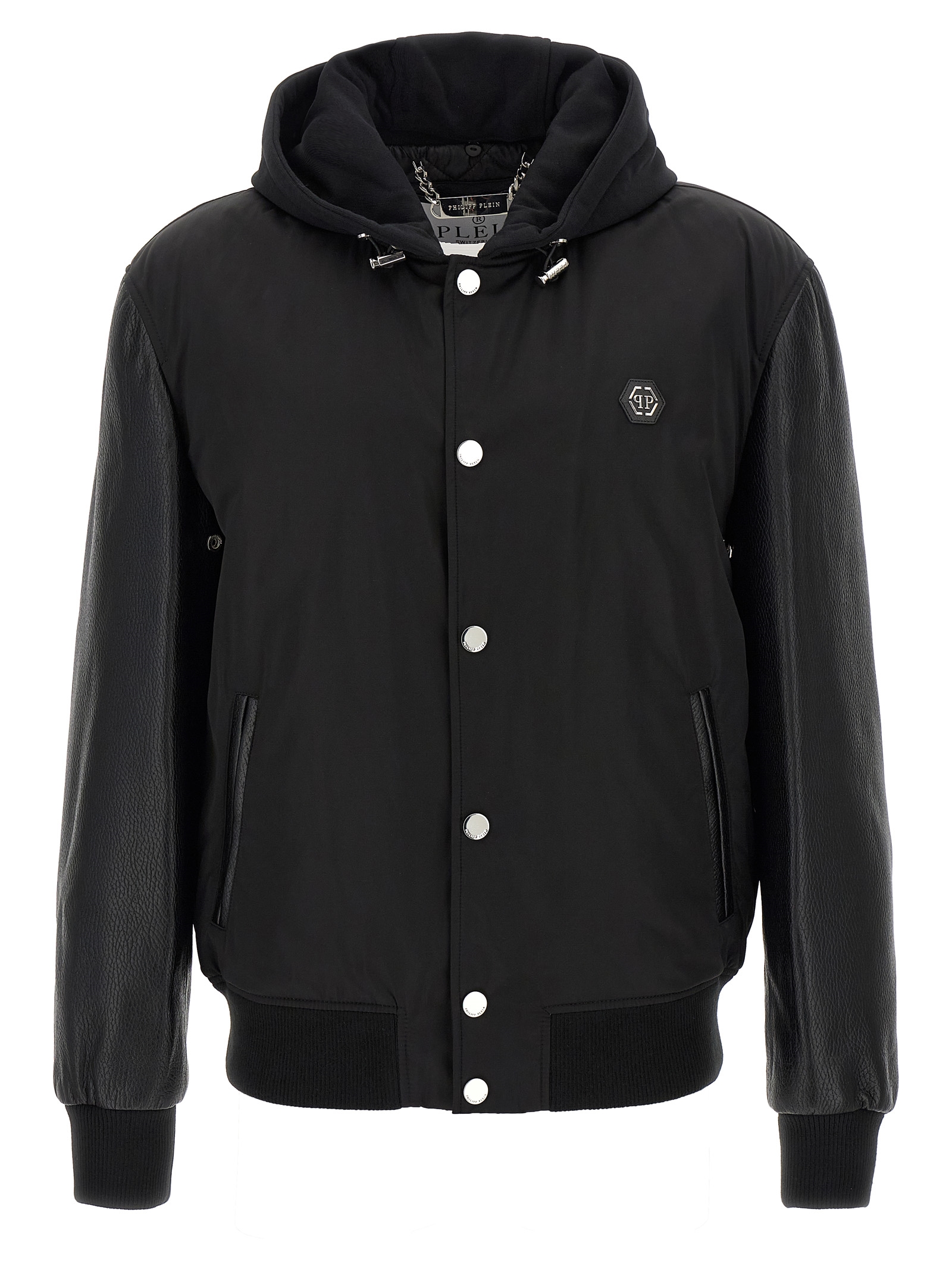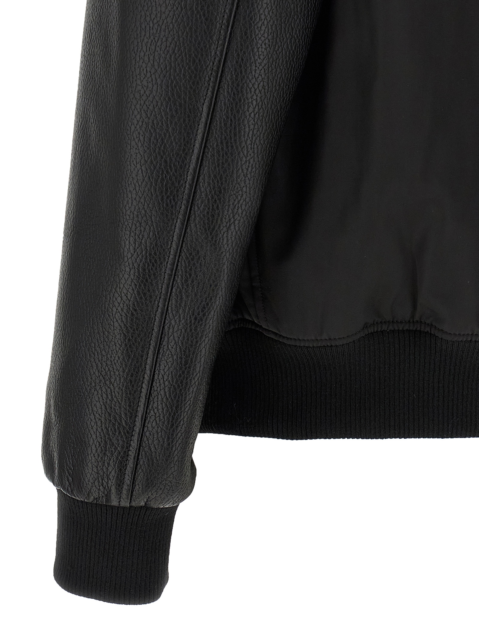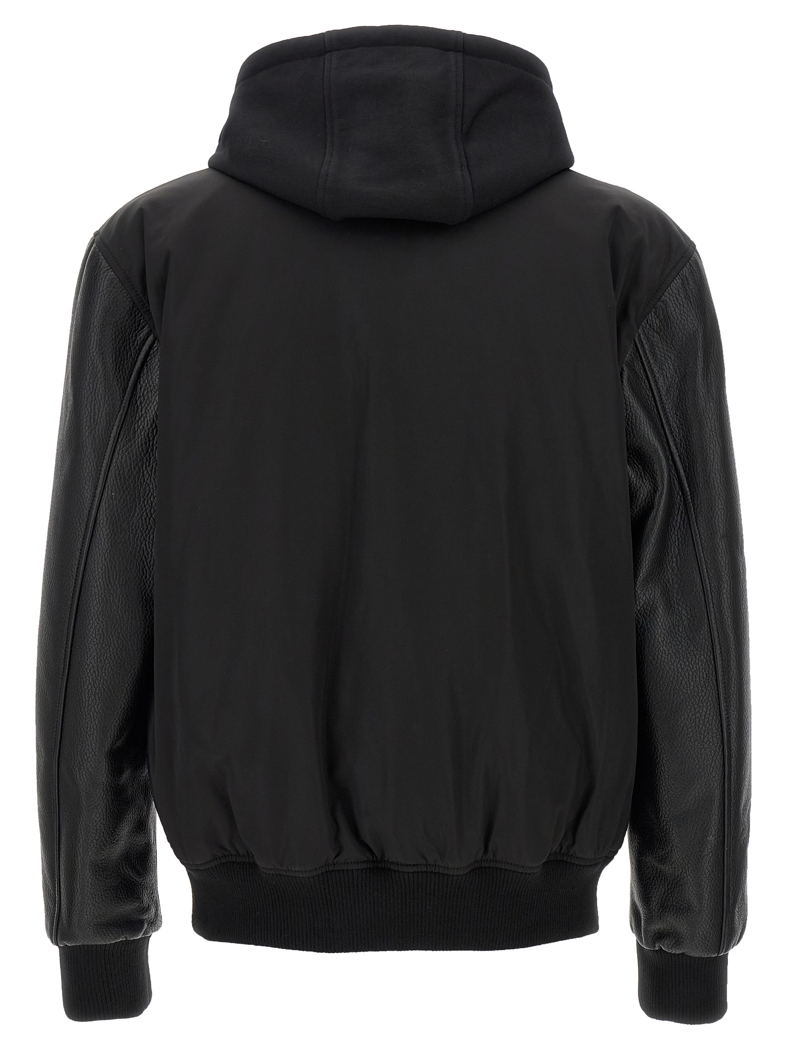 Varsity’ nylon fabric bomber jacket with ribbed stretch knit details, quilted and padded lining, adjustable and removable hood, Saffiano leather patch with metal logo and front snap button closure, pockets, long sleeves in deer-print leather with cuffs.