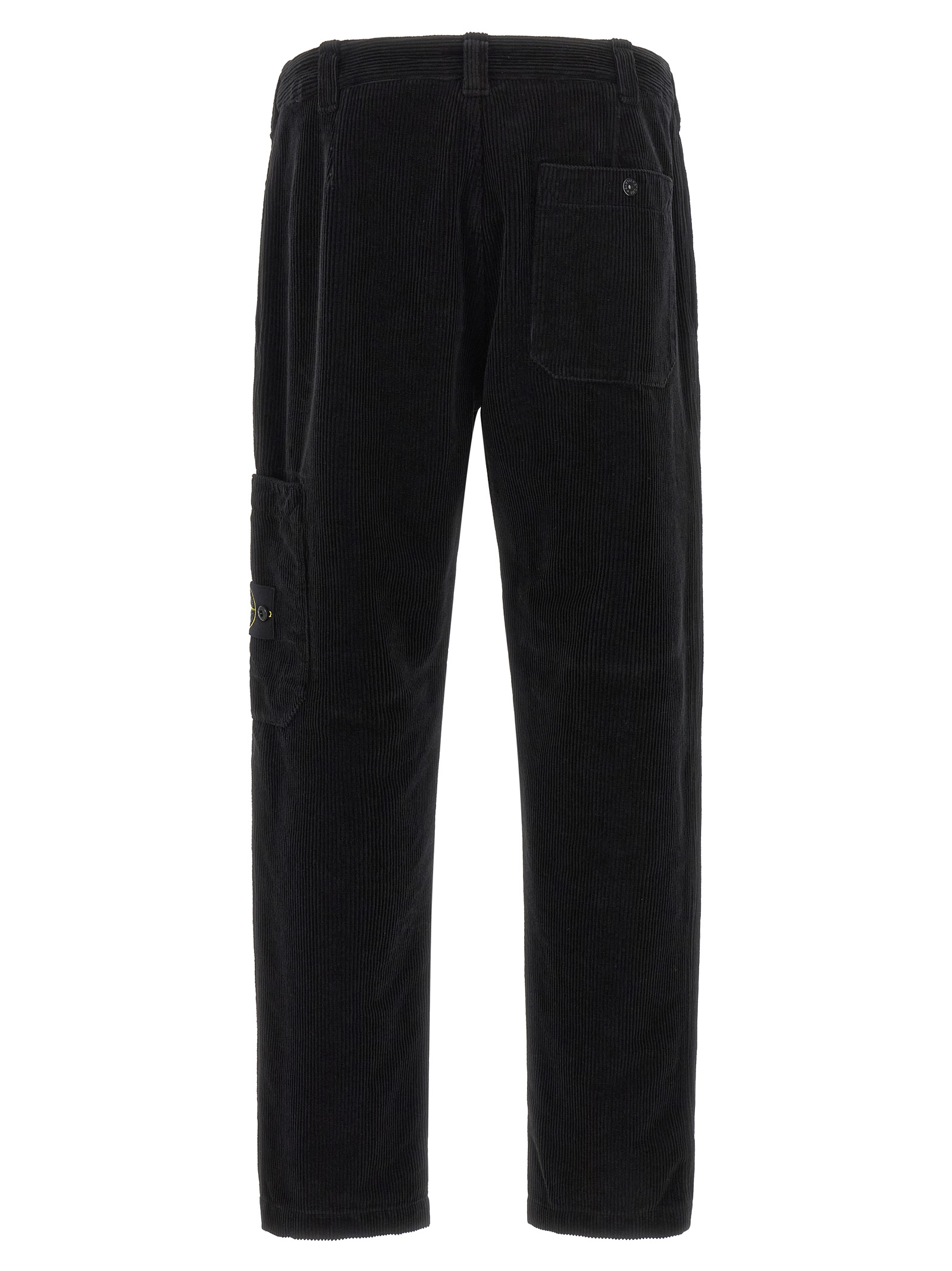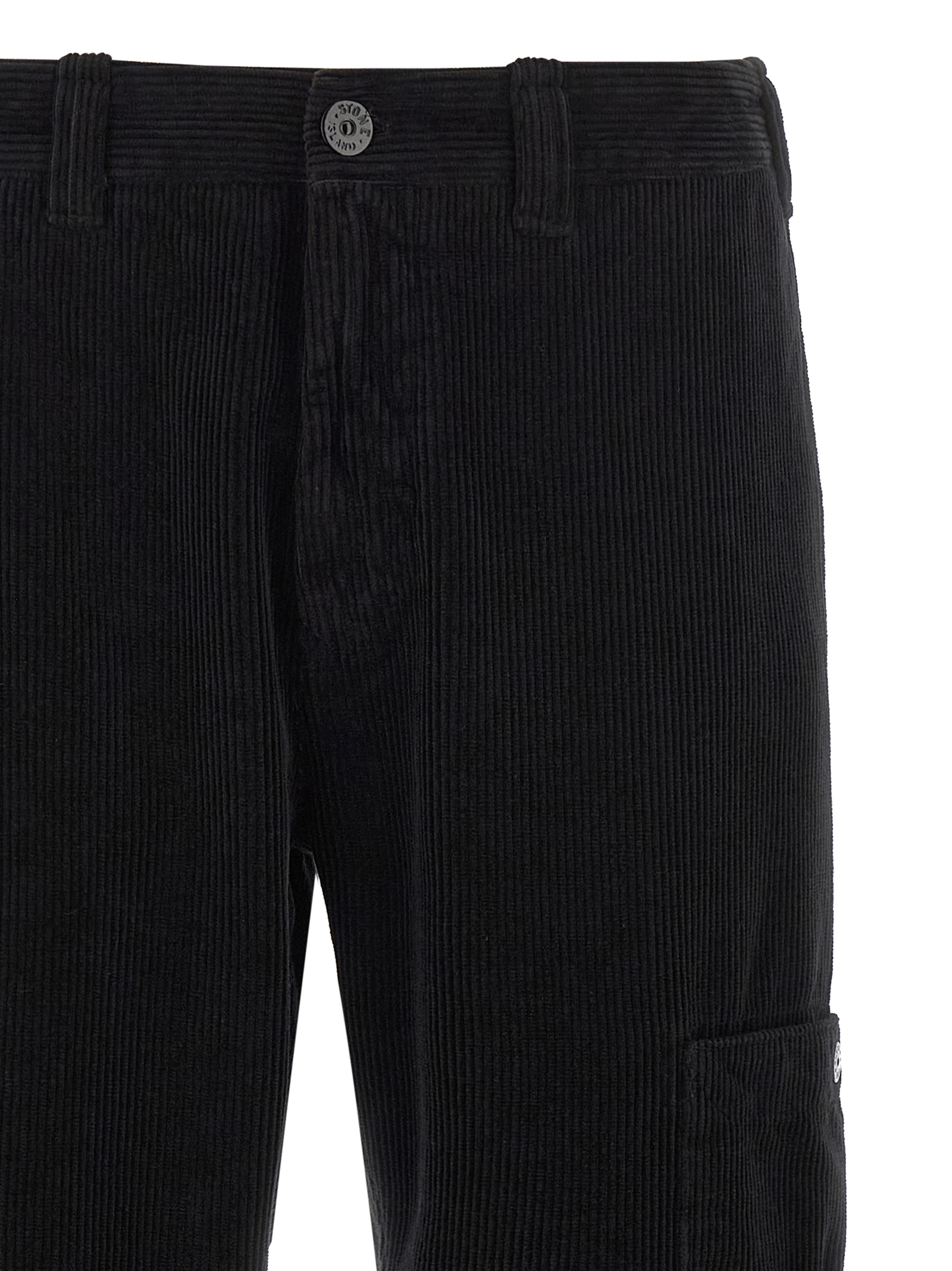 Heavy corduroy trousers, cargo pocket with logo badge, zip and front button closure, pockets, straight leg.
