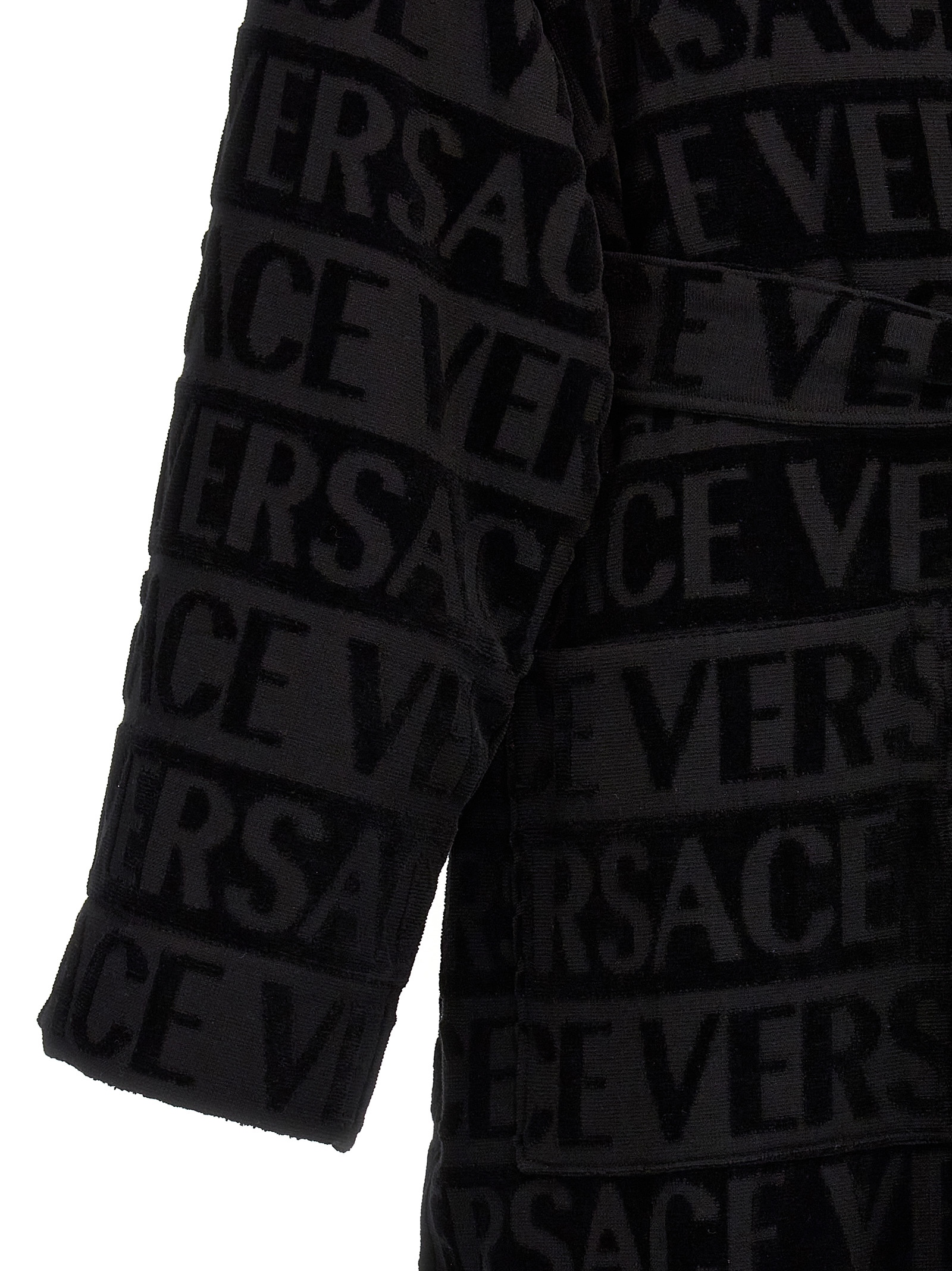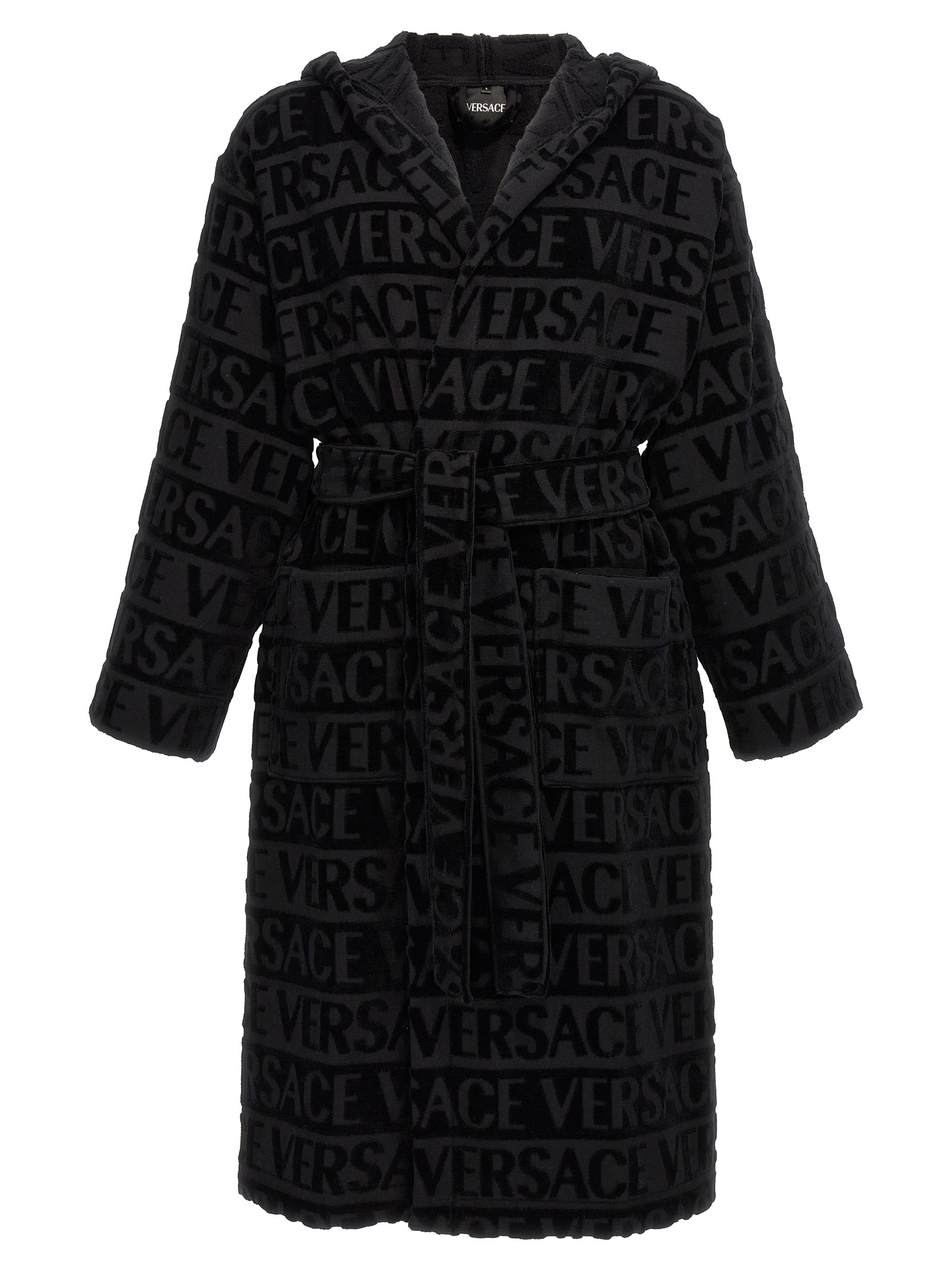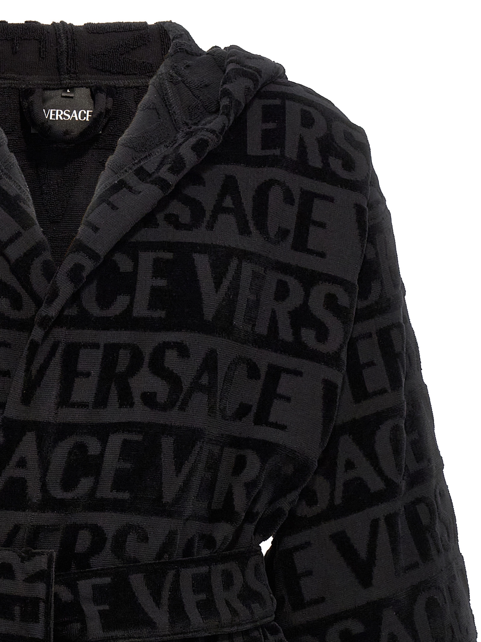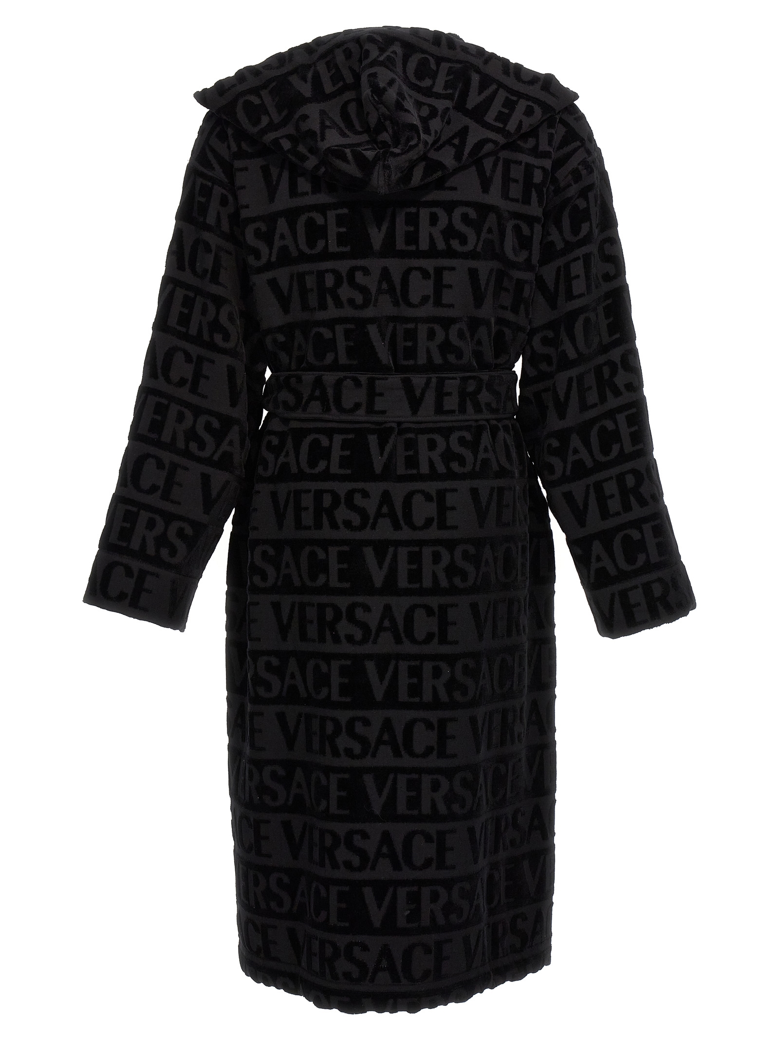 Cotton terry bathrobe with jacquard ‘Versace Allover’ pattern, hood, pockets and belt at the waist.