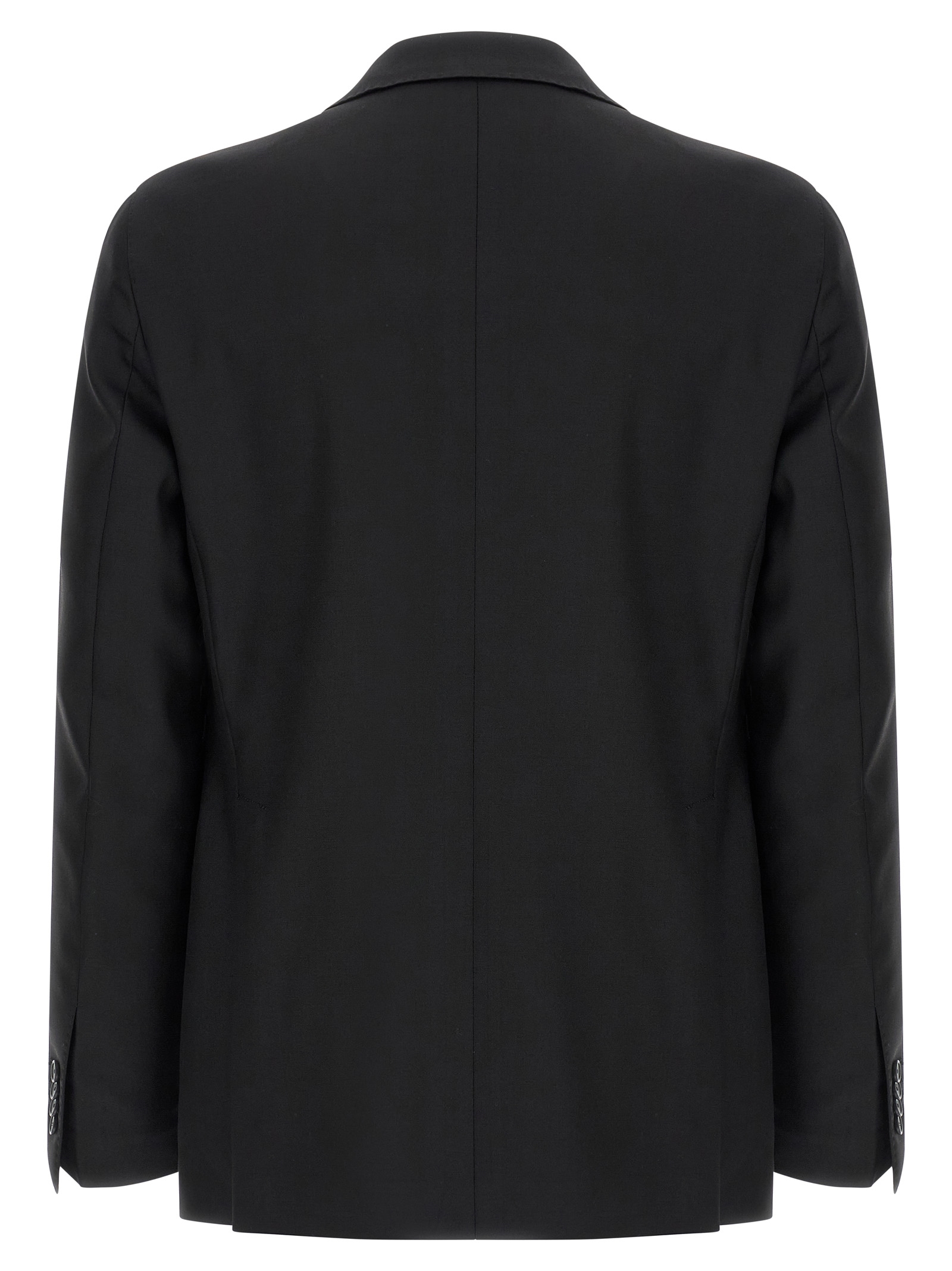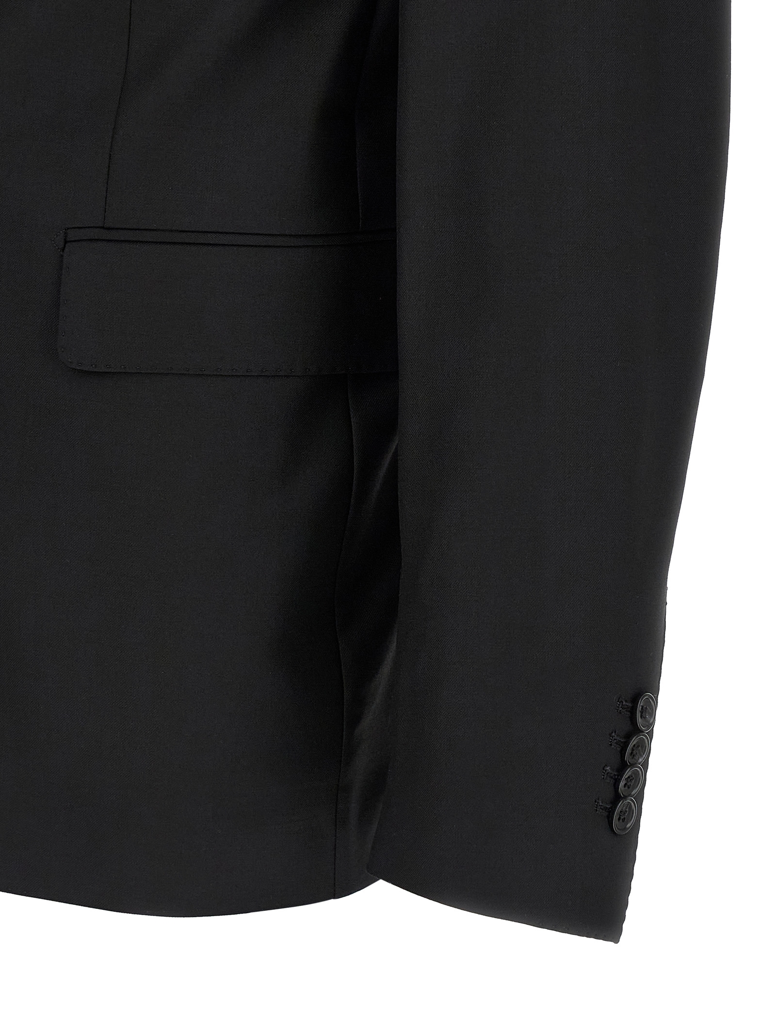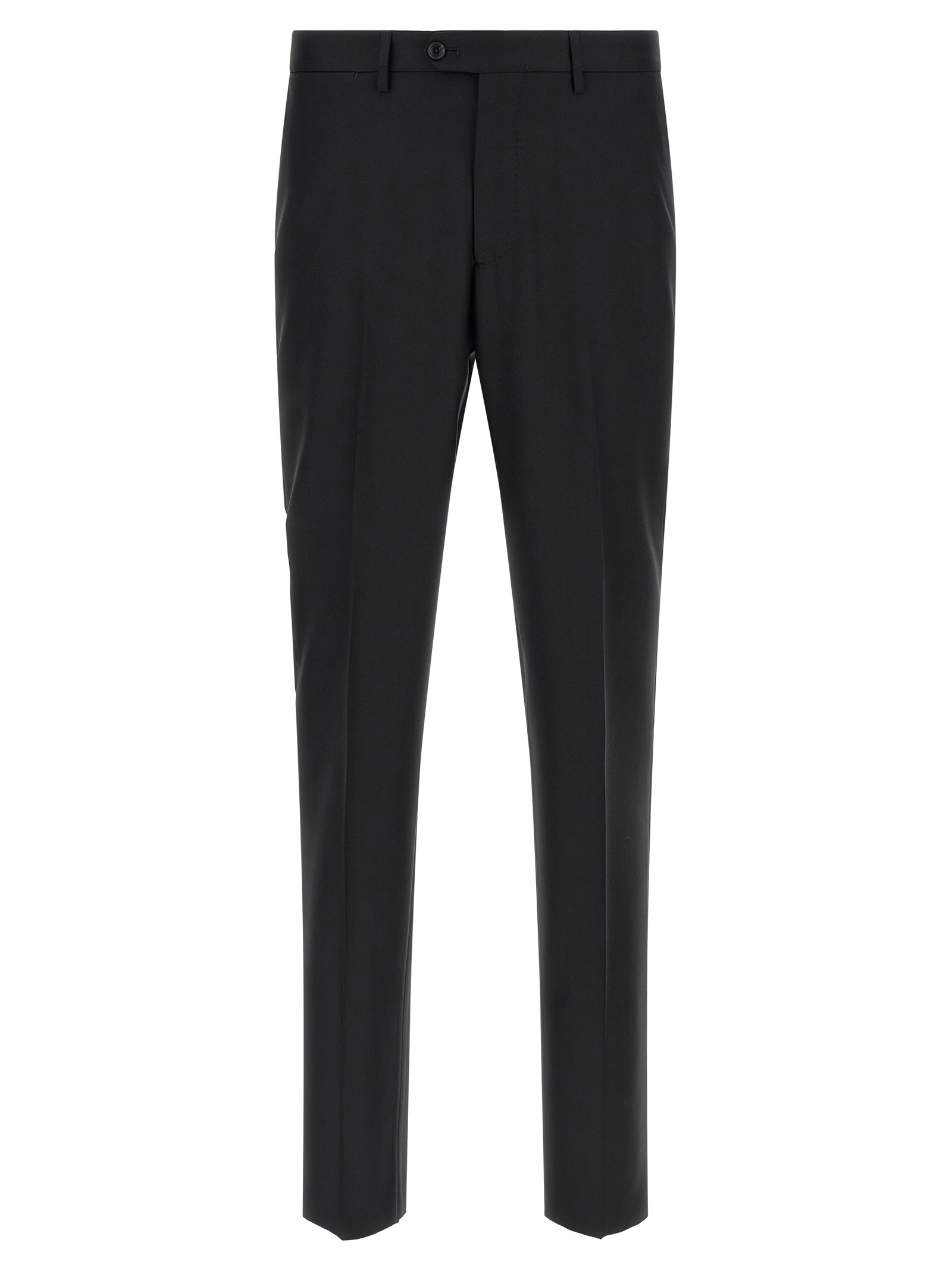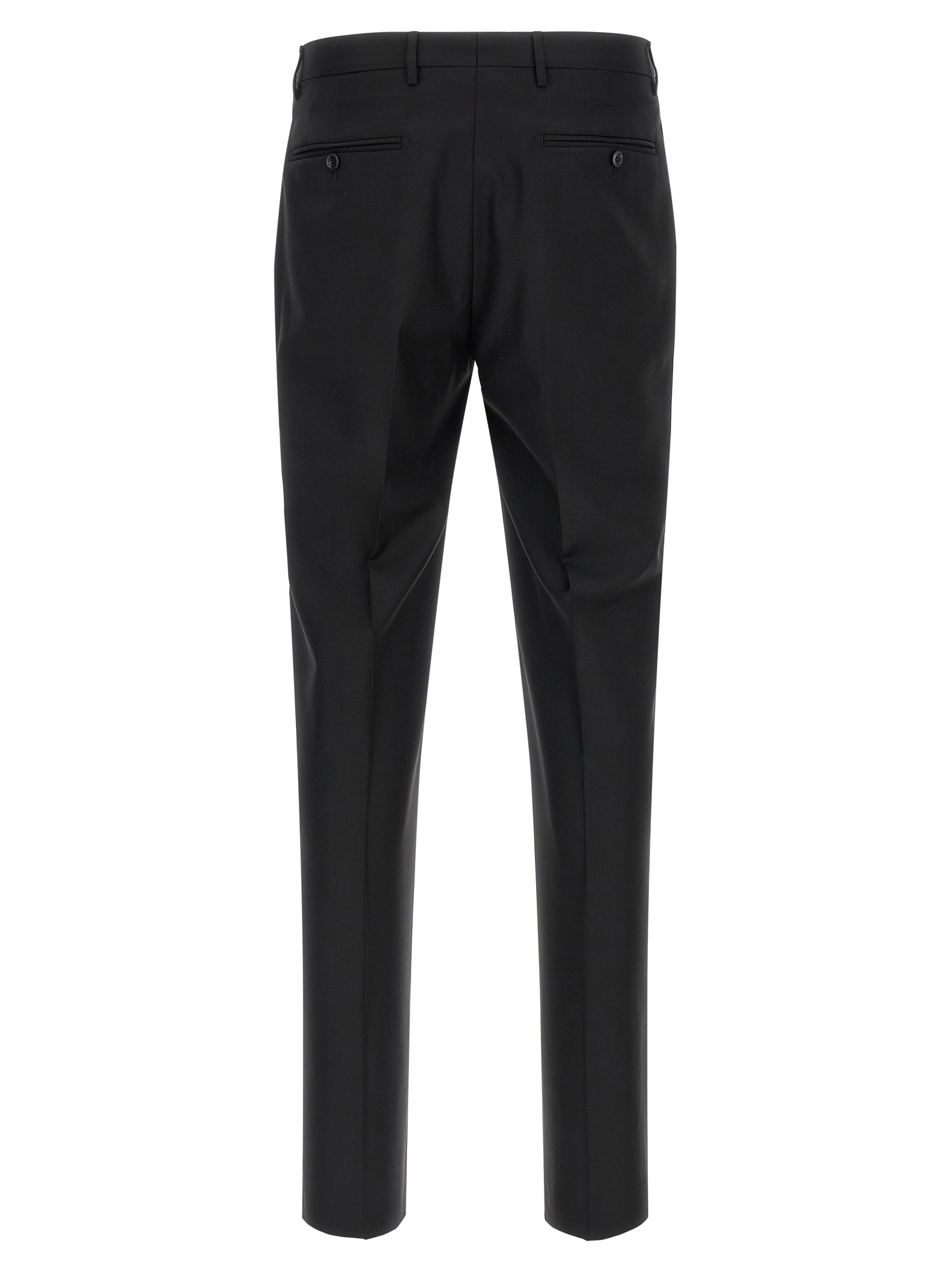 Super 110’s virgin wool Vesuvio dress consisting of single-breasted blazer with front button closure, mirror lapels with removable metal brooch, breast pocket, flap pockets, cupro lining, two inner pockets, buttonhole cuffs, back slits and pressed pleat trousers, front ‘americane pockets’, back welt pockets, front zip and button closure, cotton lining.