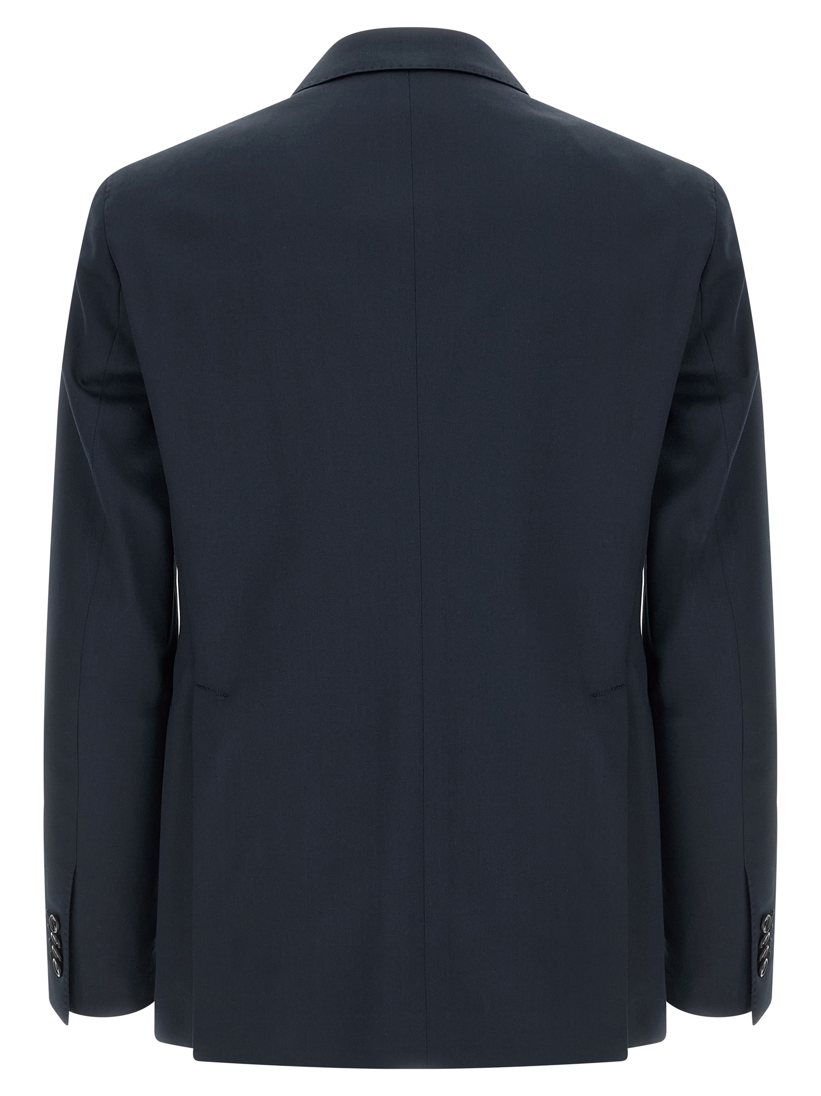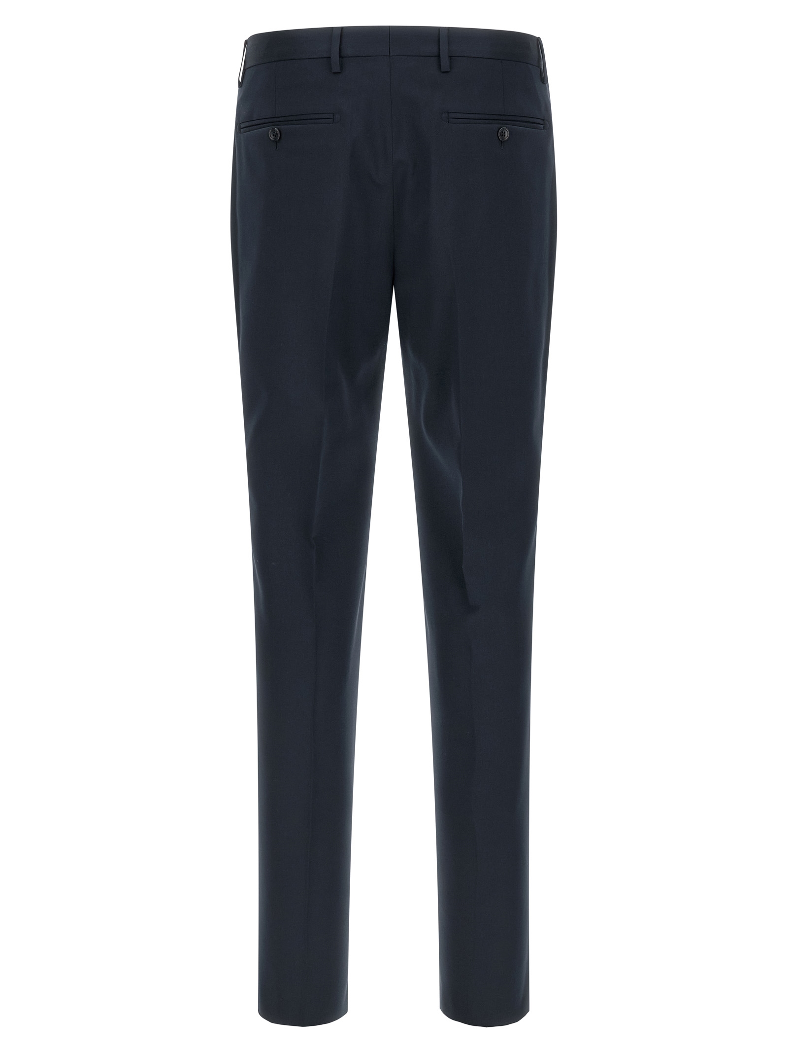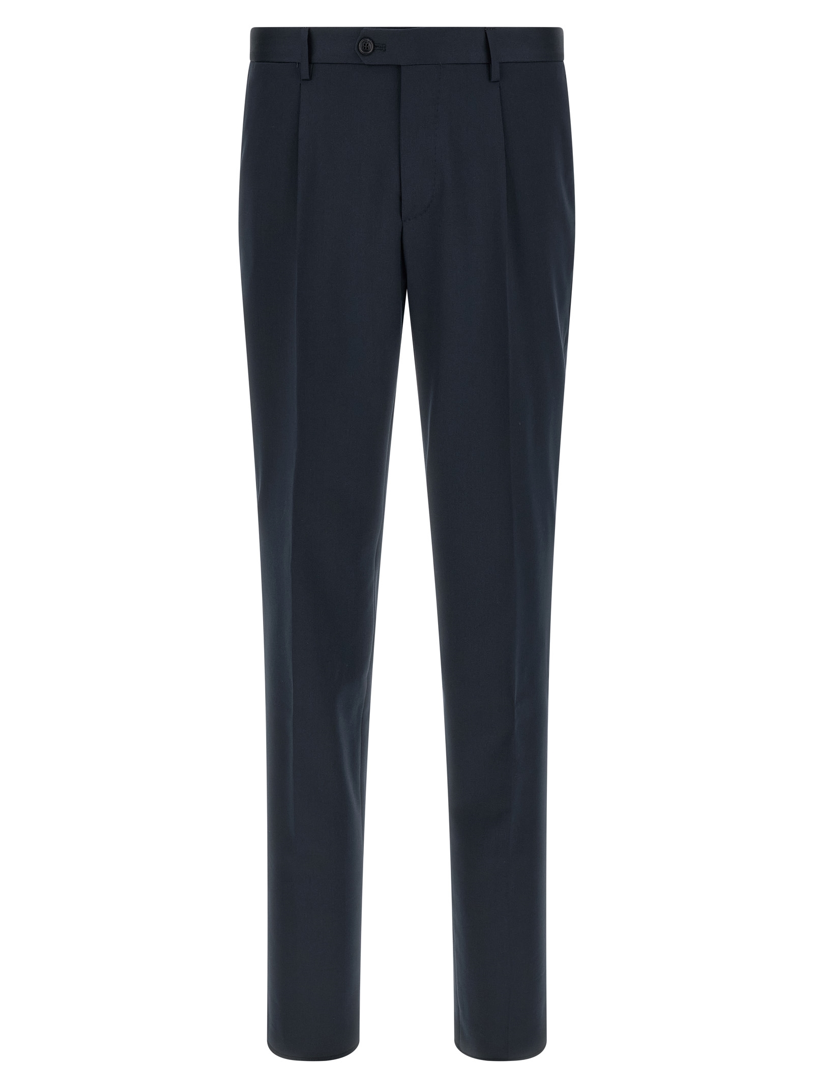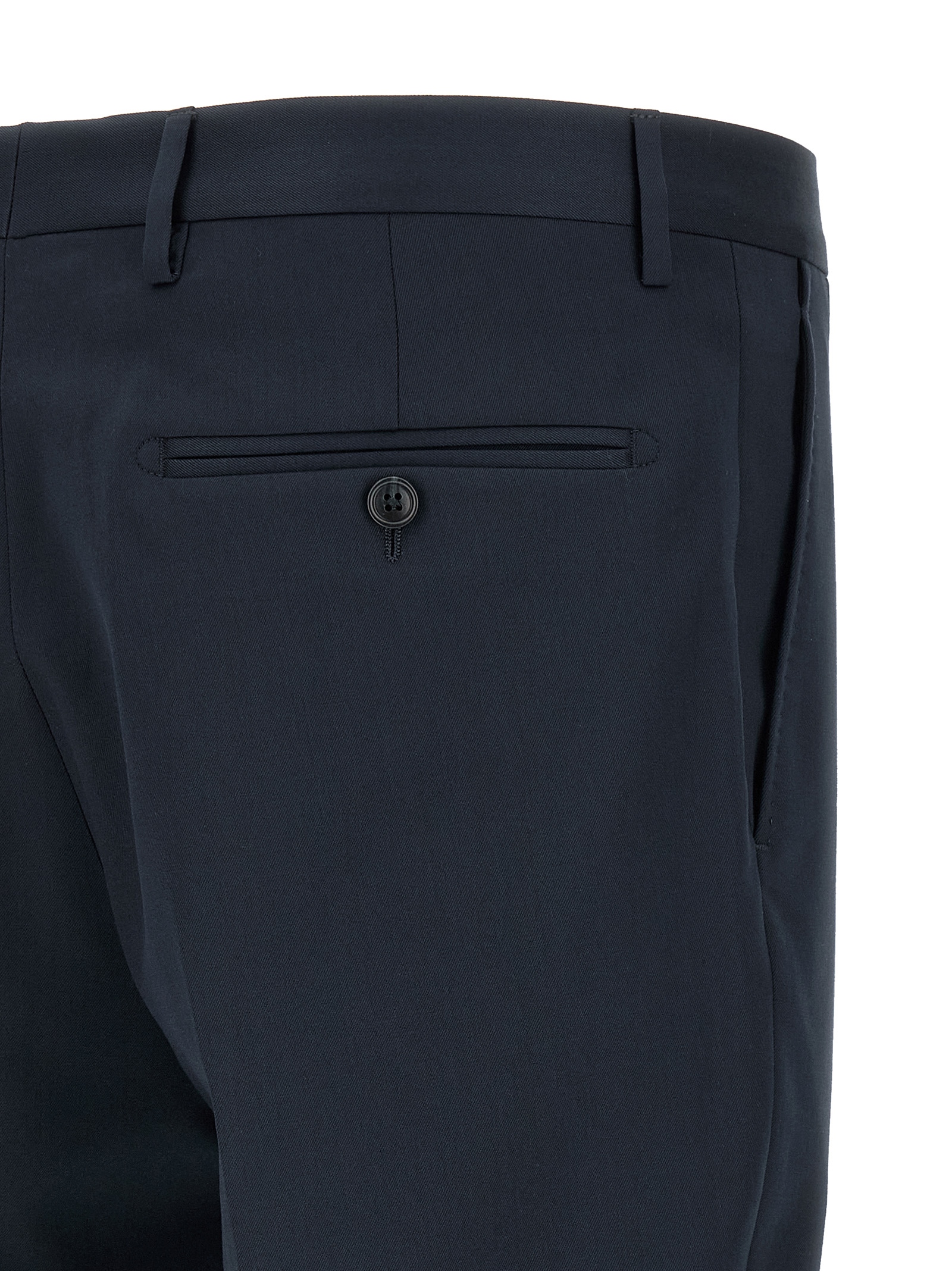 ‘Vesuvio’ virgin wool and cotton blend dress consisting of single-breasted blazer with front button closure, peak lapels with removable metal brooch, breast pocket, flap pockets, cupro lining, two inner pockets, cuffs with open buttonholes, back slits and trousers with stretched pleat, front ‘americane pockets’, back welt pockets, front zip and button closure, cotton lining.