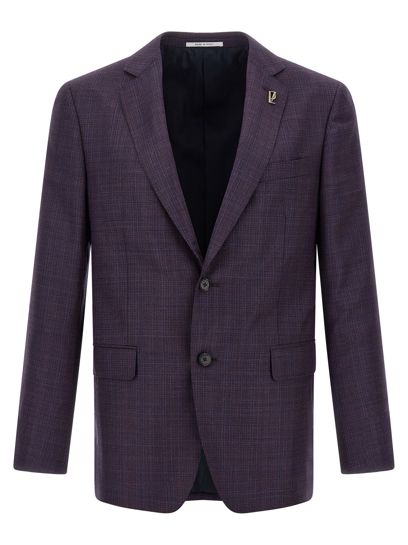 Prince of Wales patterned wool Vicenza single-breasted blazer with front button closure, mirror lapels with removable metal brooch, breast pocket, patch pockets, two inner pockets, buttonhole cuffs, back vents, cupro lining.