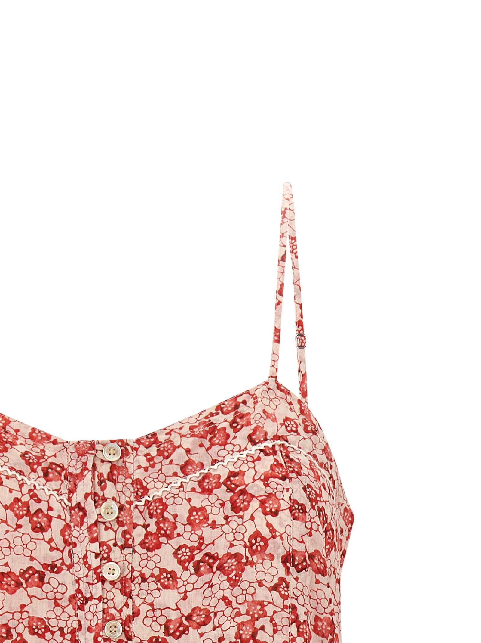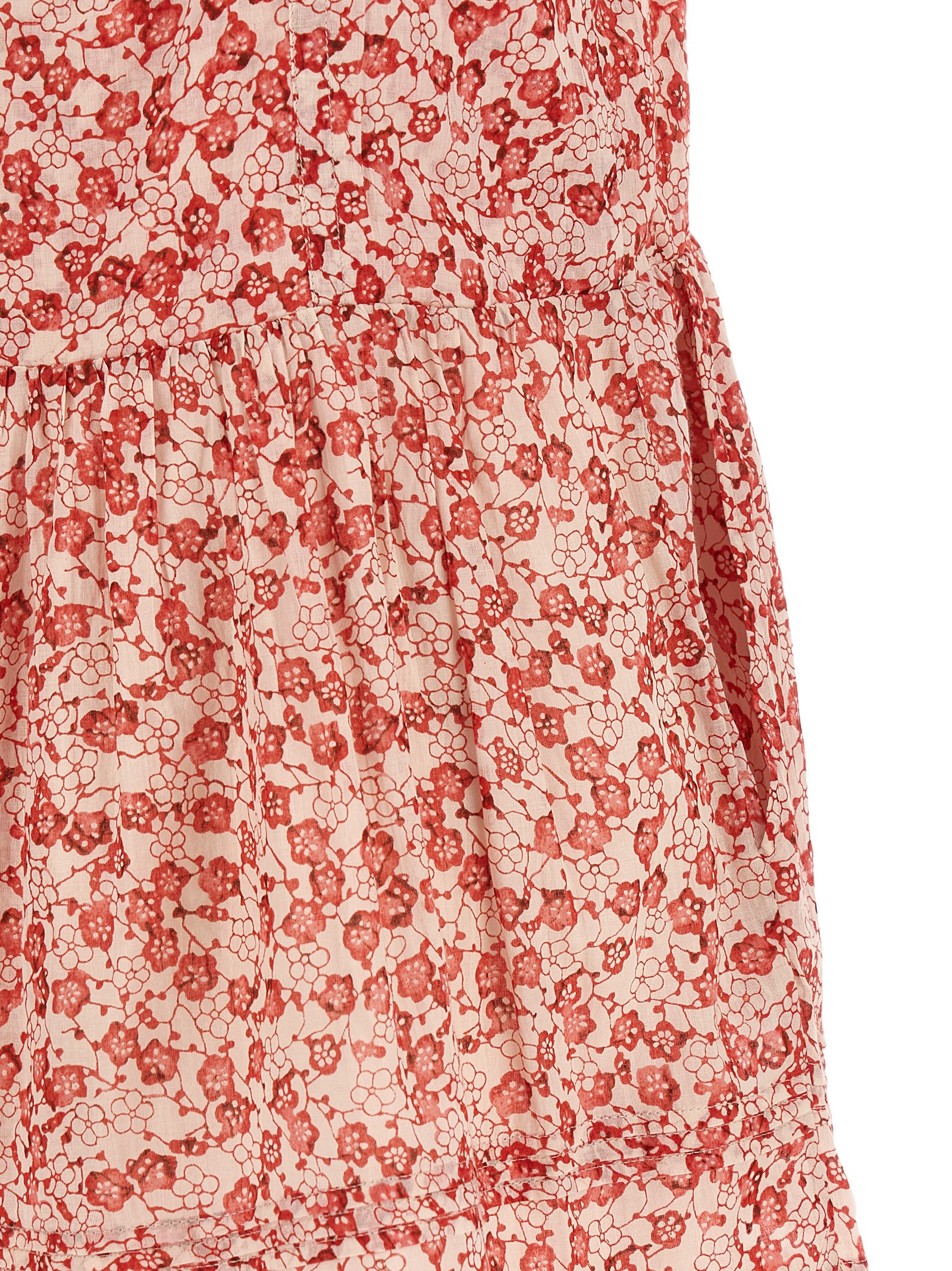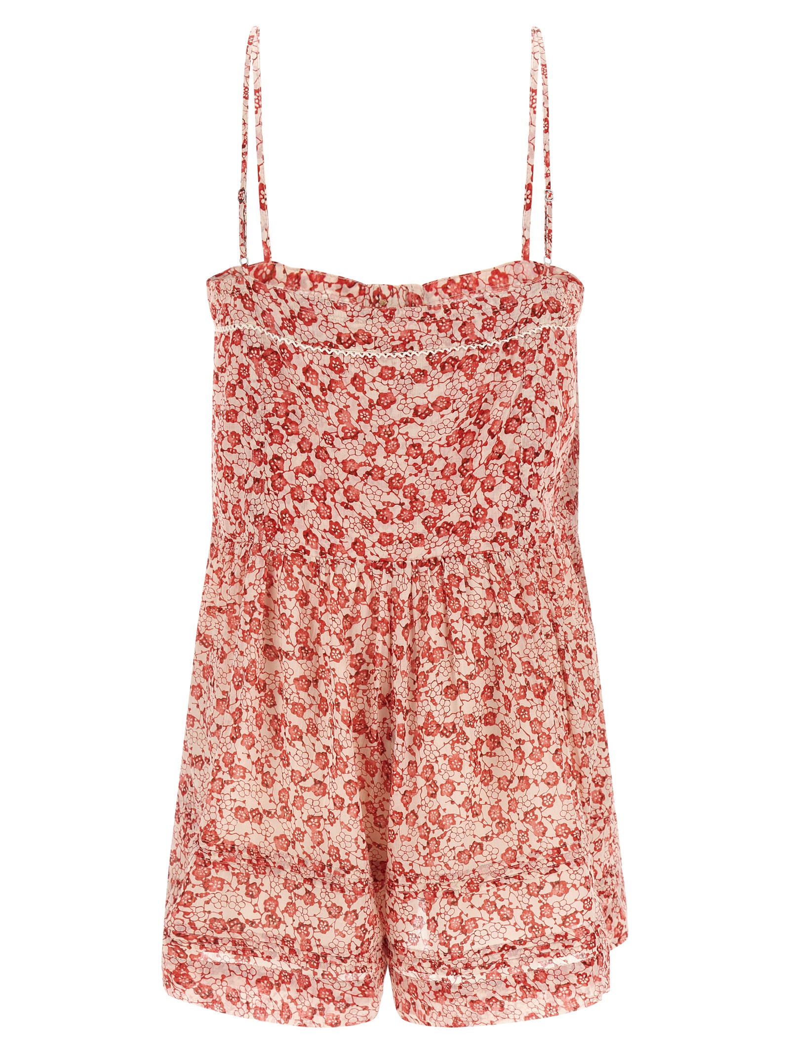 Mini ‘Vickia’ cotton jumpsuit with all-over floral print, adjustable thin straps, lace insert on the neckline, front button closure, curled waist with side pockets.