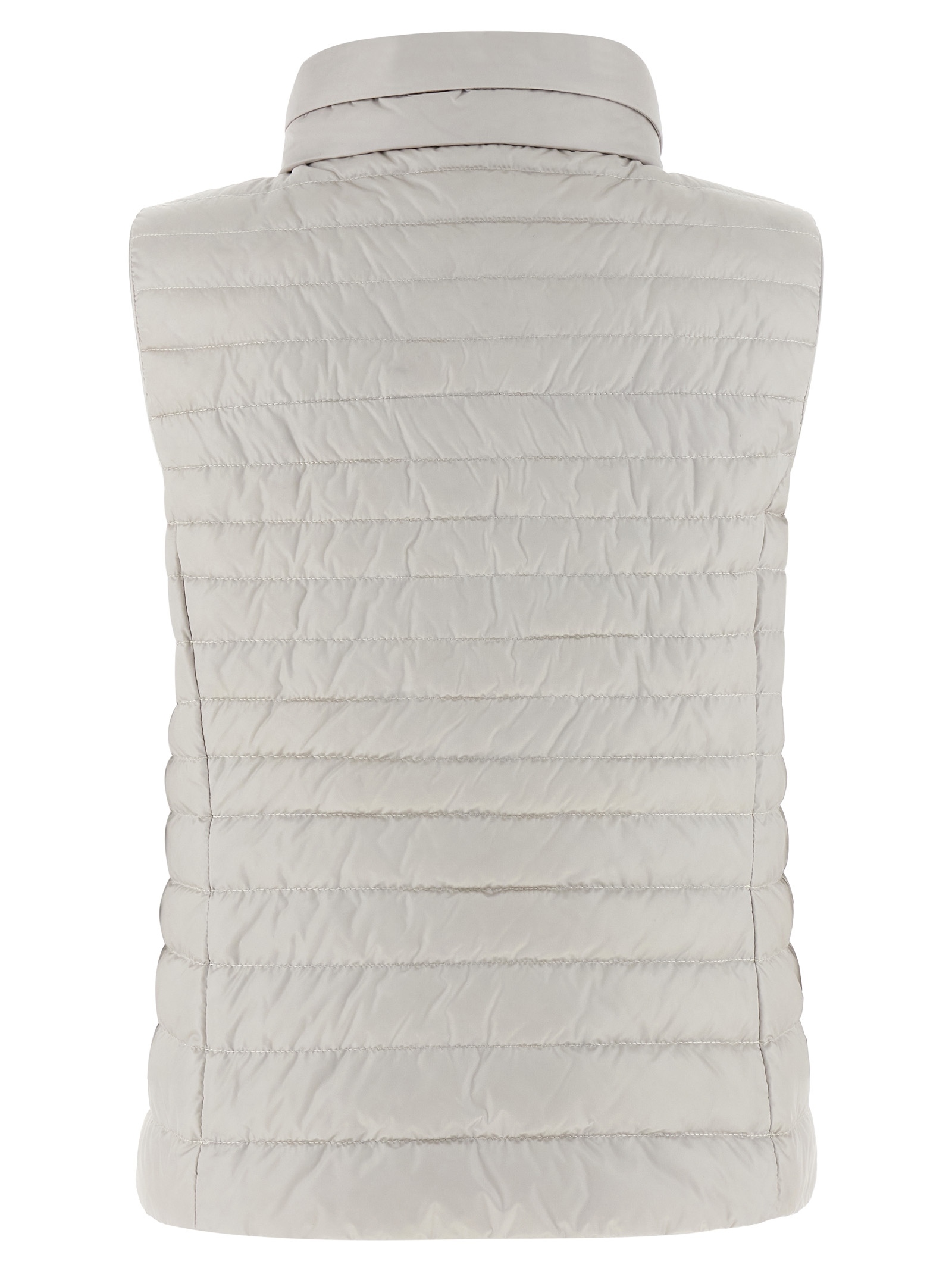 ‘Villan’ vest in polished technical fabric quilted and goose feather padding, standing collar with removable hood, front zip closure, pockets.