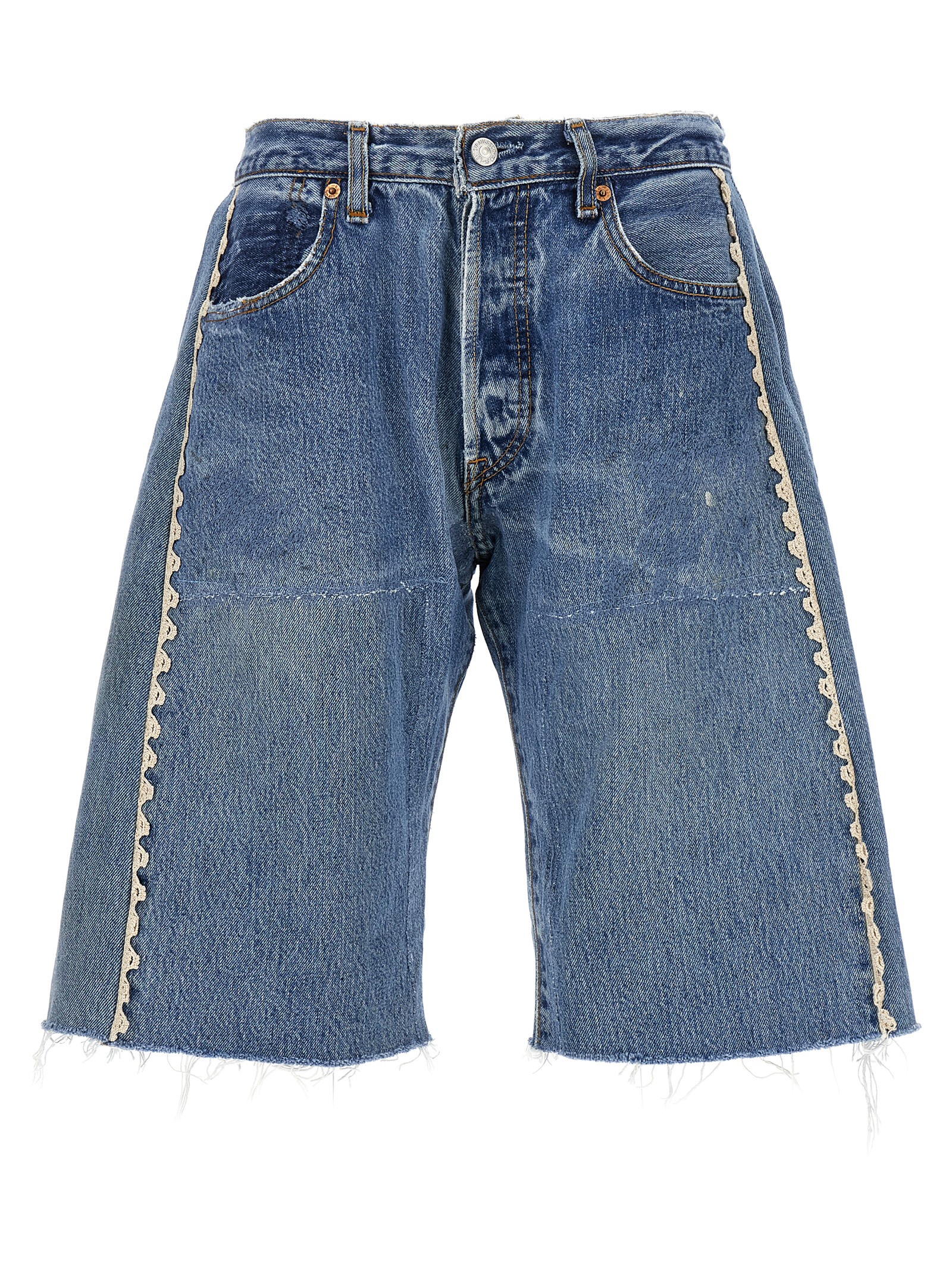 Cotton denim โVintage Lassoโ Bermuda shorts, hand-knit lace inserts, front button closure, five pockets, frayed hem, curved leg, back salpa.
