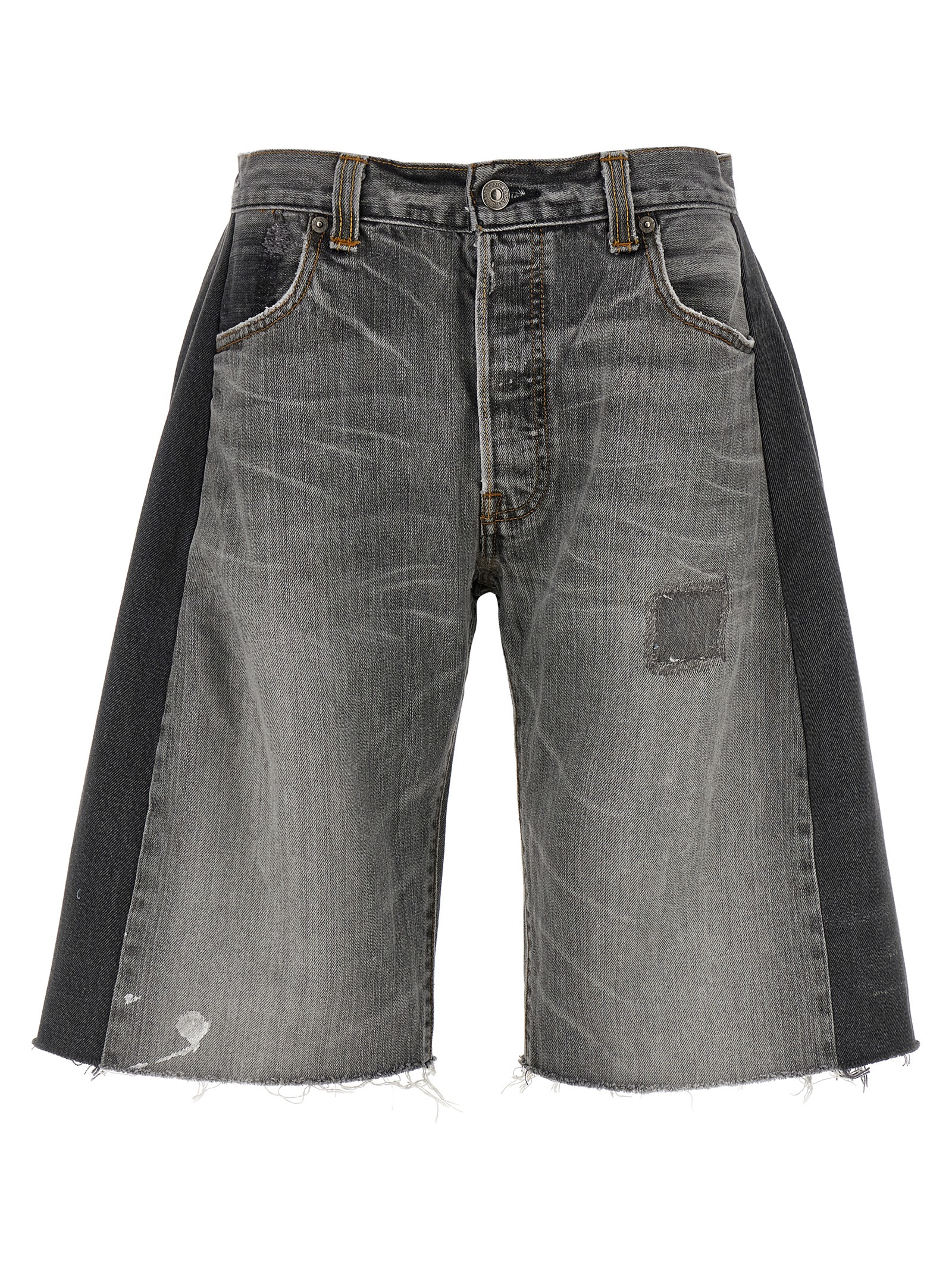 ‘Vintage Lasso’ upcycled cotton denim bermuda shorts with contrast side inserts, button closure, five pockets, frayed hem.