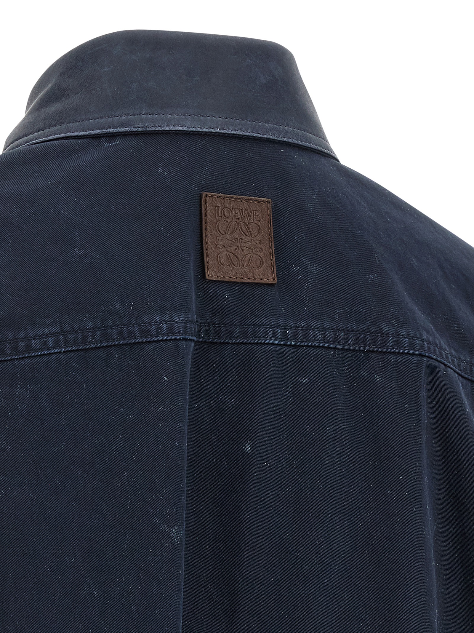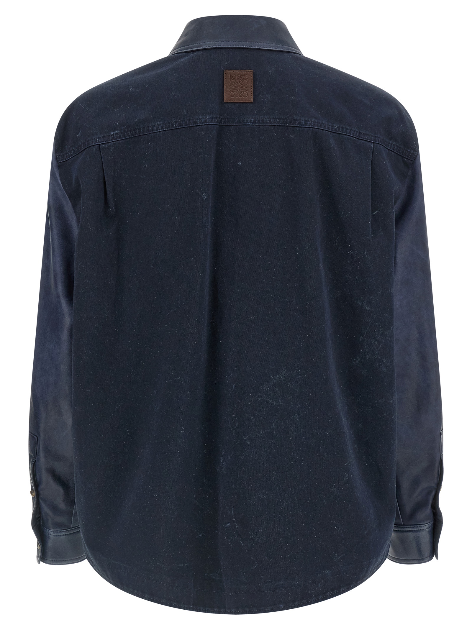 Overshirt with light vintage-effect lamb nappa leather front and light washed cotton twill back, front button closure, pockets, long sleeves with cuffs and dropped shoulders, leather patch with embossed ‘Anagram’ logo on the back, rounded hem, lining.