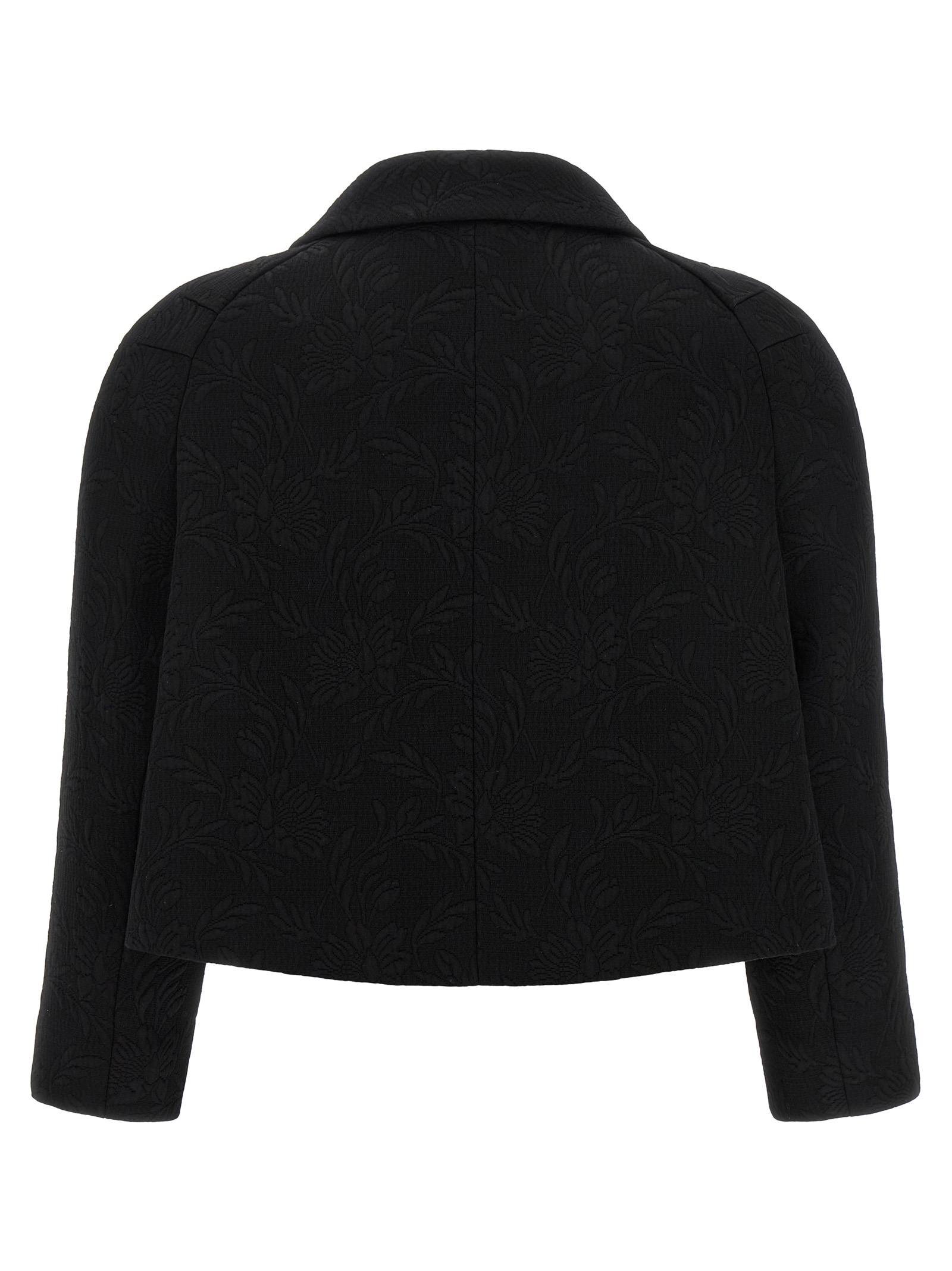 ‘Vipa’ blazer in viscose and cotton blend with tone-on-tone floral stitching, double-breasted bolero style with maxi jewel button closure at the front, shirt collar, long sleeves, lining.