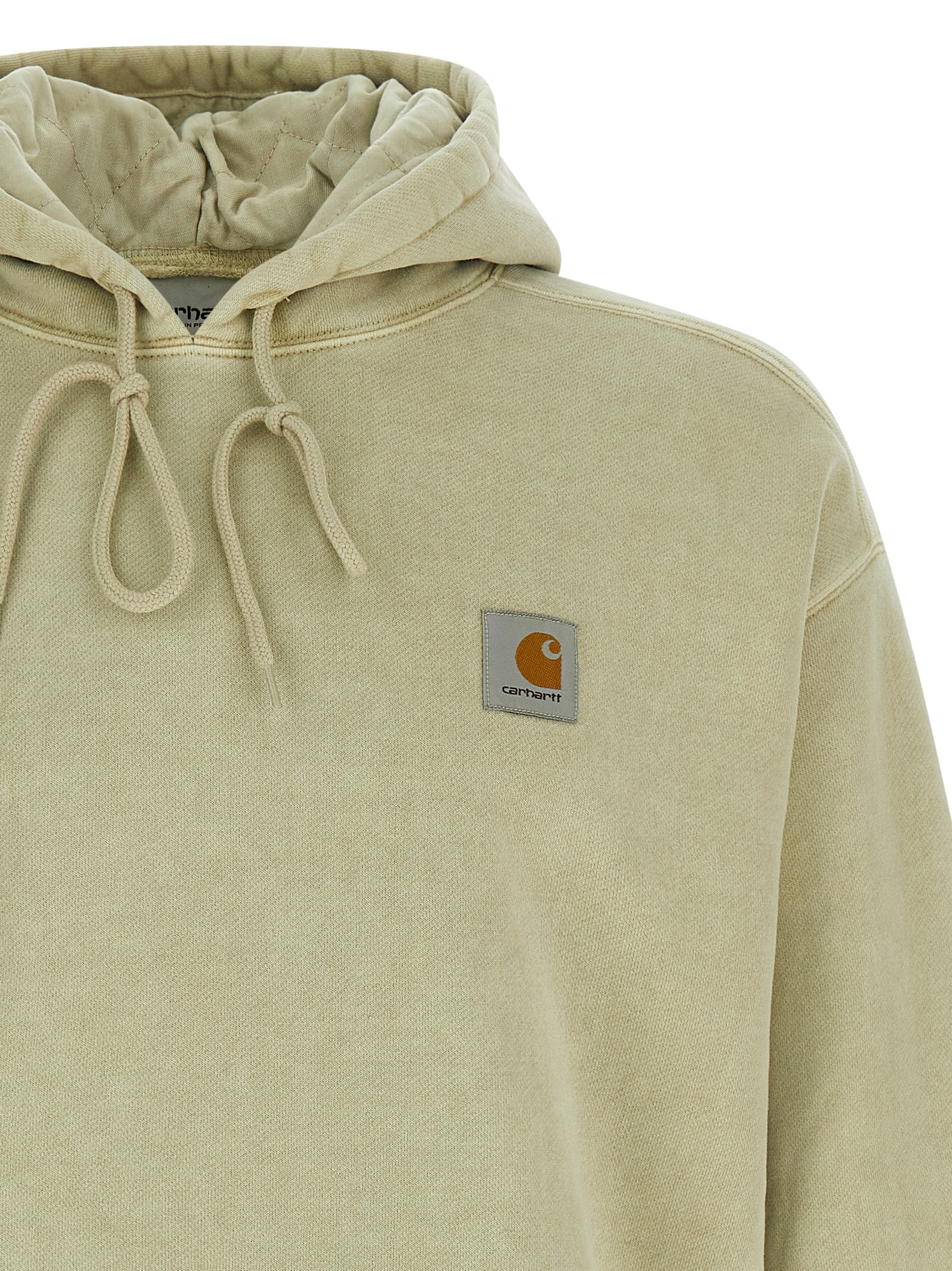 ‘Vista’ slightly washed cotton hoodie with front logo patch, kangaroo pocket, long cuffed sleeves and dropped shoulders.