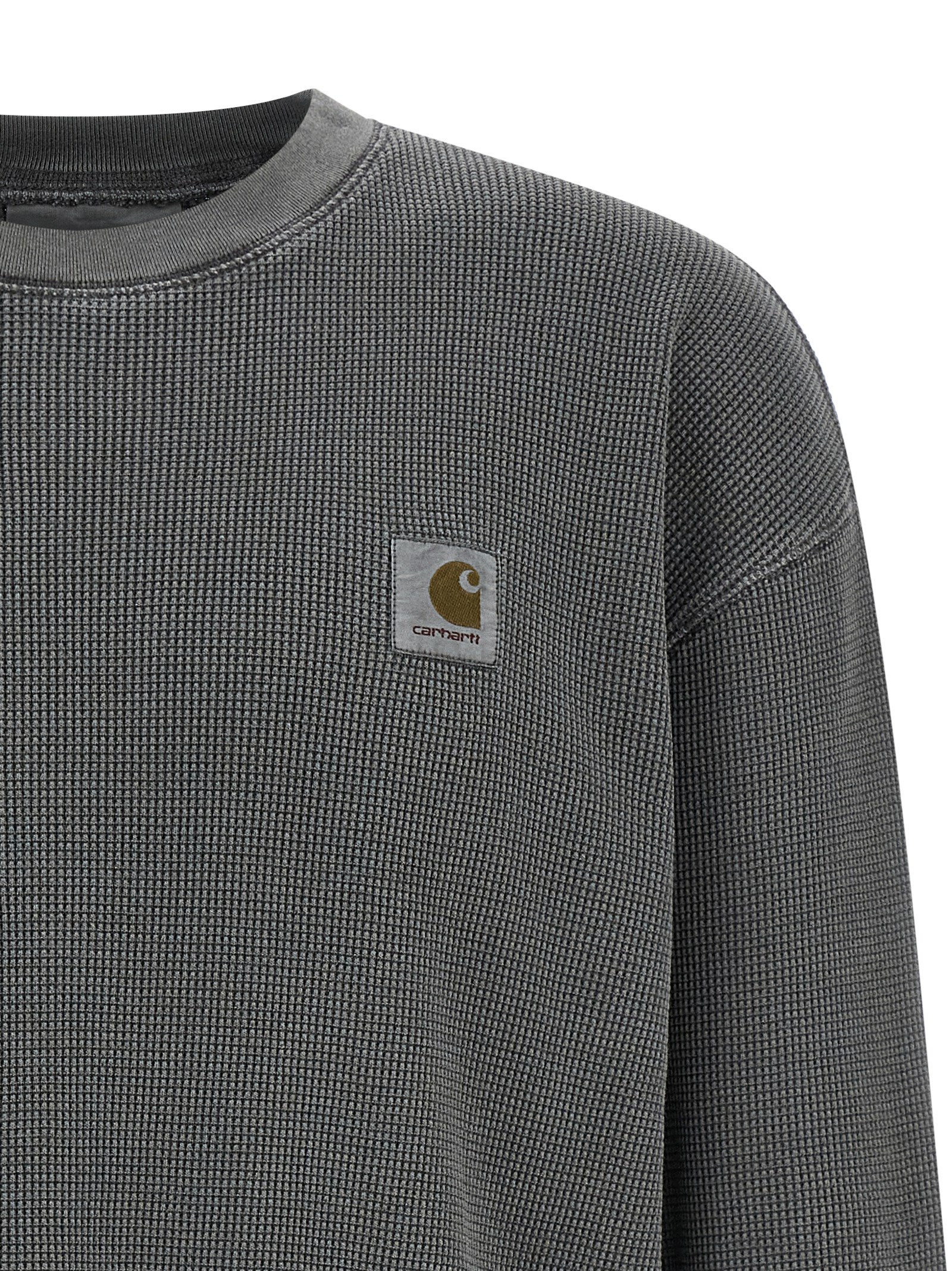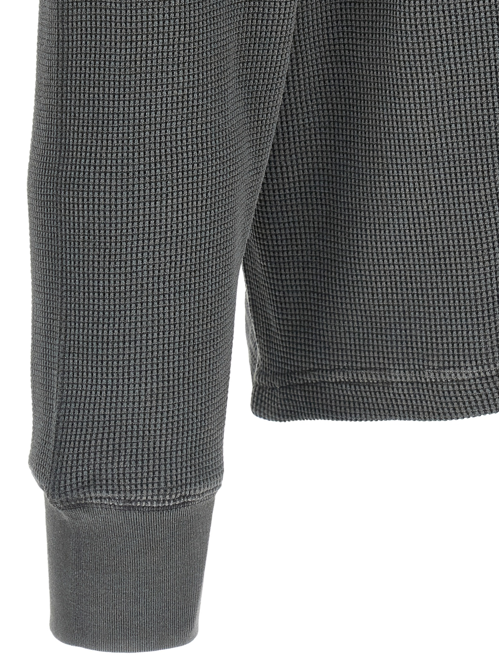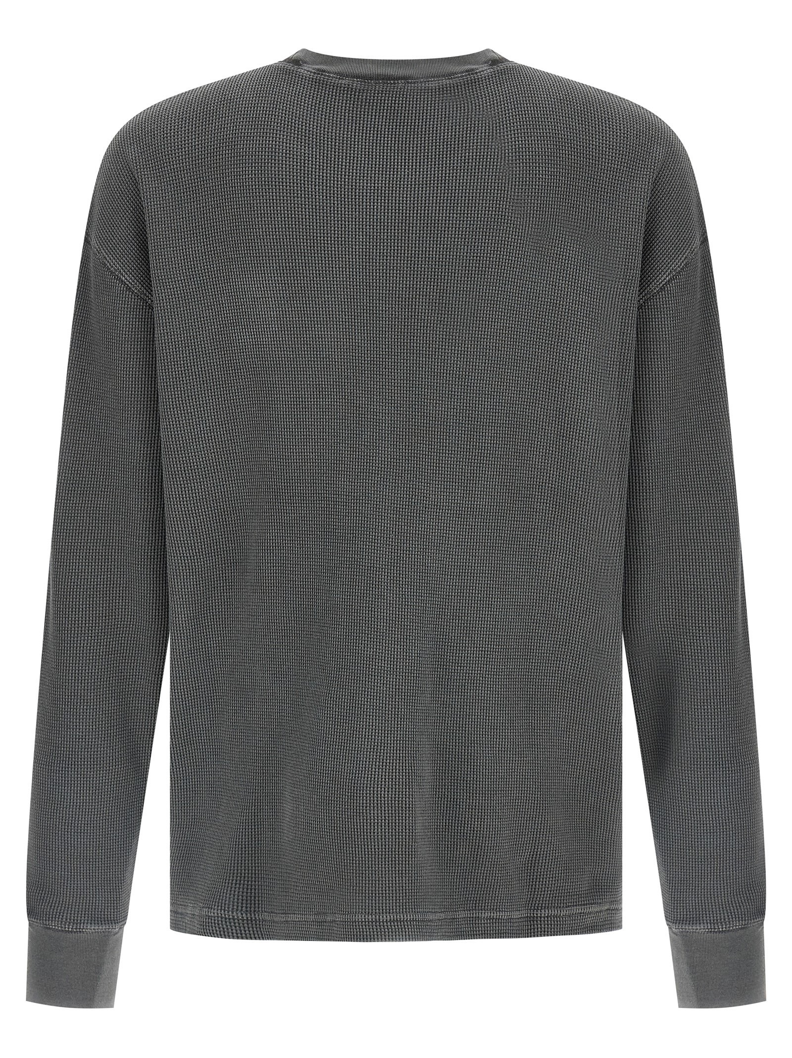 ‘Vista Waffle’ heavy cotton waffle fabric T-shirt dyed on the front, front logo patch, crew neck, long cuffed sleeves and dropped shoulders.