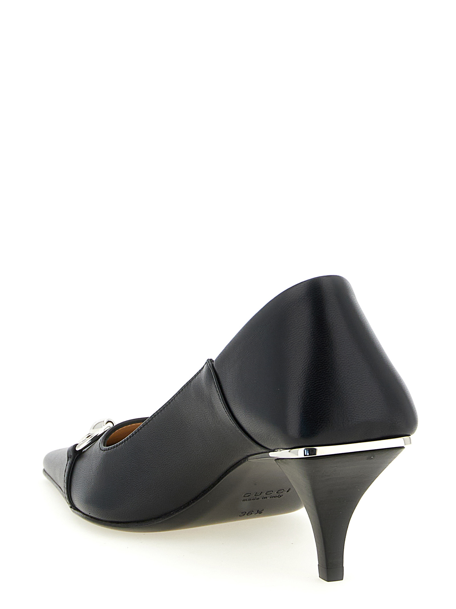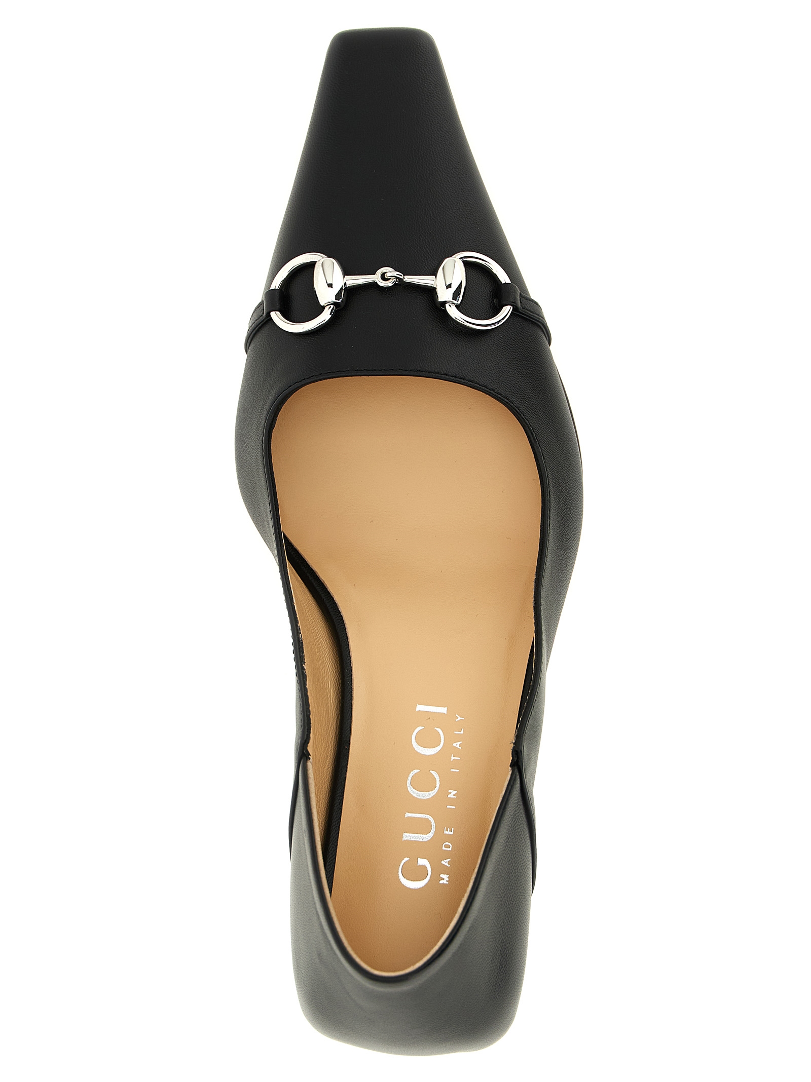 Nappa Vittoria pumps with elongated square toe cap with front metal ‘Morsetto’ detail, leather wrapped cone heel with metal tag, foldable heel, leather sole.