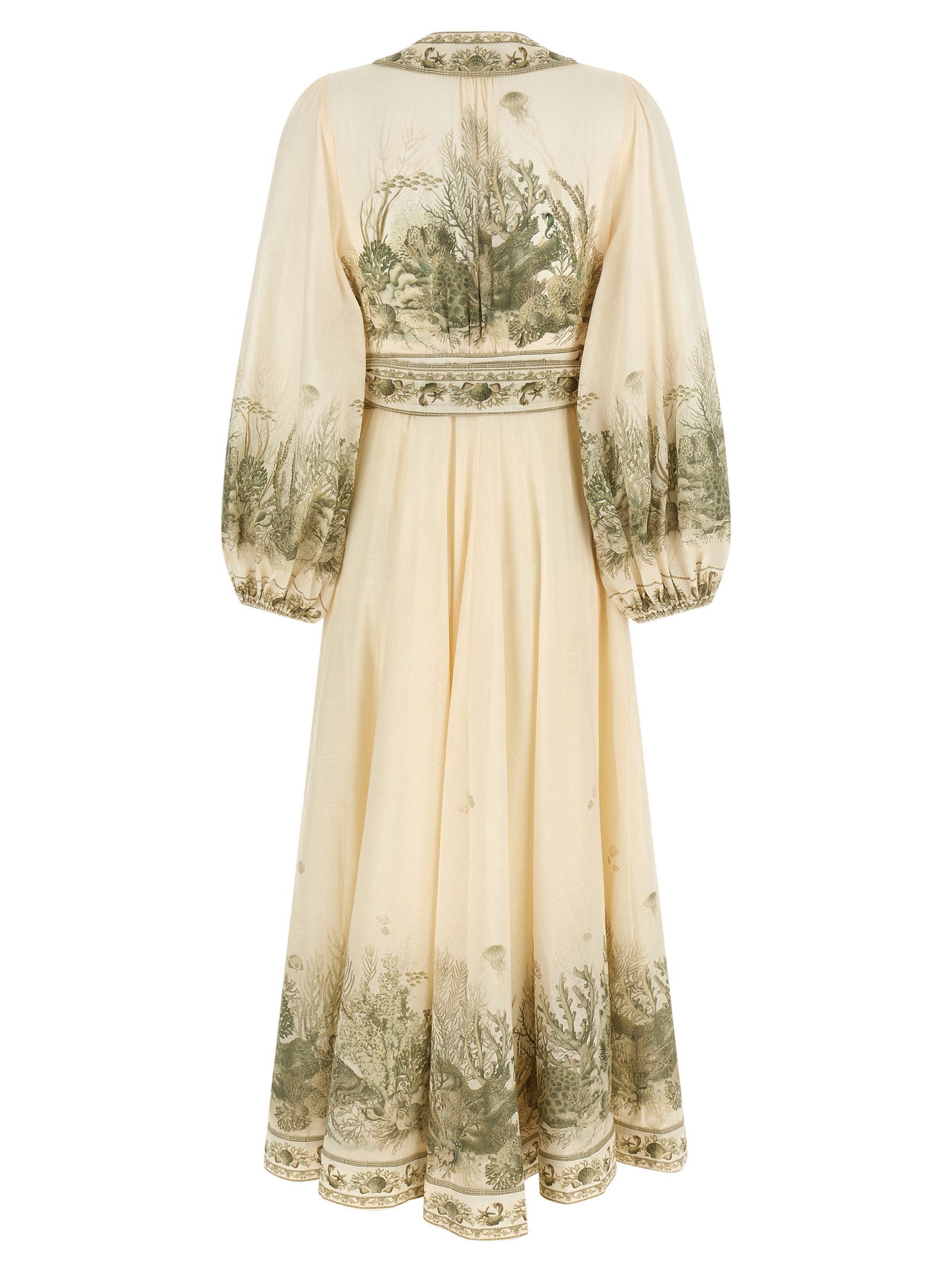 ‘Wanderlust Wrap Midi’ all-over Toile print cotton dress, wallet style with belt to tie at the waist, deep V-neck, long puff sleeves with elastic cuffs.