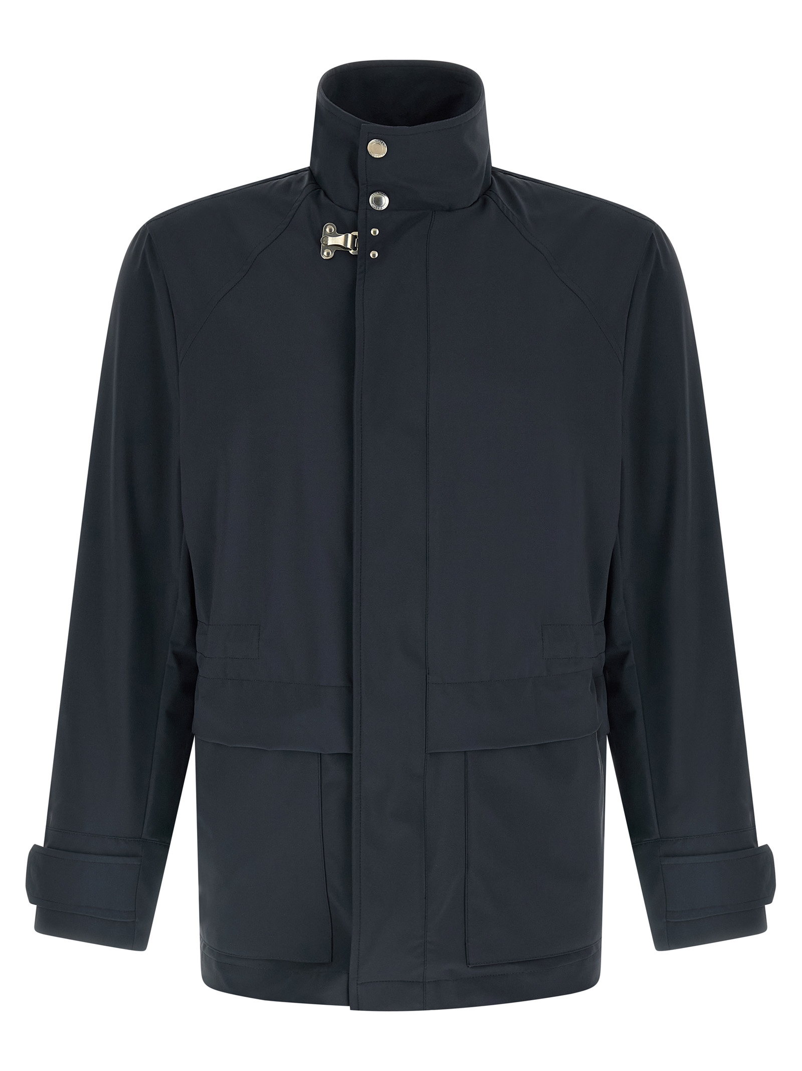 Windbreaker in waterproof technical fabric with lining, high neck, front zip and snap button closure, pockets, drawstring at the waist, long sleeves with cuffs, back slits with snap buttons.