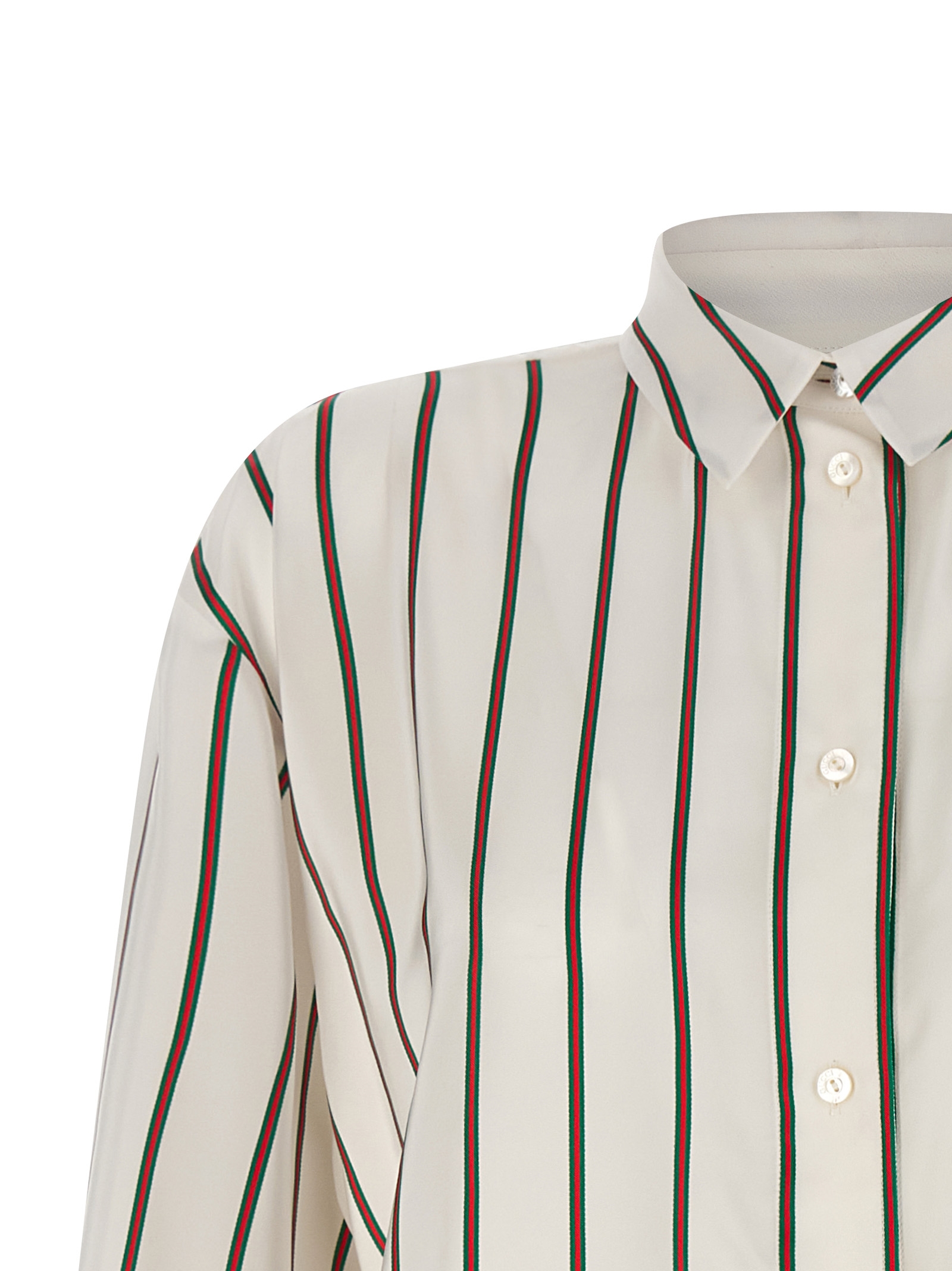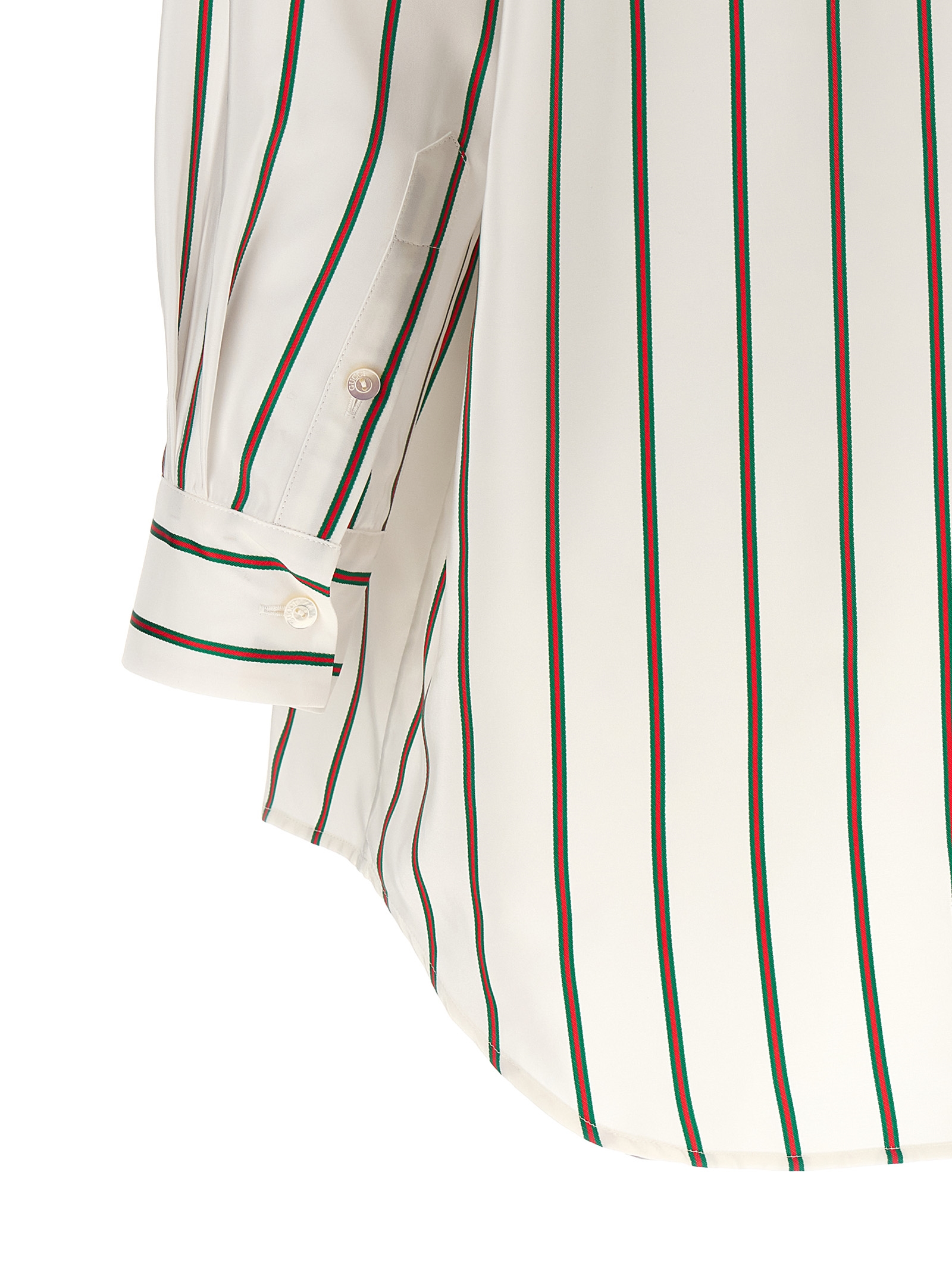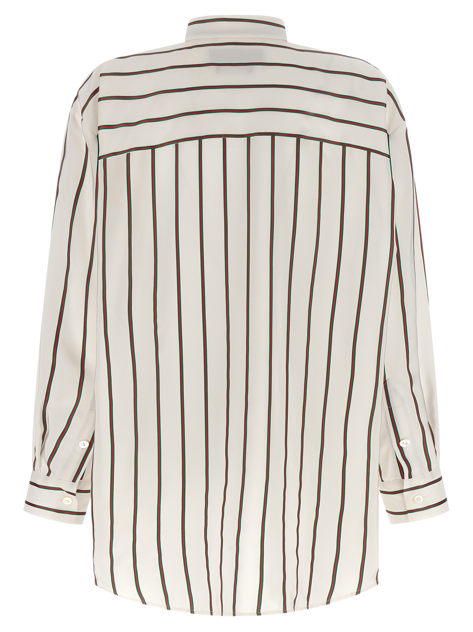 Jacquard silk shirt with Web striped pattern, pointed collar, front mother-of-pearl button closure, long sleeves with cuffs and dropped shoulders, asymmetrical rounded hem.