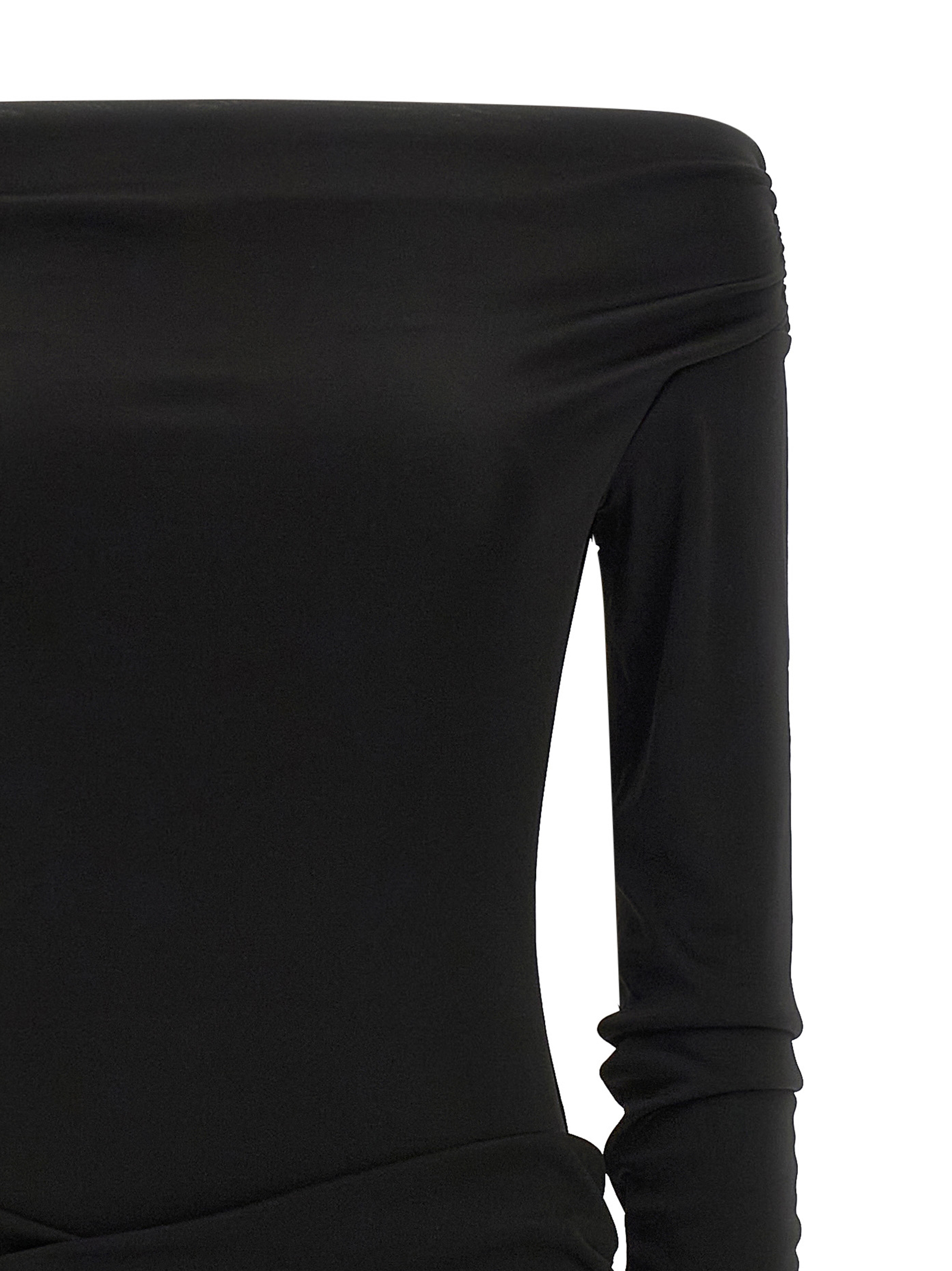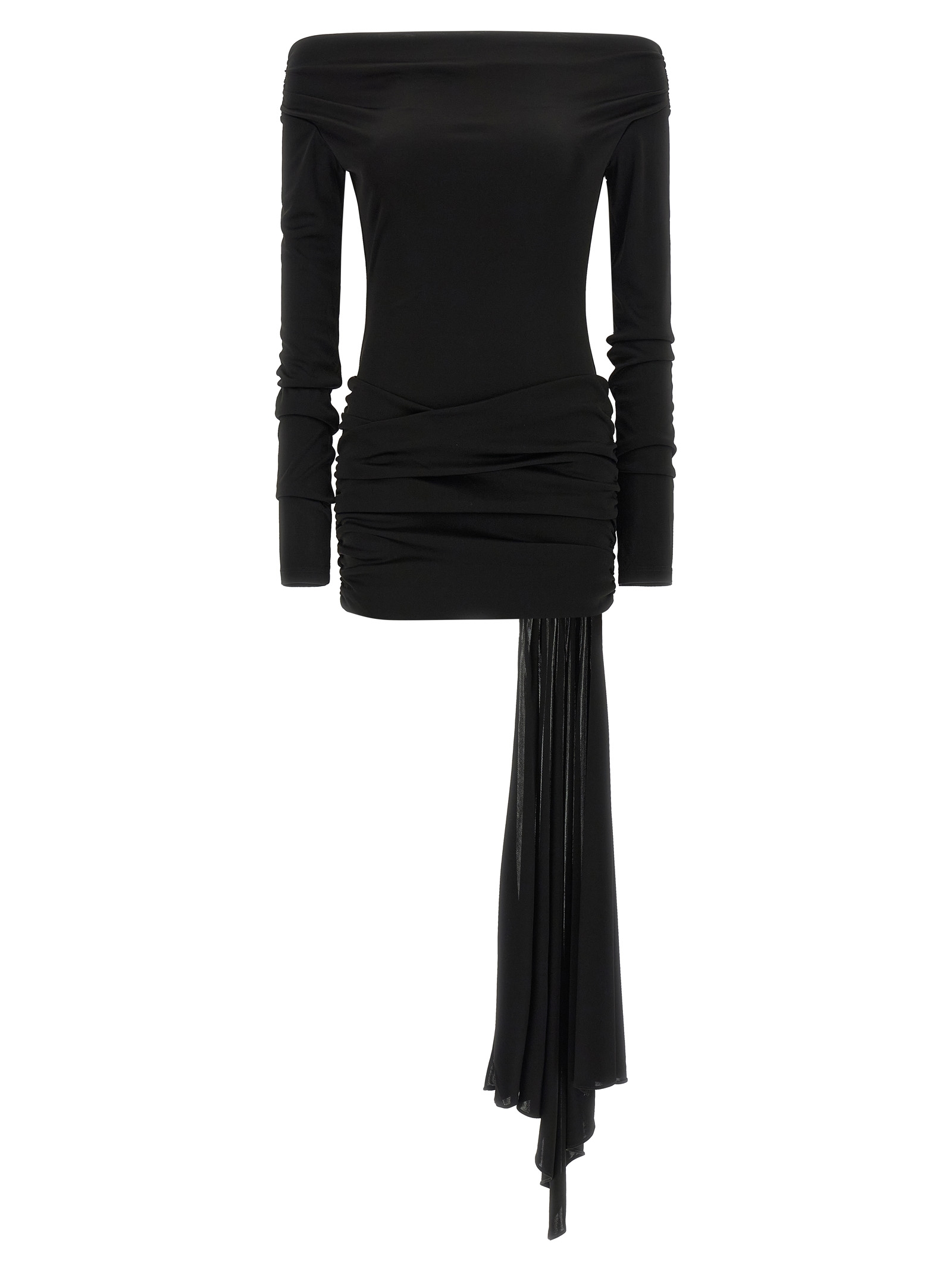 ‘Wendell’ off-the-shoulder shiny jersey mini dress with long sleeves, curled skirt with front draping and ruffles at the back, asymmetrical hem with side train.