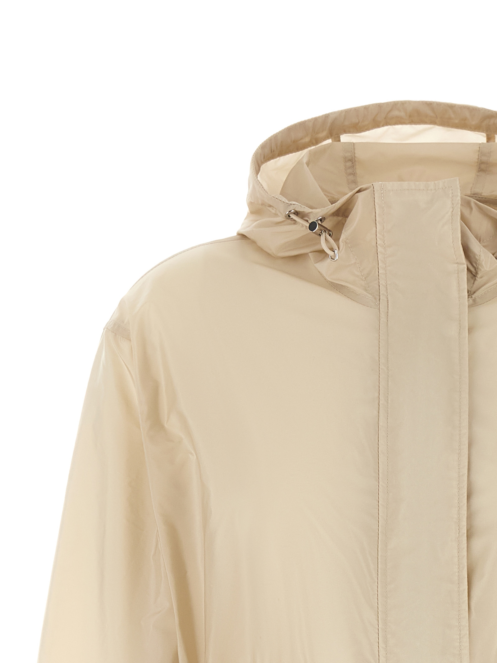 Weteau’ silky nylon technical jacket with water-repellent treatment, adjustable hood, high neck, zip and snap button closure on the front, drawstring at the waist, pockets, long sleeves with elastic cuffs and felt logo patch, asymmetric double-layer hem.