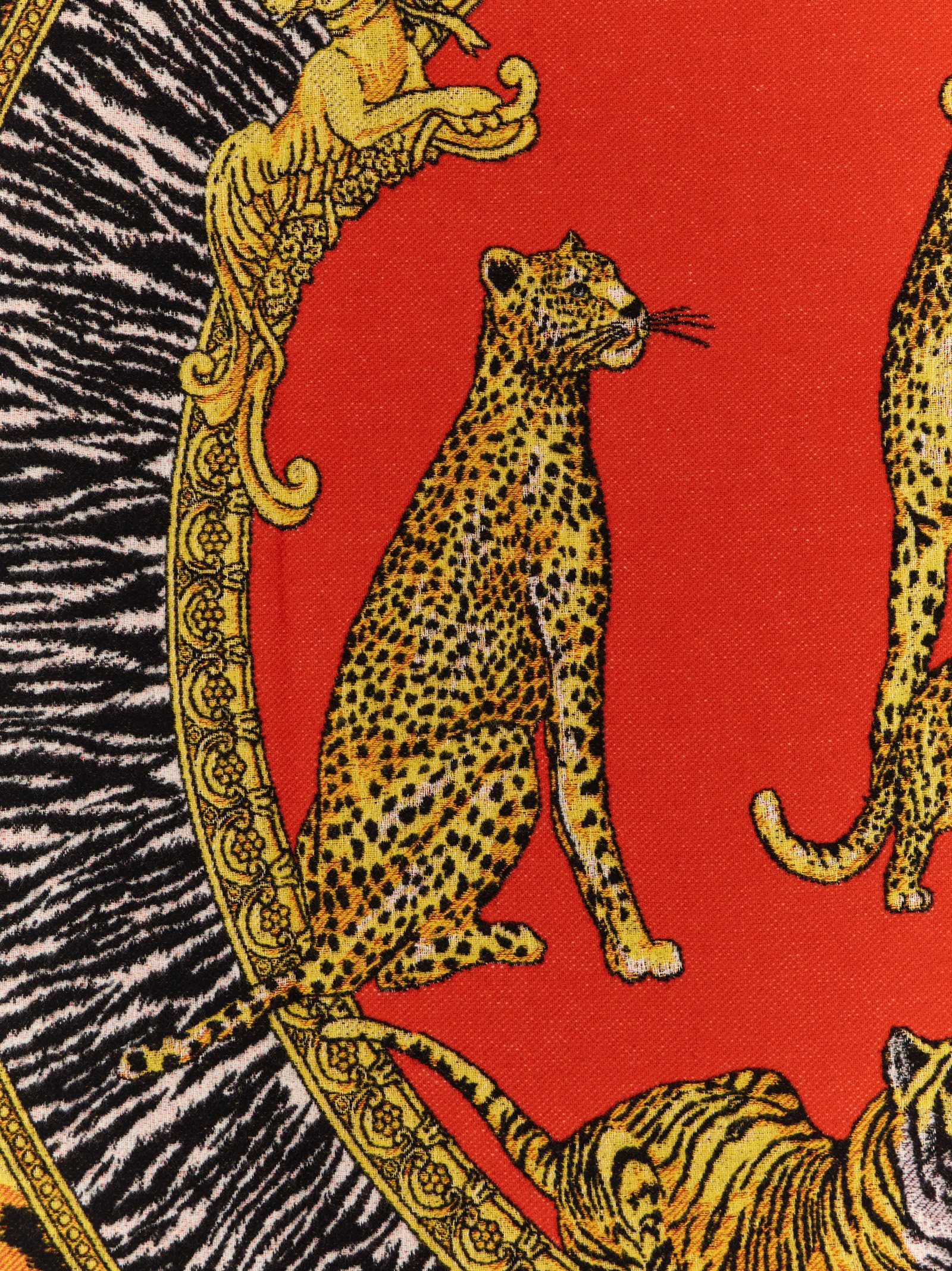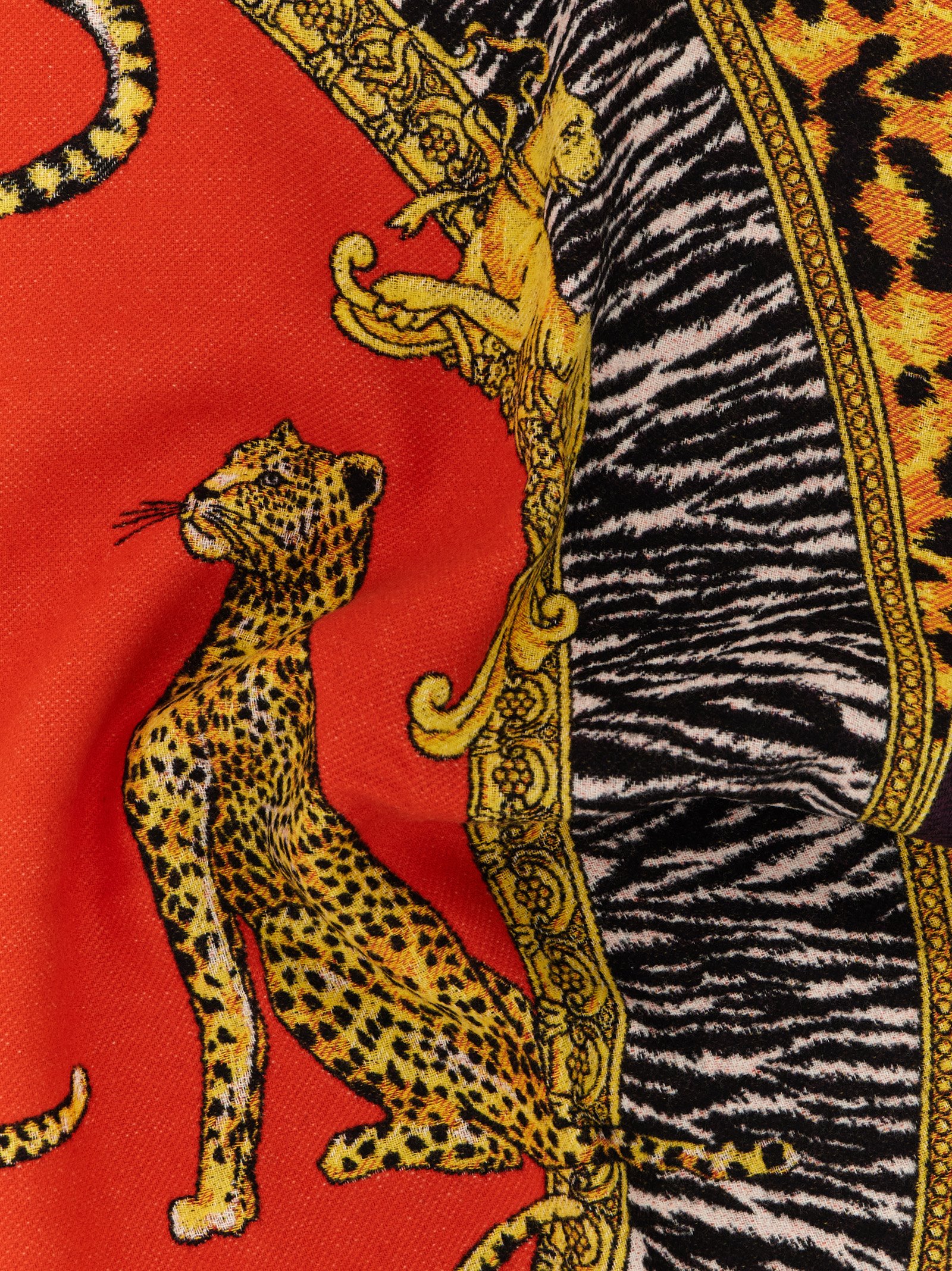 Wool plaid with all-over ‘Wild Cats’ jacquard print, fringes.