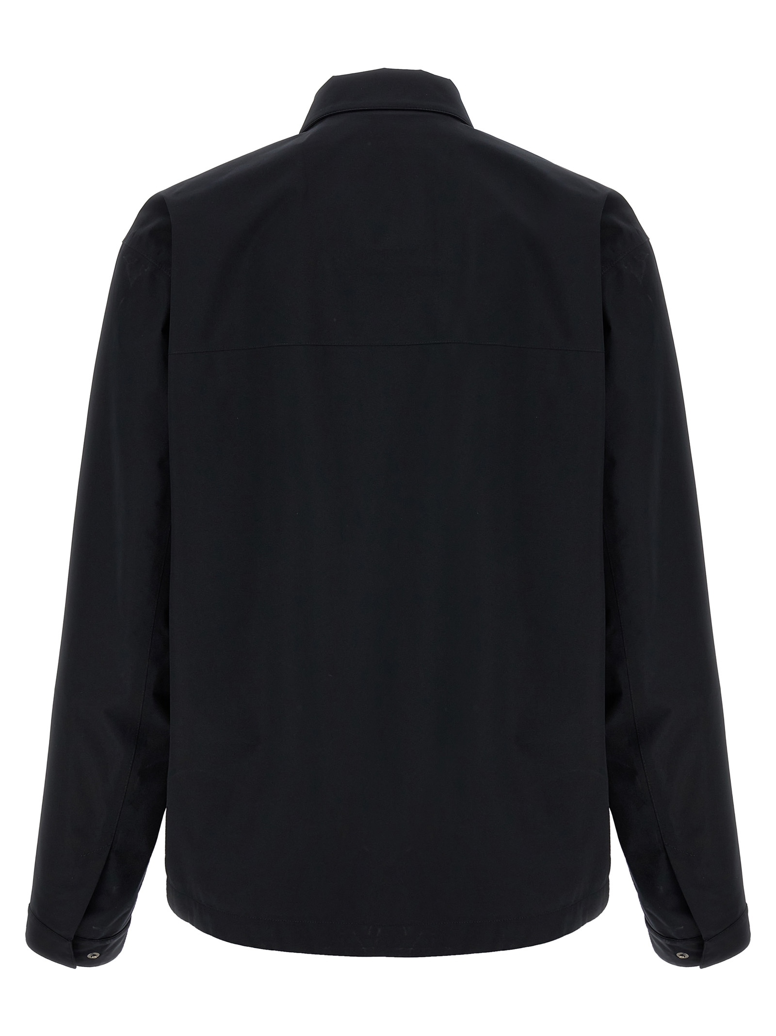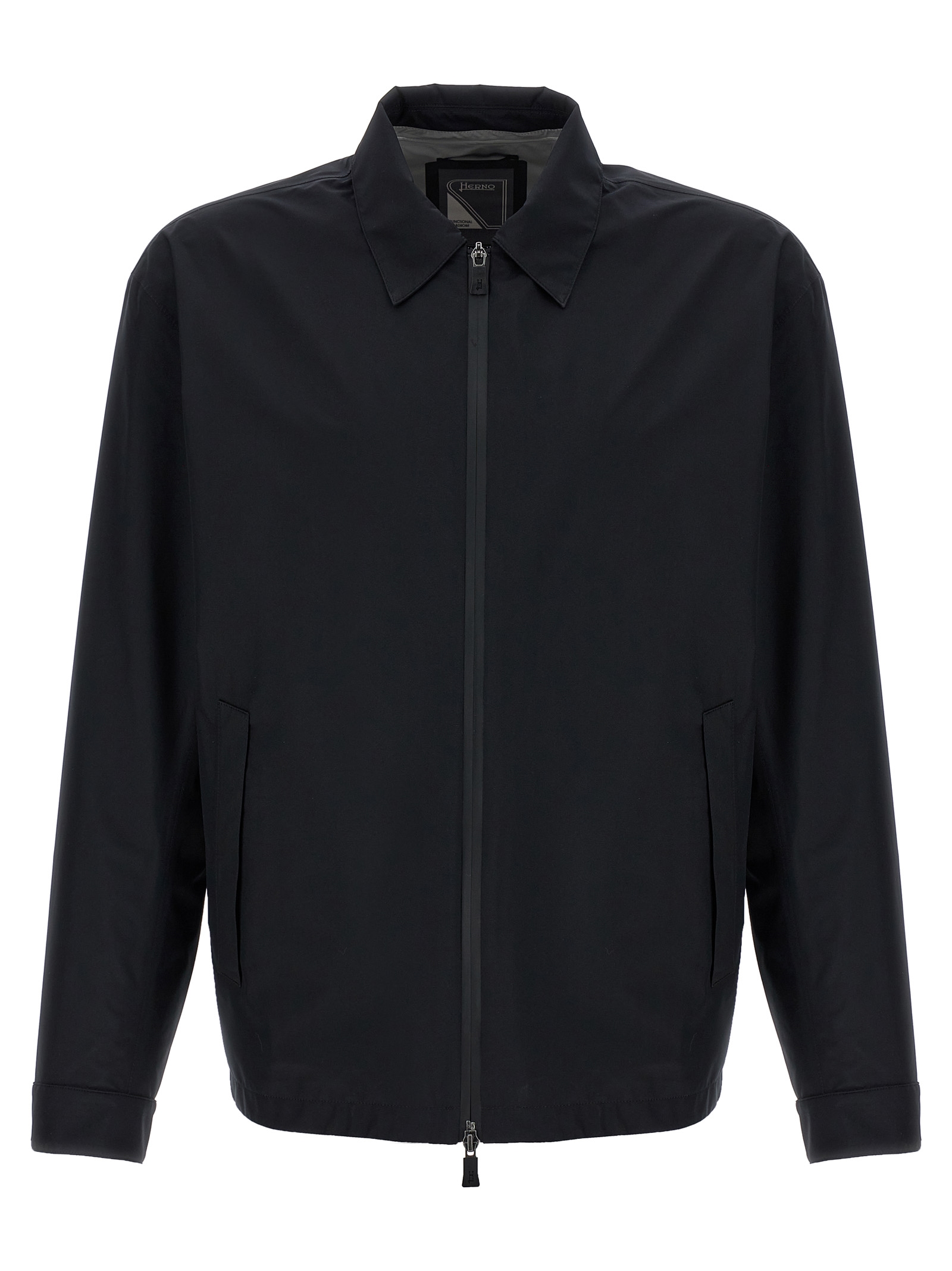 Windproof technical fabric jacket, collar, zip closure, pockets, long sleeves with cuffs.