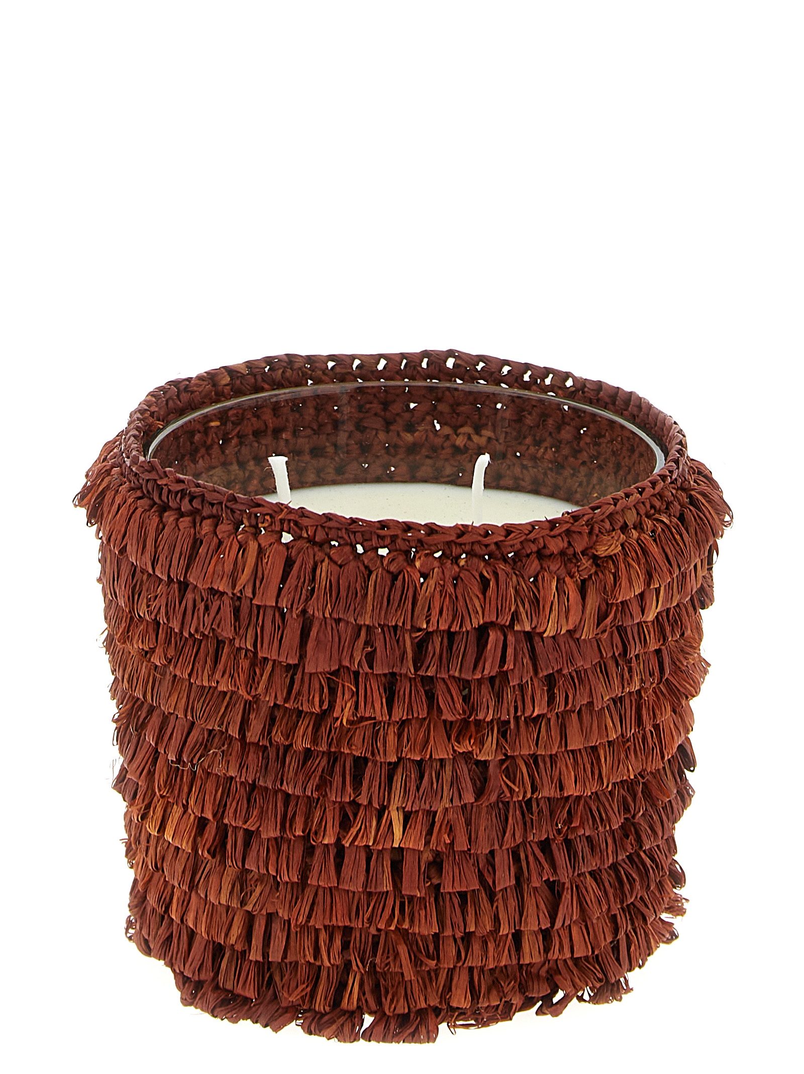 The glass container has a natural raffia cover and can be reused as a decorative vase once the candle is finished.