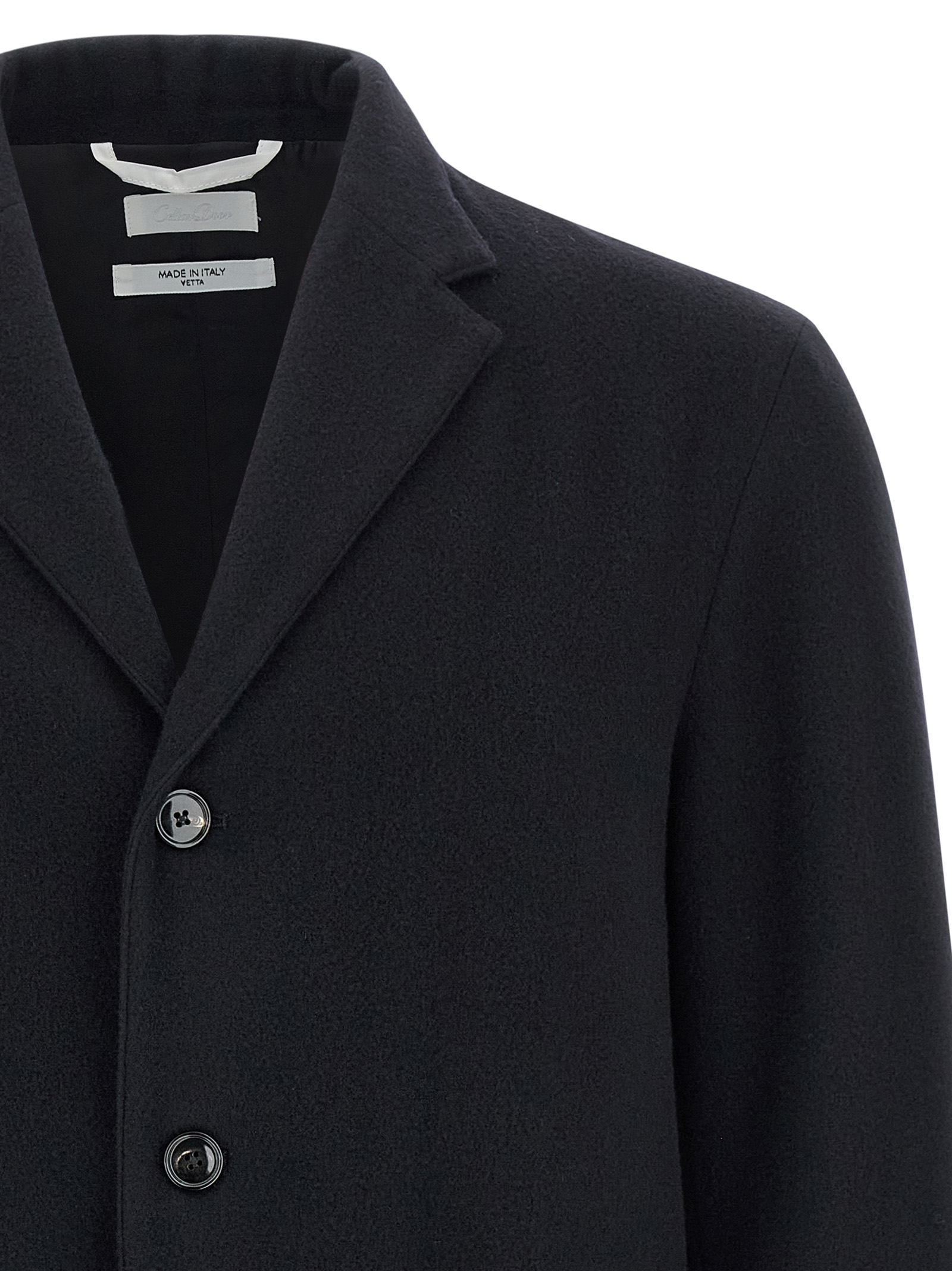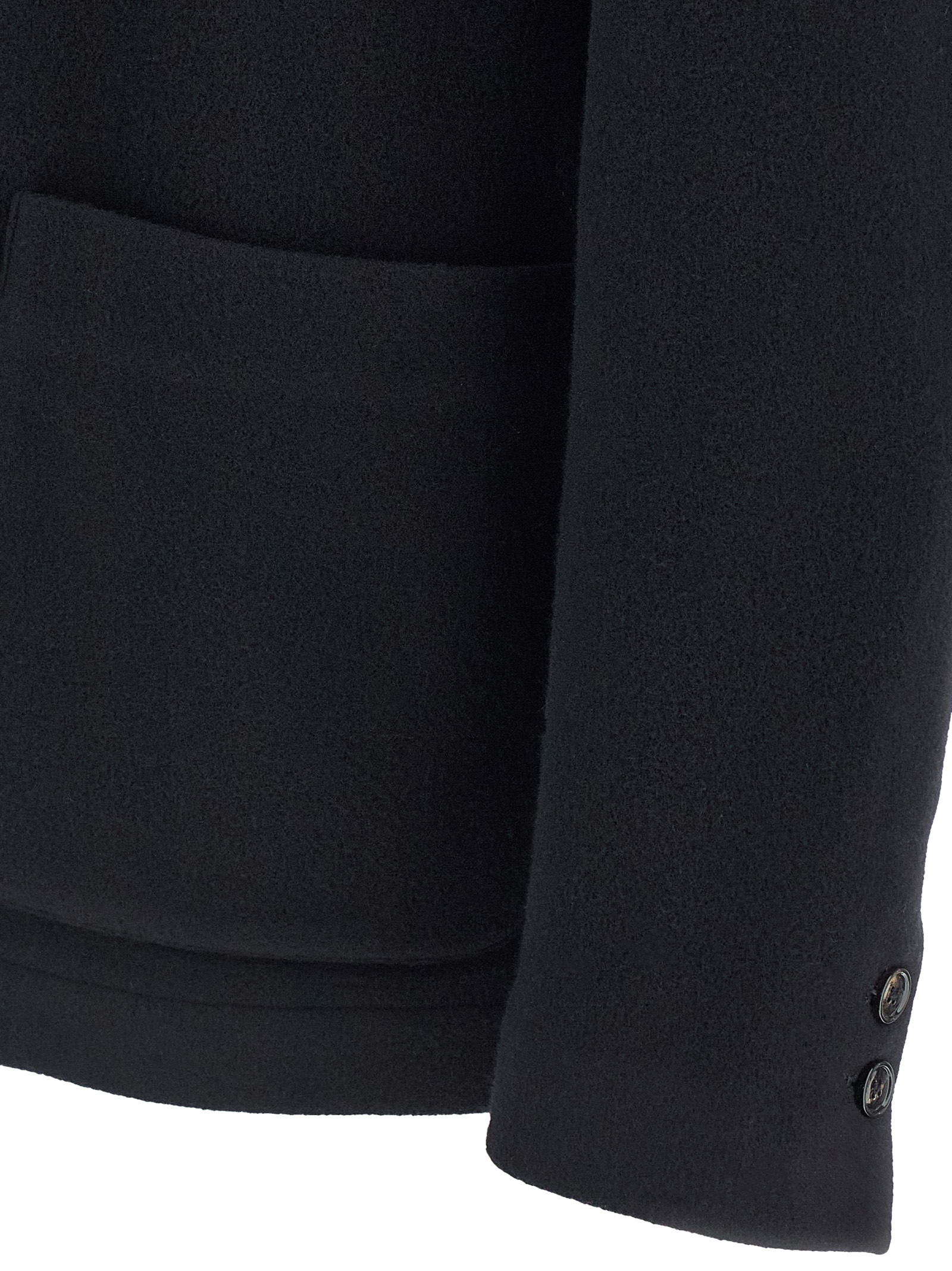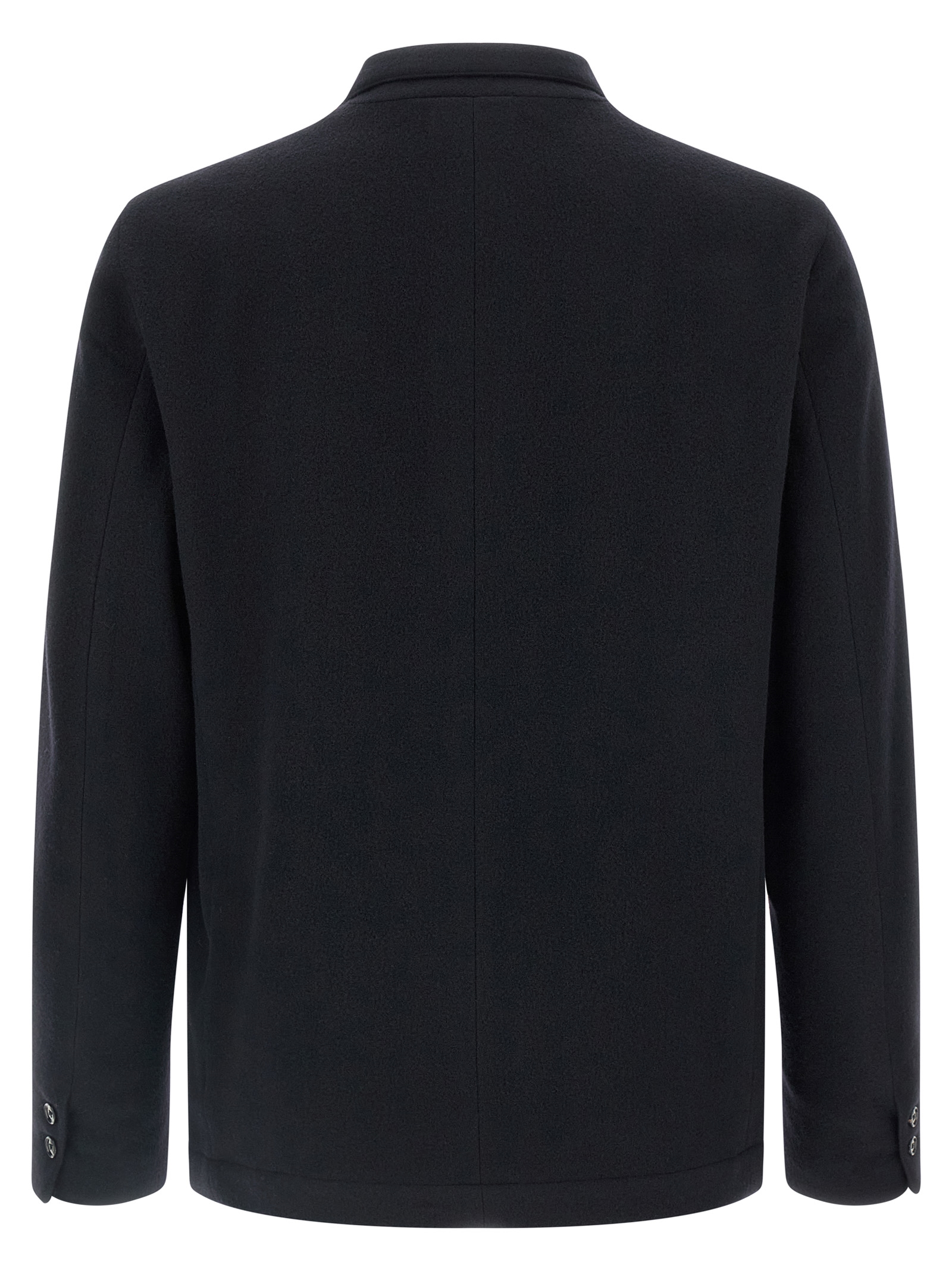 Deconstructed single-breasted wool blazer with two front button closure, mirror lapels, pockets, cuffs with open buttonholes, cupro lining.