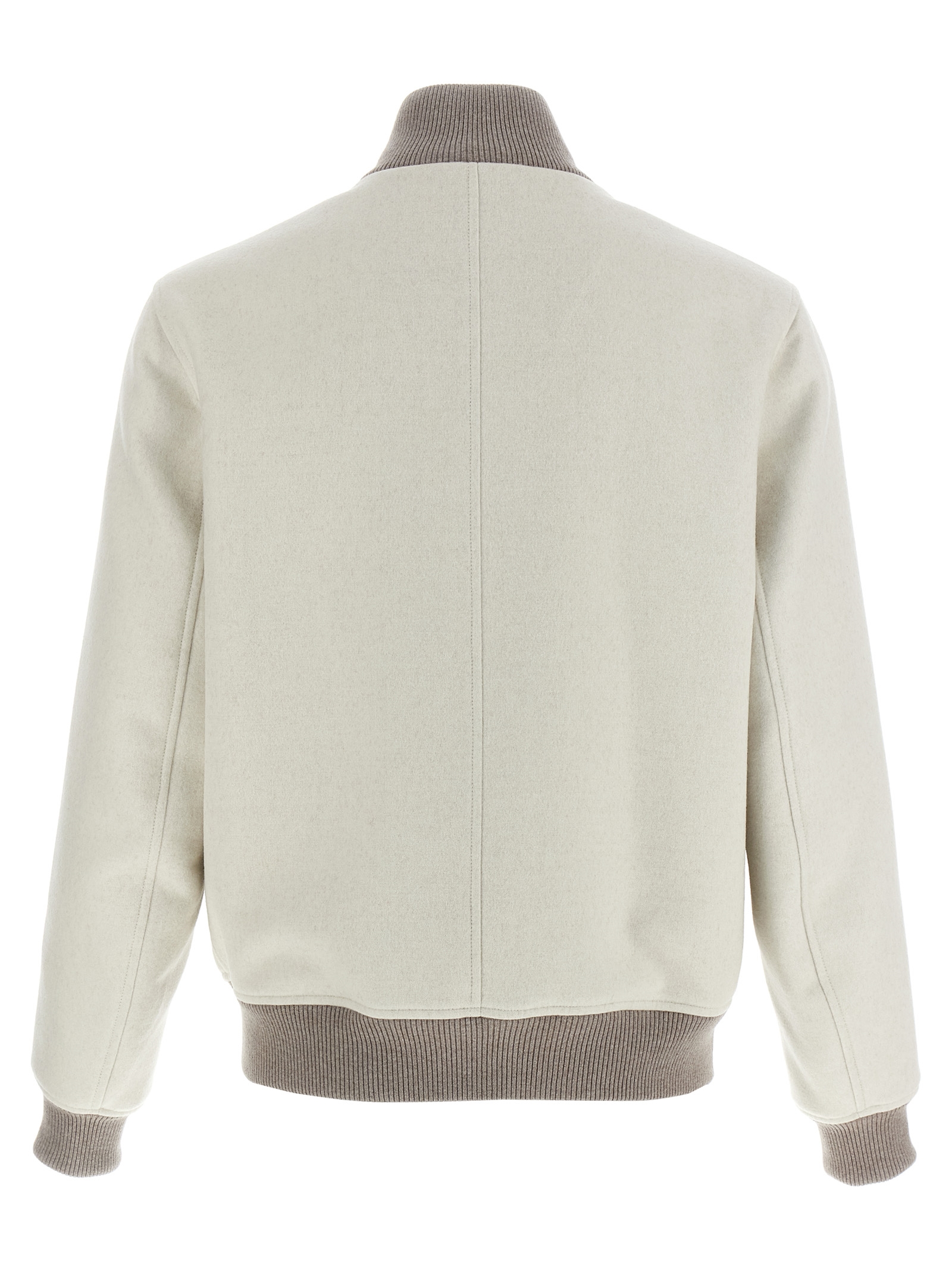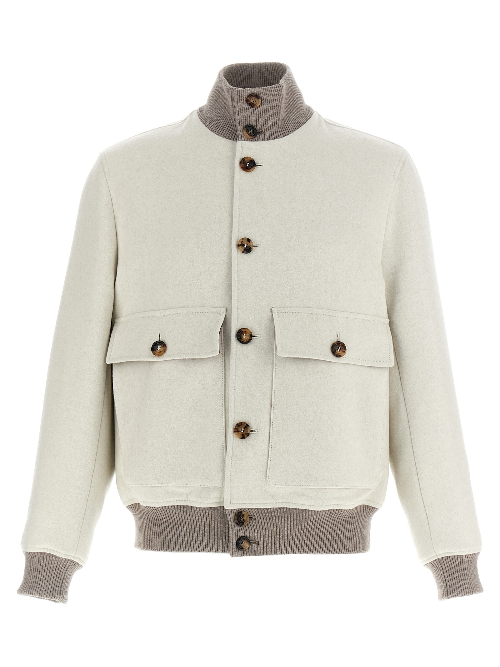 Wool bomber jacket with contrasting stretch ribbed knit details, high neck, front button closure, pockets, long cuffed sleeves, cupro lining.