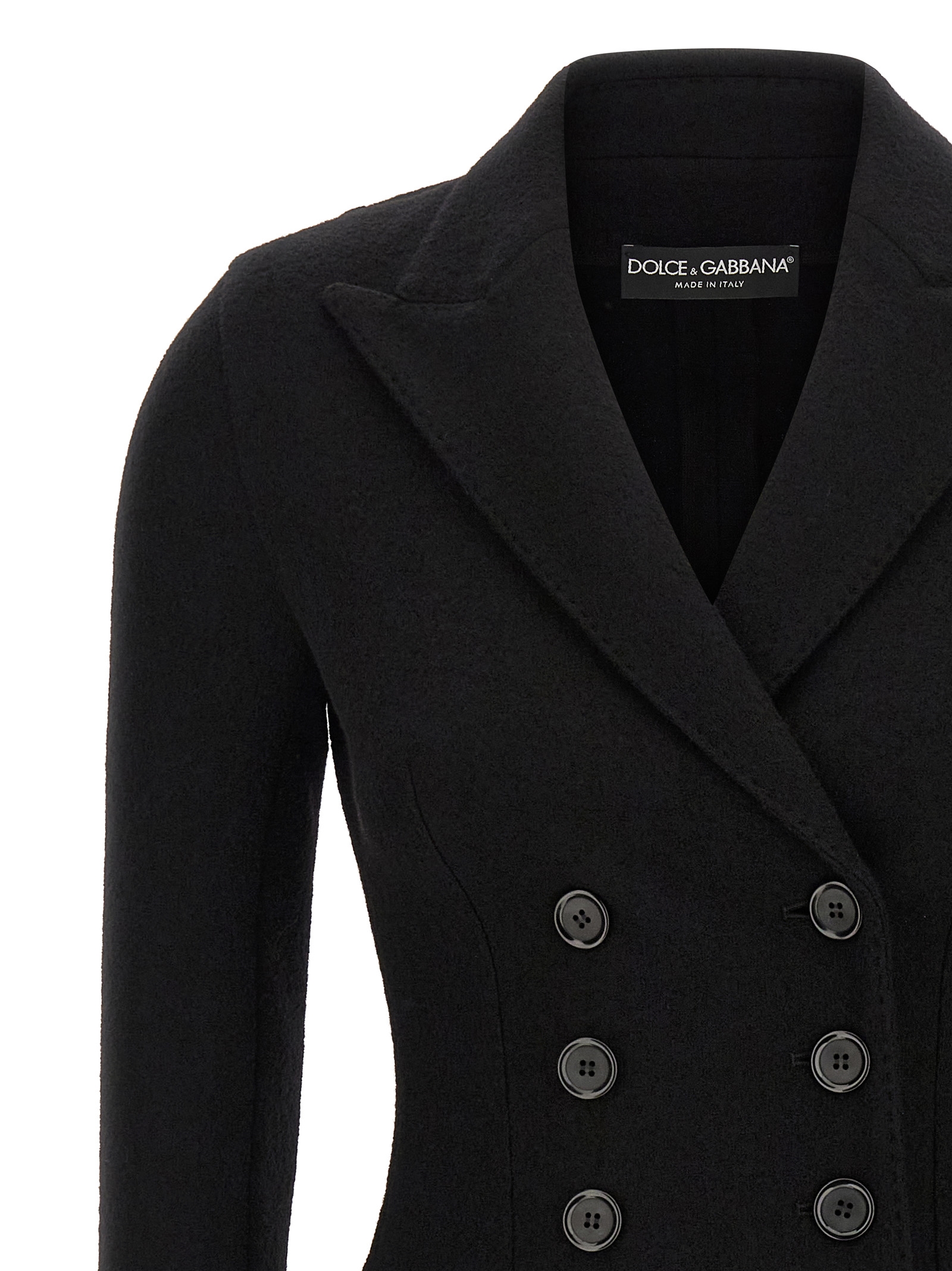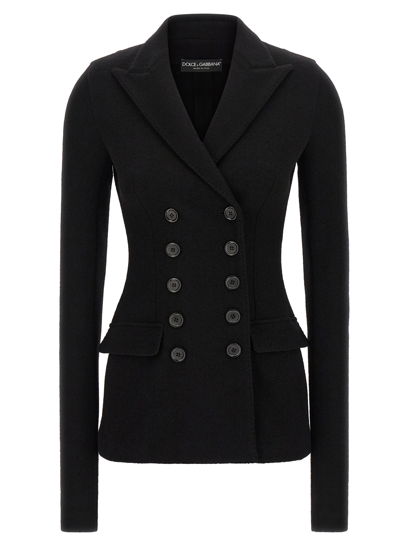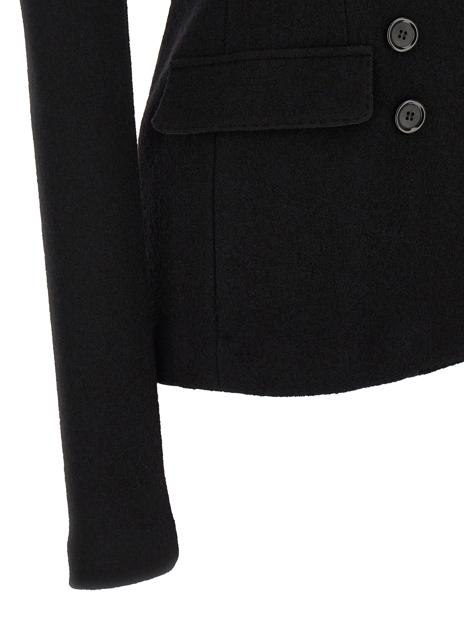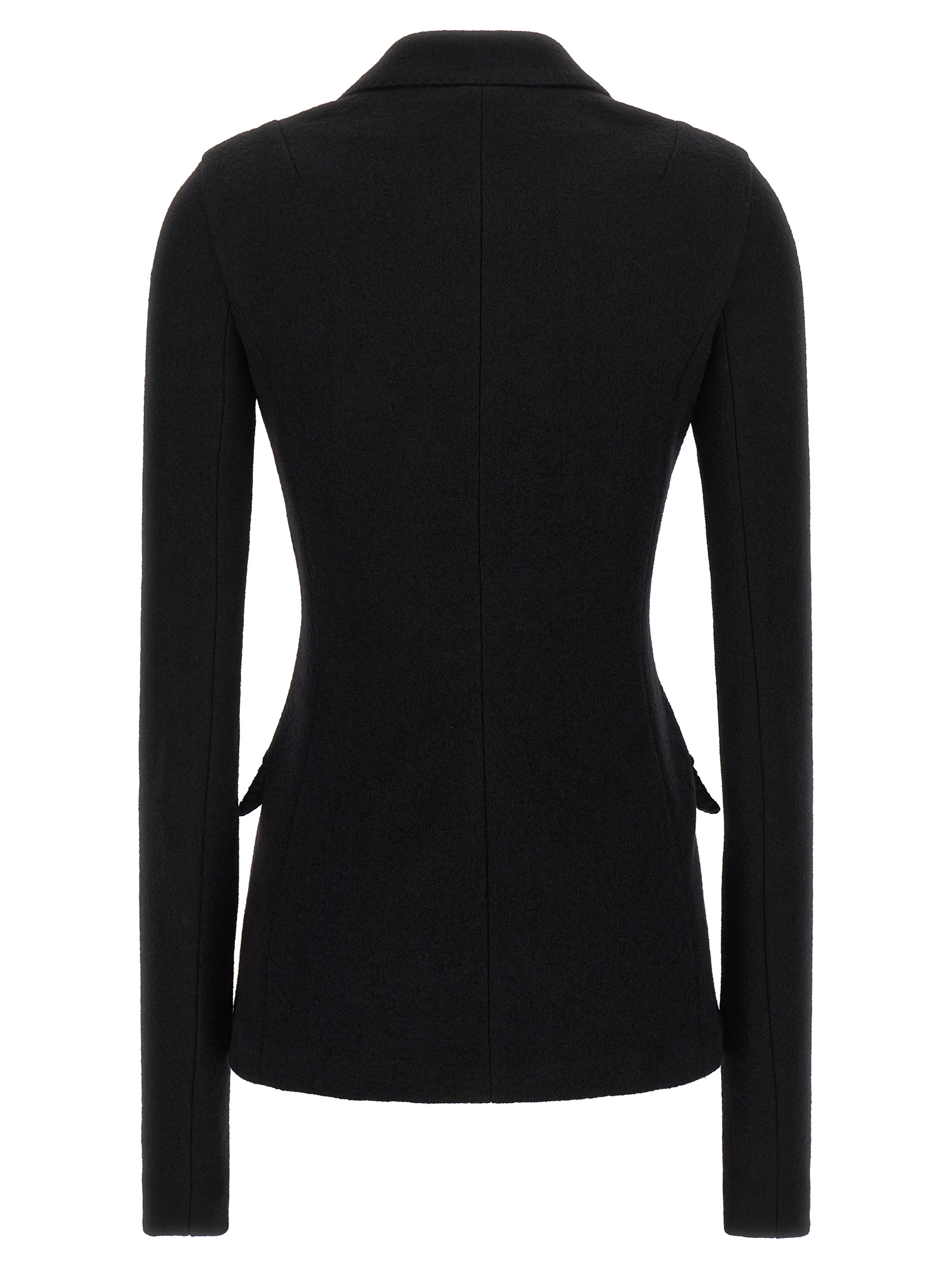 Deconstructed double-breasted virgin wool blazer with front button closure, hourglass silhouette, peak lapels, trompe l’oeil pockets, long sleeves, unlined.