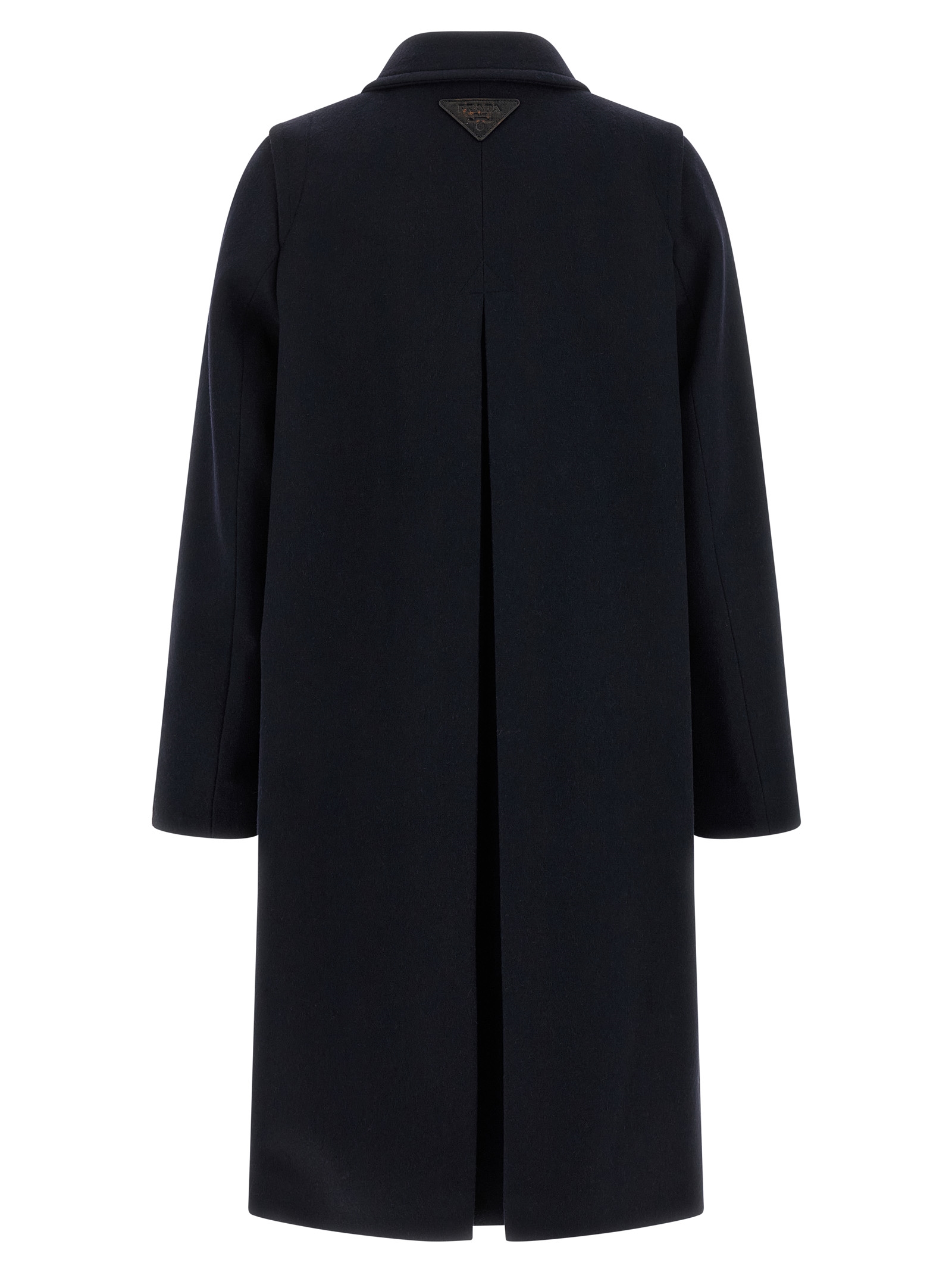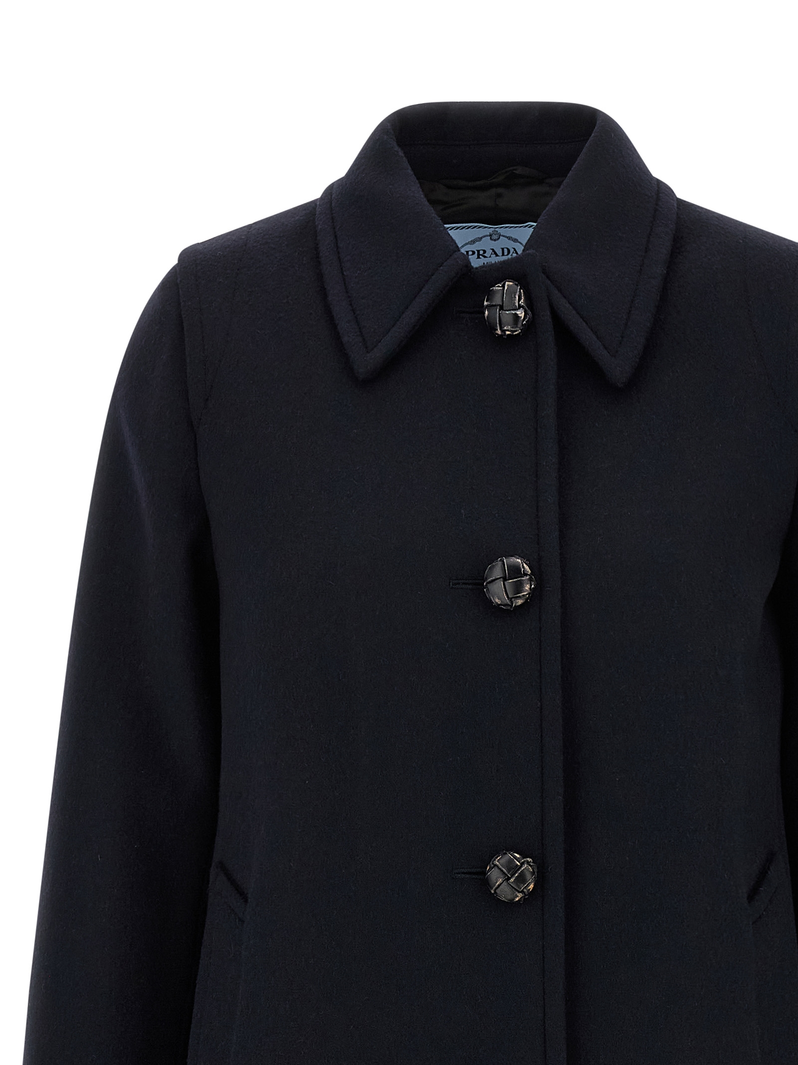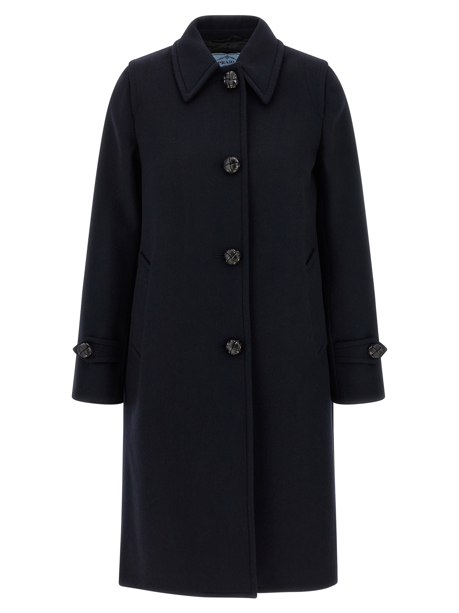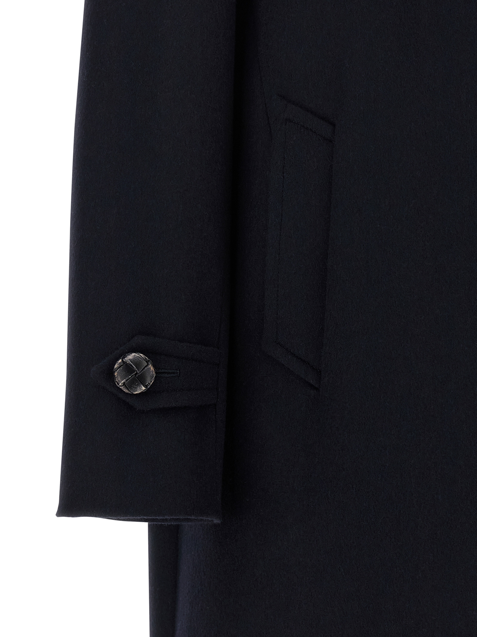 Loden style wool coat with front button closure, collar, pockets, long sleeves, rear gusset, viscose lining.