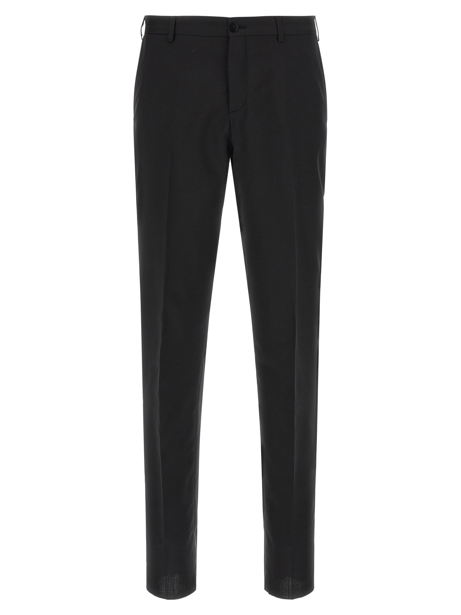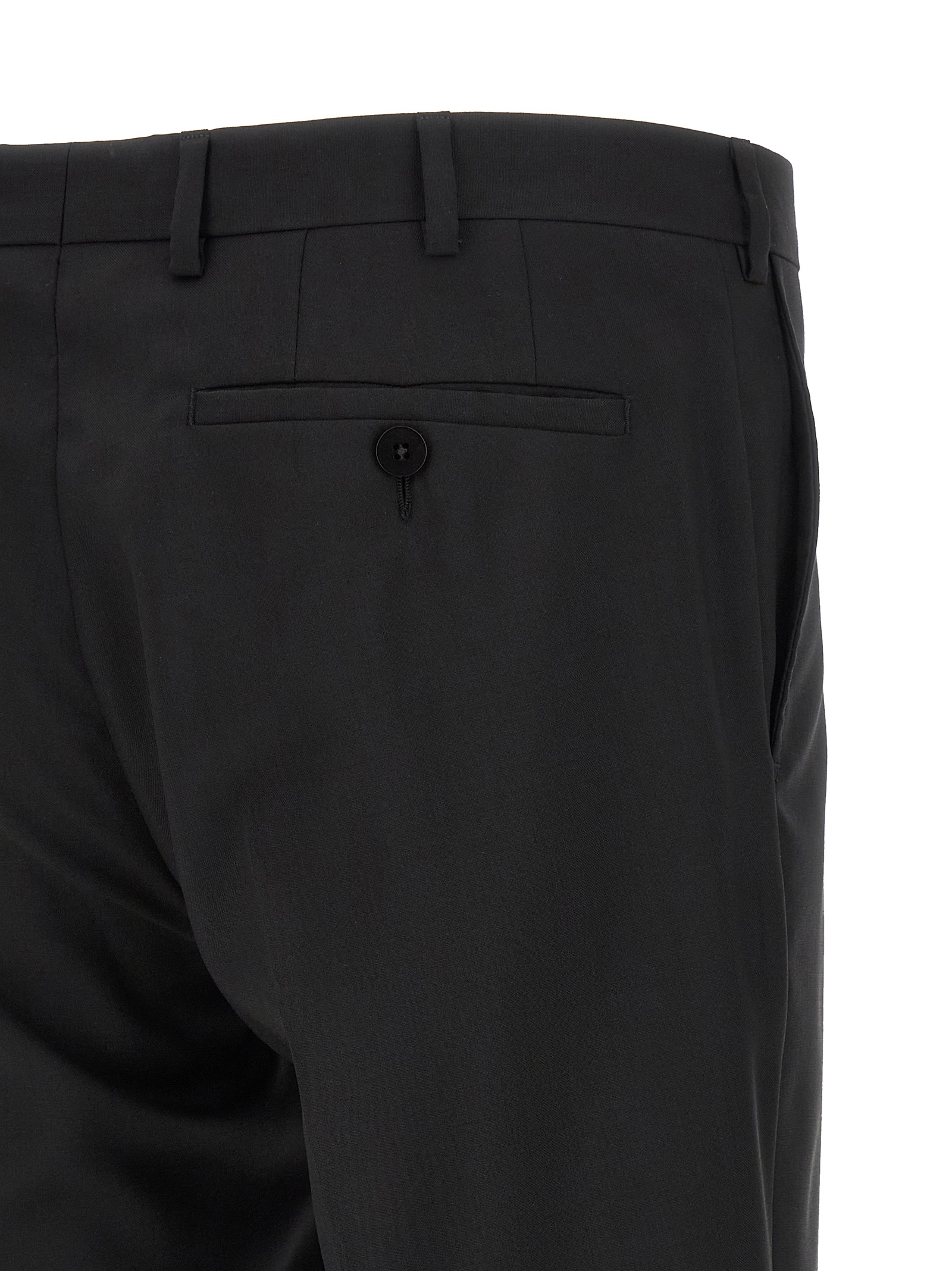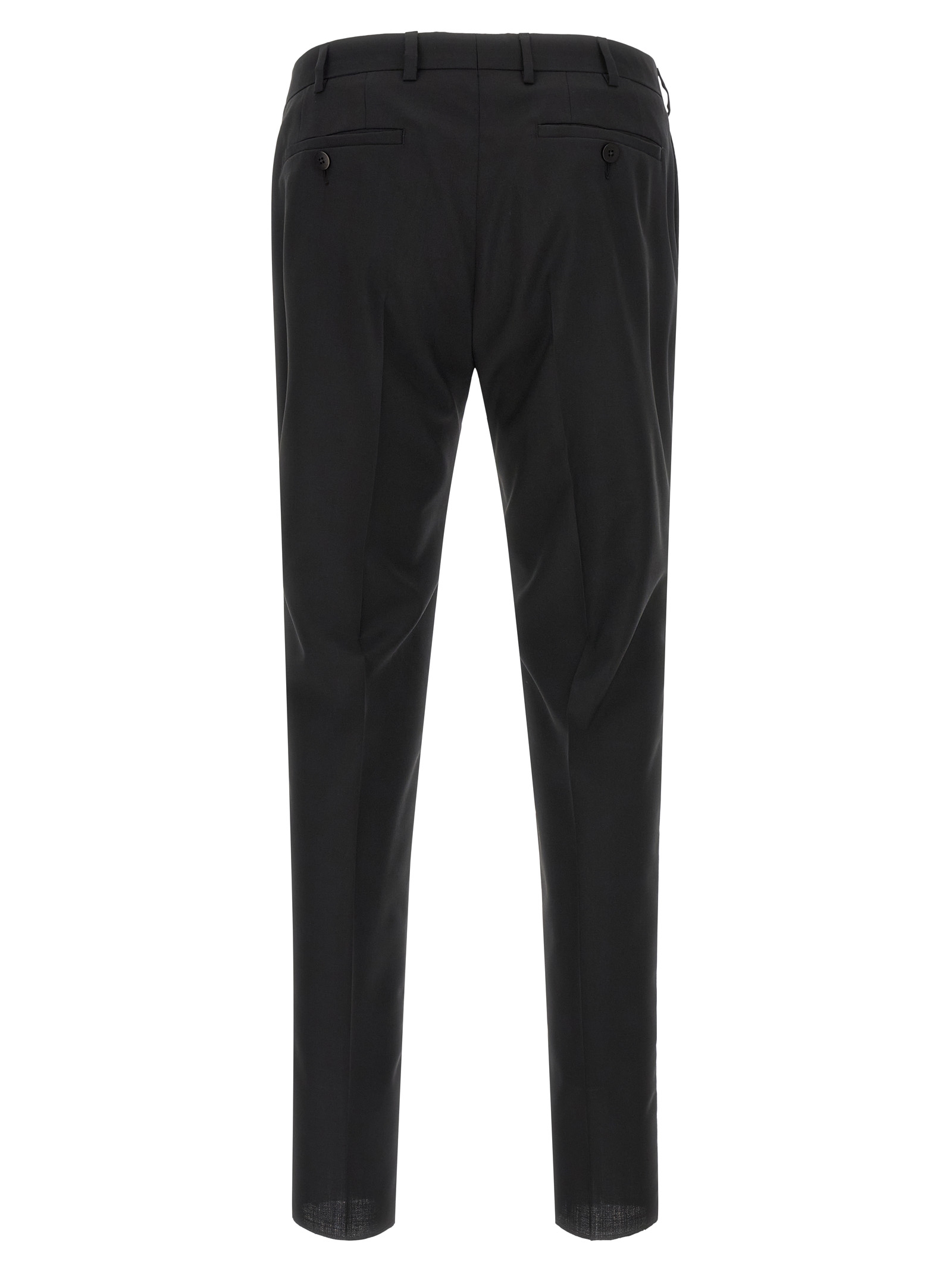 Dress – Ceremony line in cool wool with mother-of-pearl buttons consisting of single-breasted blazer with front button closure, mirror lapels, chest pocket, flap pockets, viscose lining, two inner pockets, structured shoulder strap, cuffs with opening buttonholes, back slits and trousers with stretched pleat, front ‘americane’ pockets, back welt pockets, front zip and button closure, viscose lining.