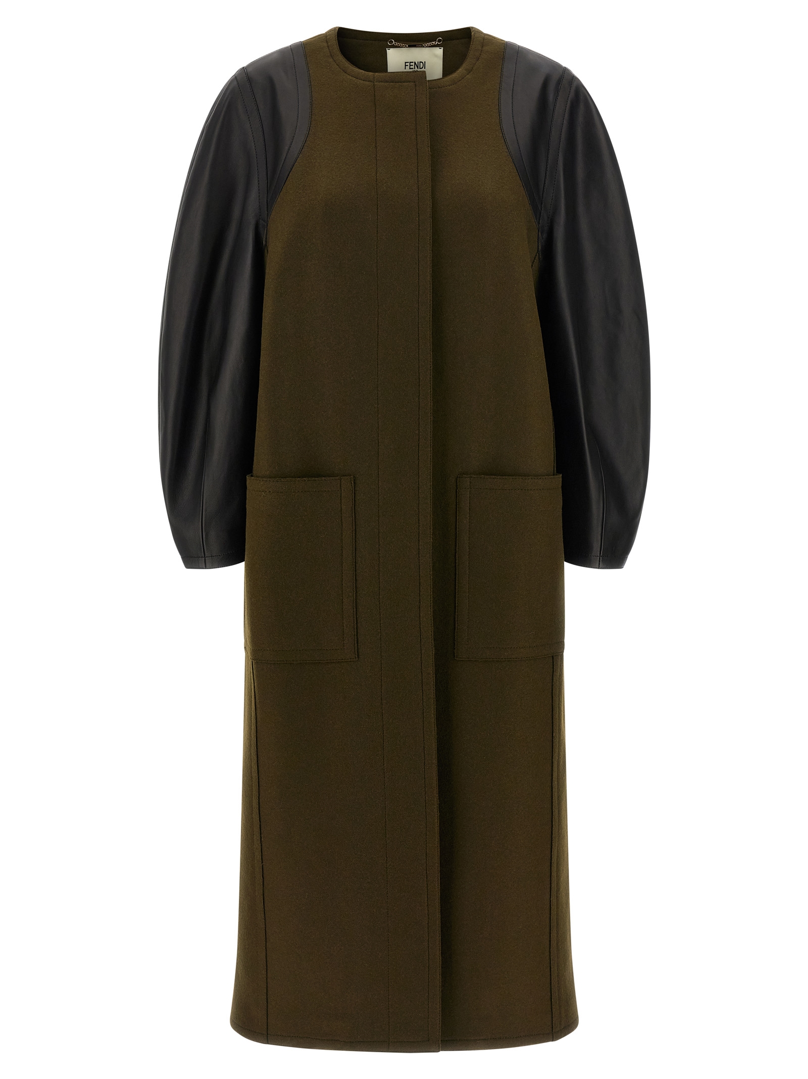 Wool Felt’ wool crewneck coat with concealed front button closure, long leather sleeves, side pockets, mini belt at the waist with adjustable and removable logo.