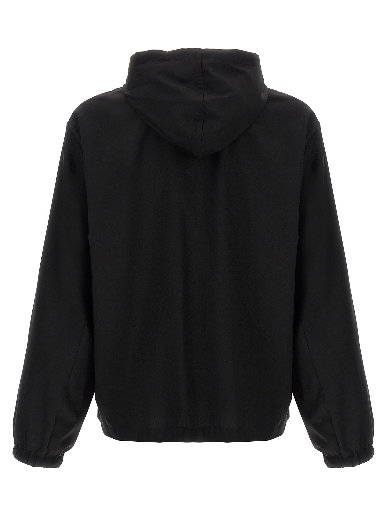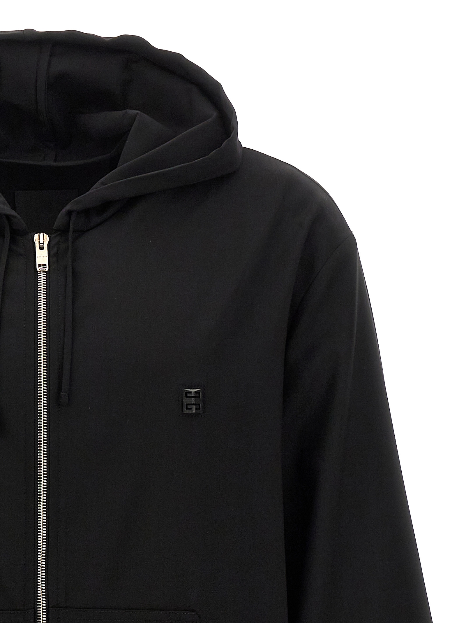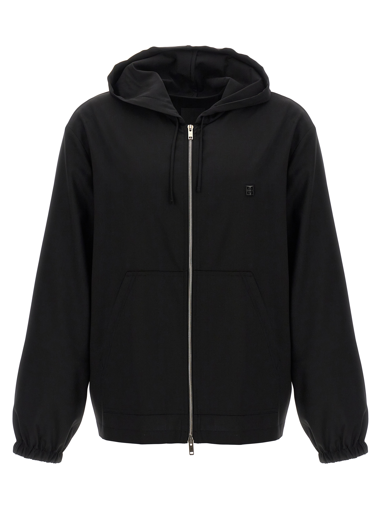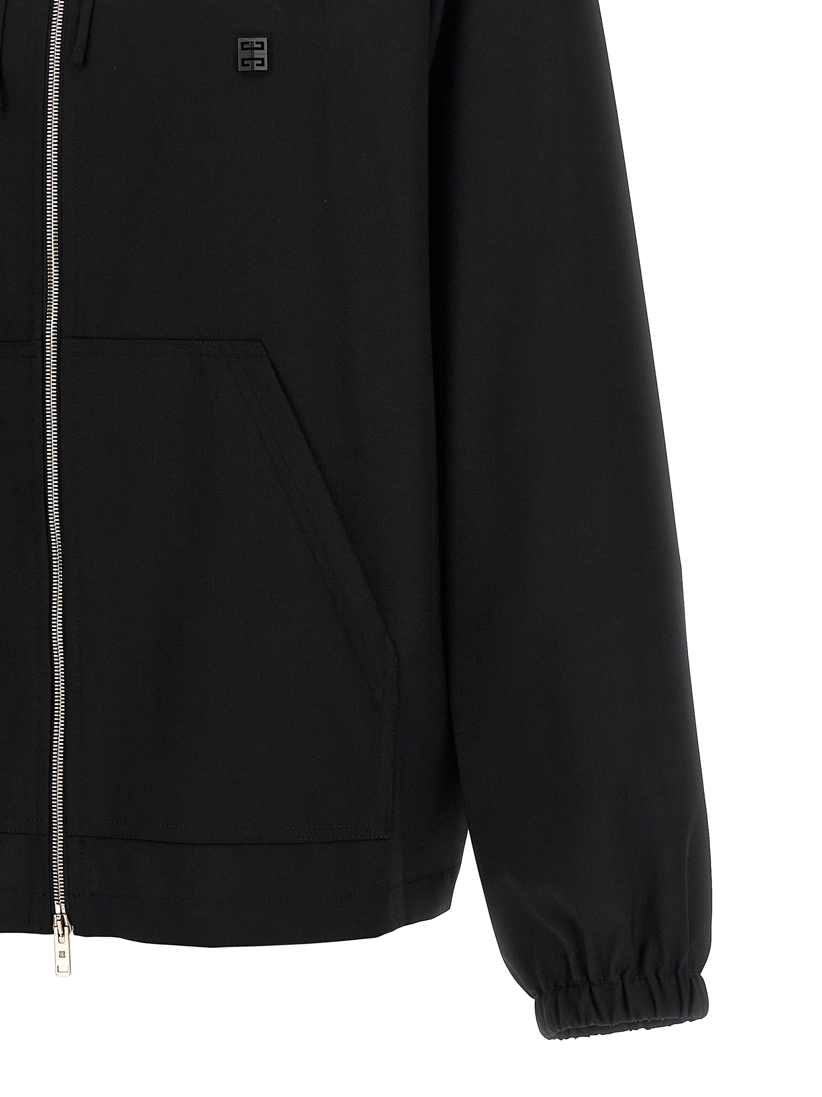 Wool hoodie with front logo plaque, zip closure, pockets, long cuffed sleeves.