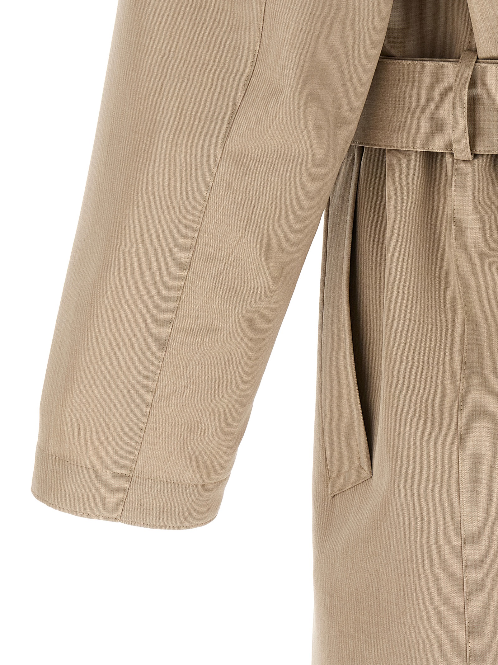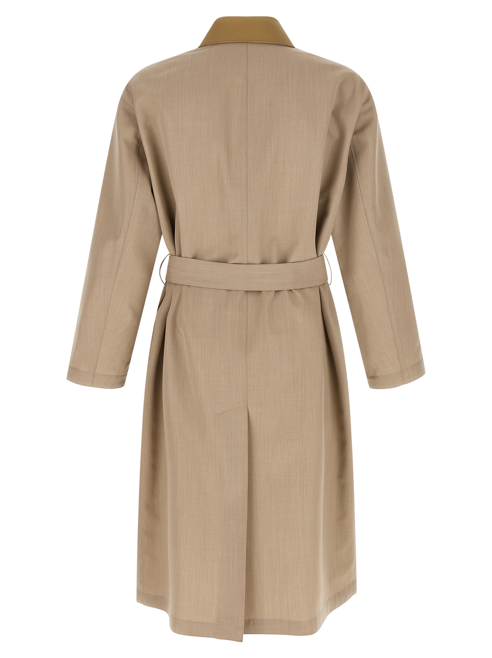 Long ‘Wool Max Canvas’ wool canvas coat made with a dense weave of crisp-handed Super 120 ultrafine fibers, leather shirt collar, front button closure, pockets, long sleeves with dropped shoulder, back split, unlined, removable matching belt.