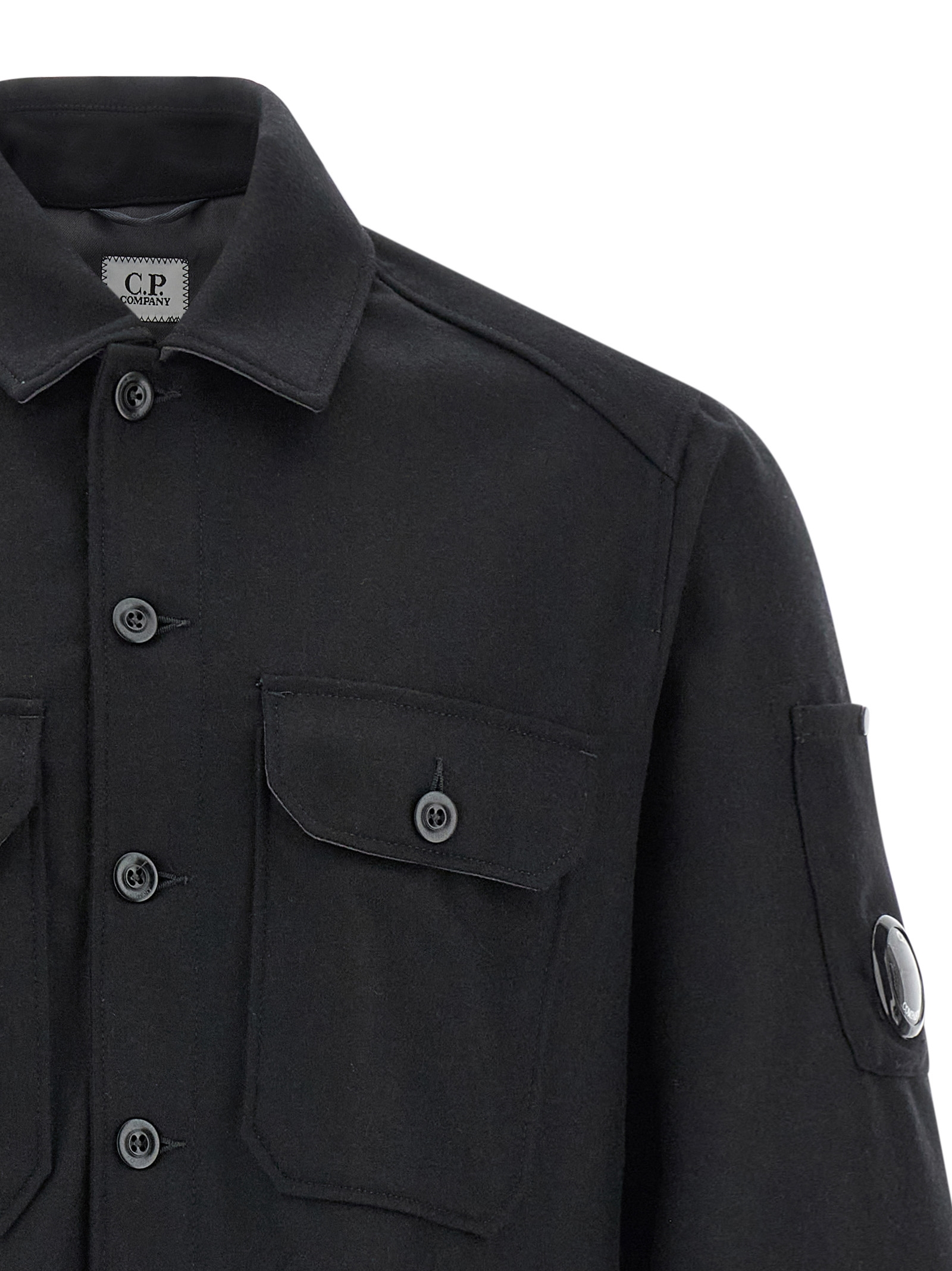 Wool overshirt, unlined, shirt collar, front pockets, side slits, button closure, side logo, long sleeves with cuffs.