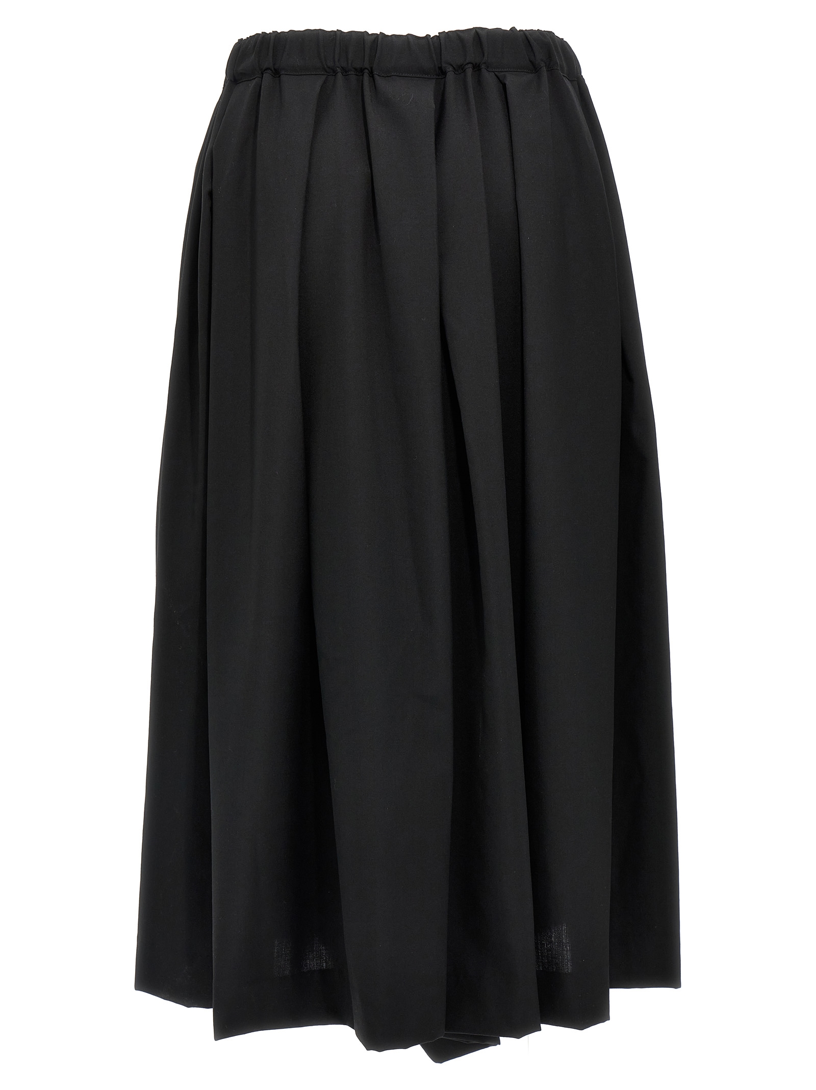 Wool trousers, model with very low crotch and extra wide leg, elastic waistband, pockets.