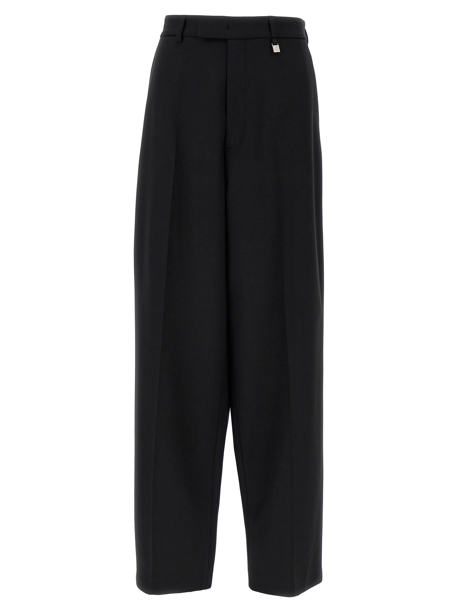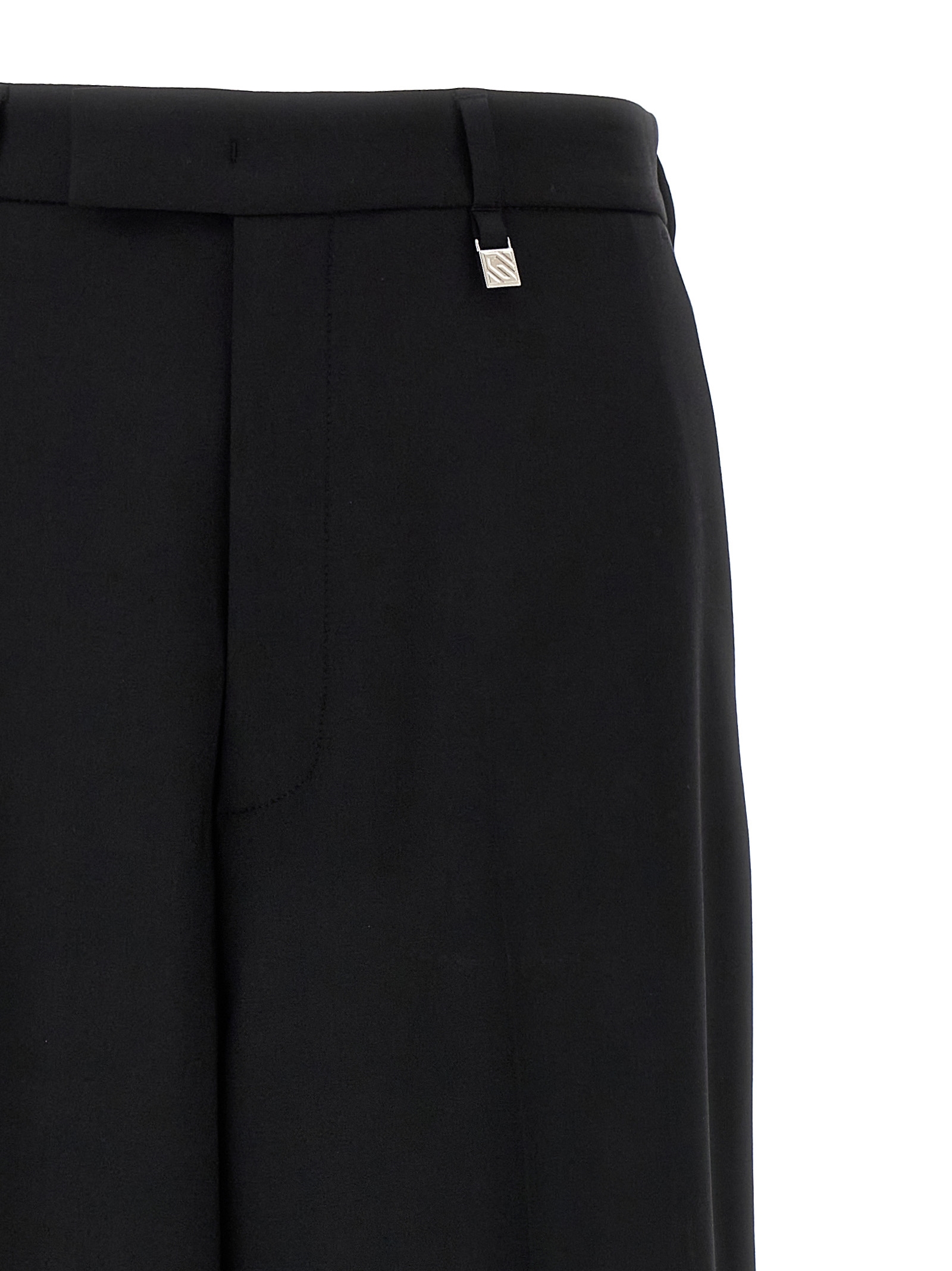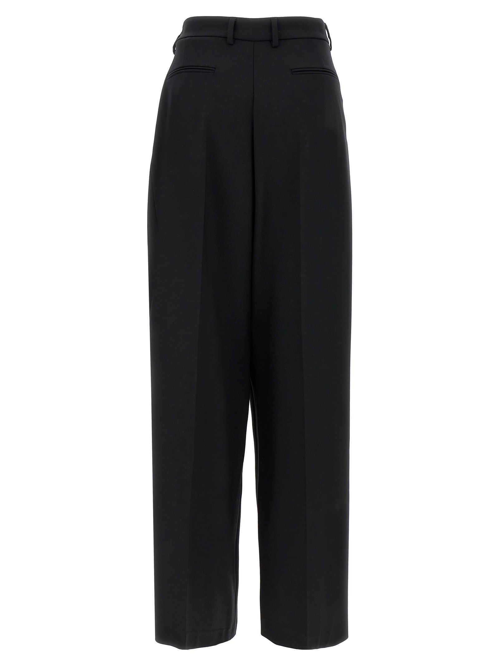 Stretch wool trousers, hook and button zip closure, pockets, straight and wide leg with stretched pleat.