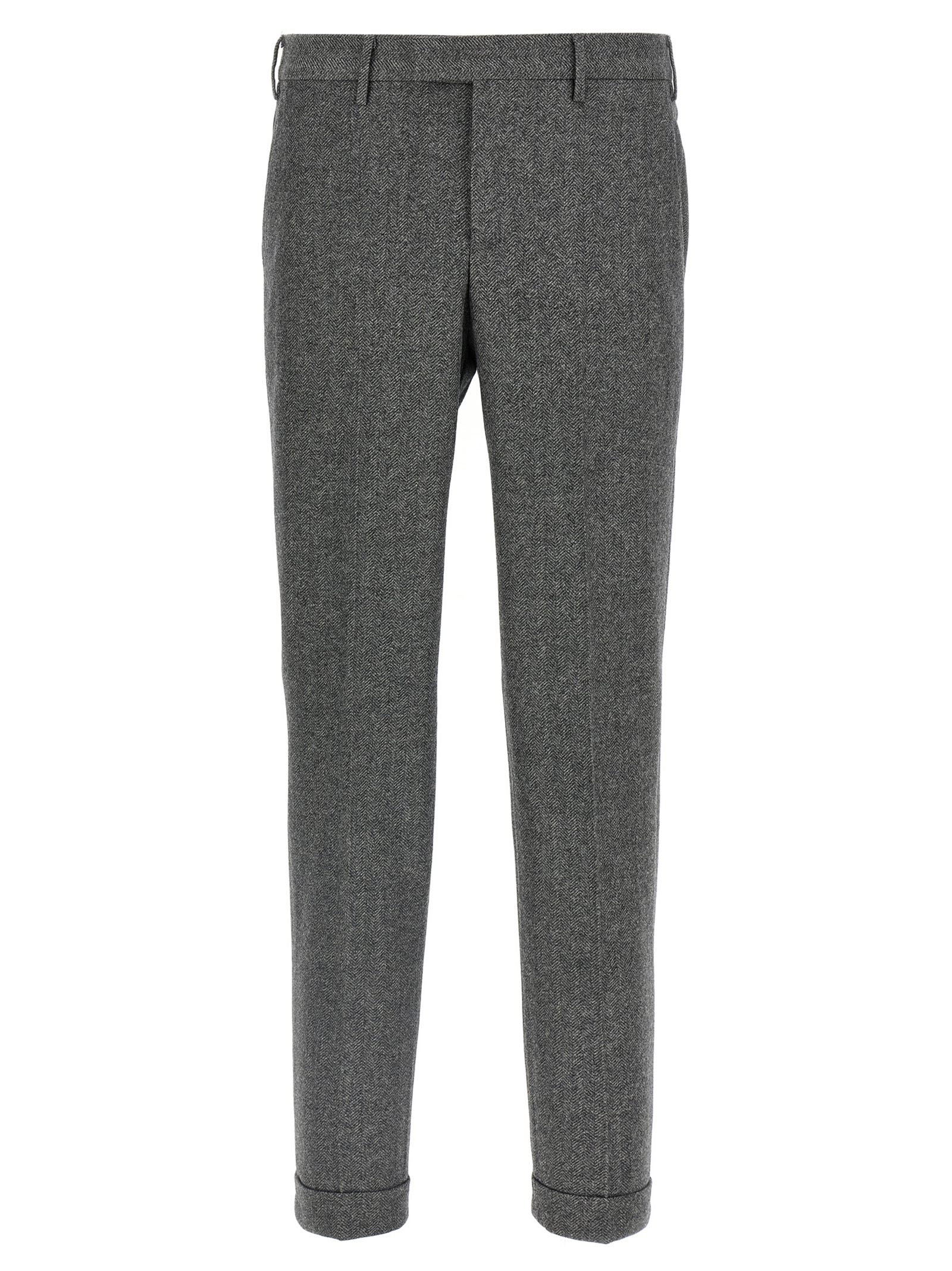 Lightly stretch brushed cashmere blend wool pants, master fit, straight leg with turn-up hem, button and zip closure, pockets.