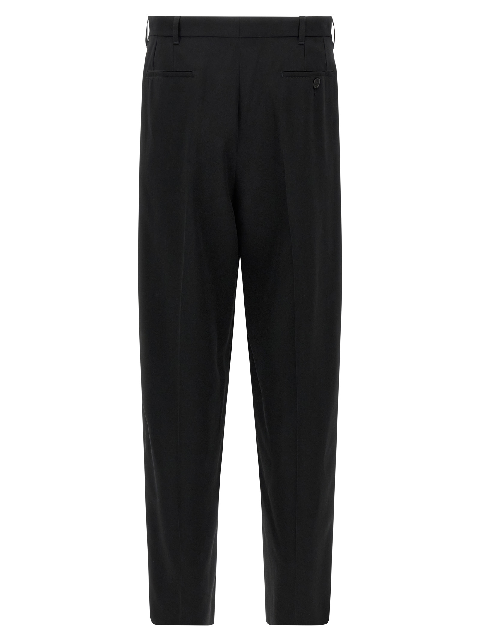 Wool trousers, classic straight leg with front stretched pleat, two-tone side bands, front zip and hook closure, pockets.