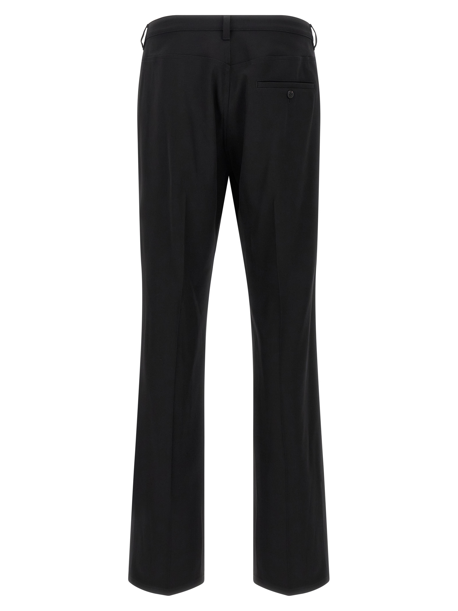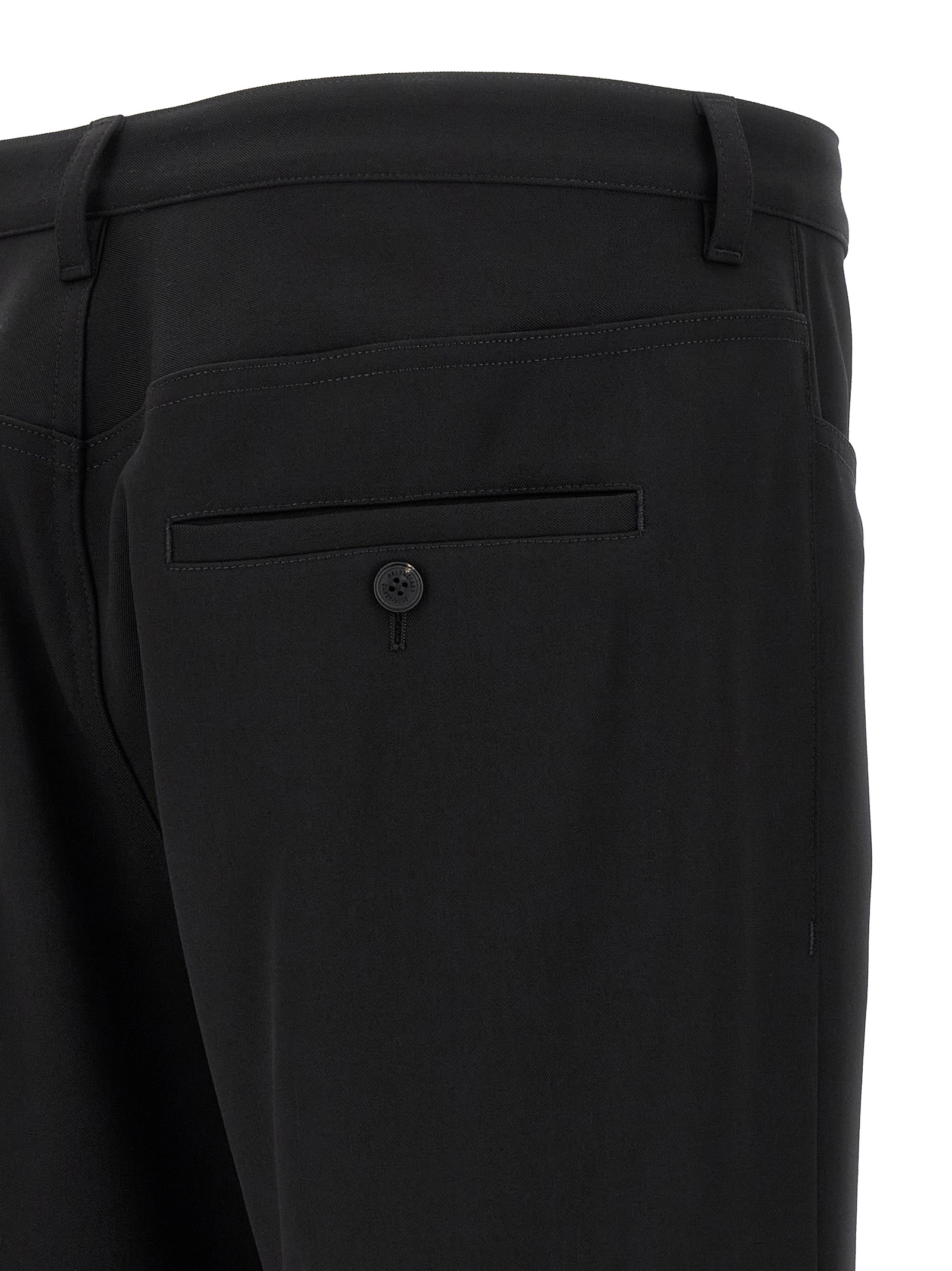 Stretch wool twill pants, medium waist, ruffled leg, stretched pleat, zip and front button closure, pockets.