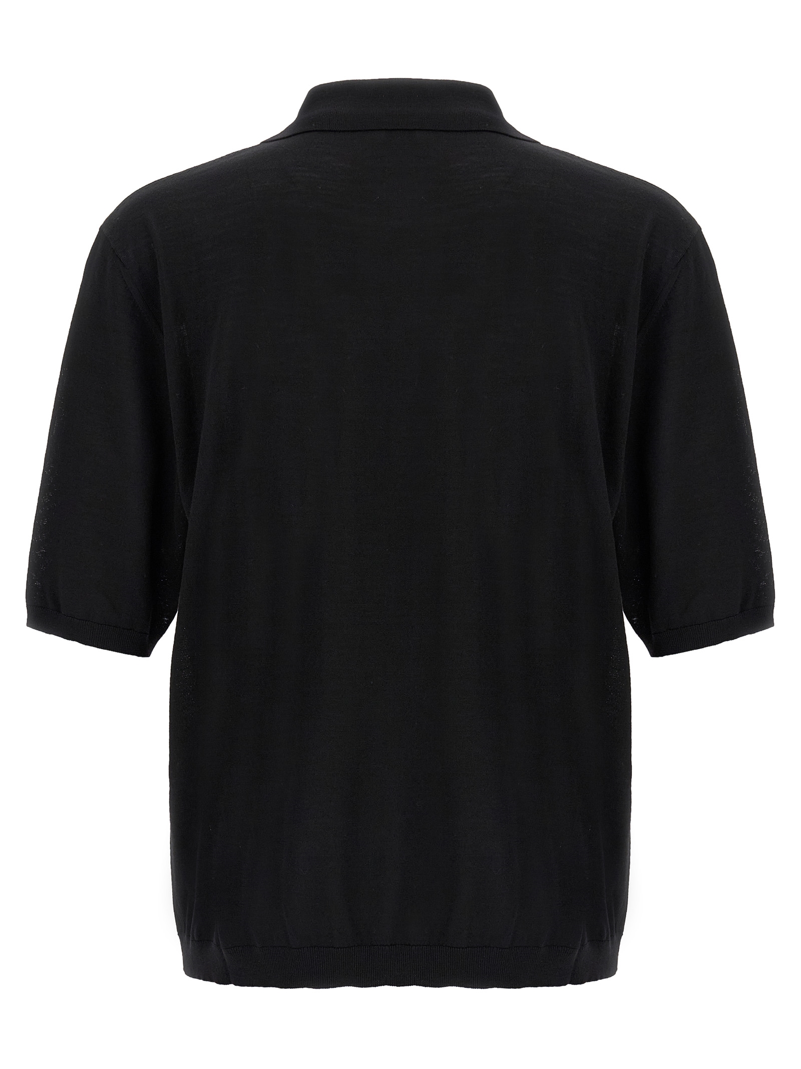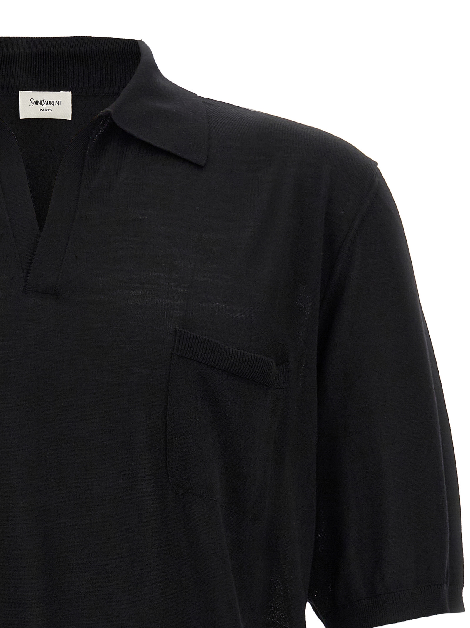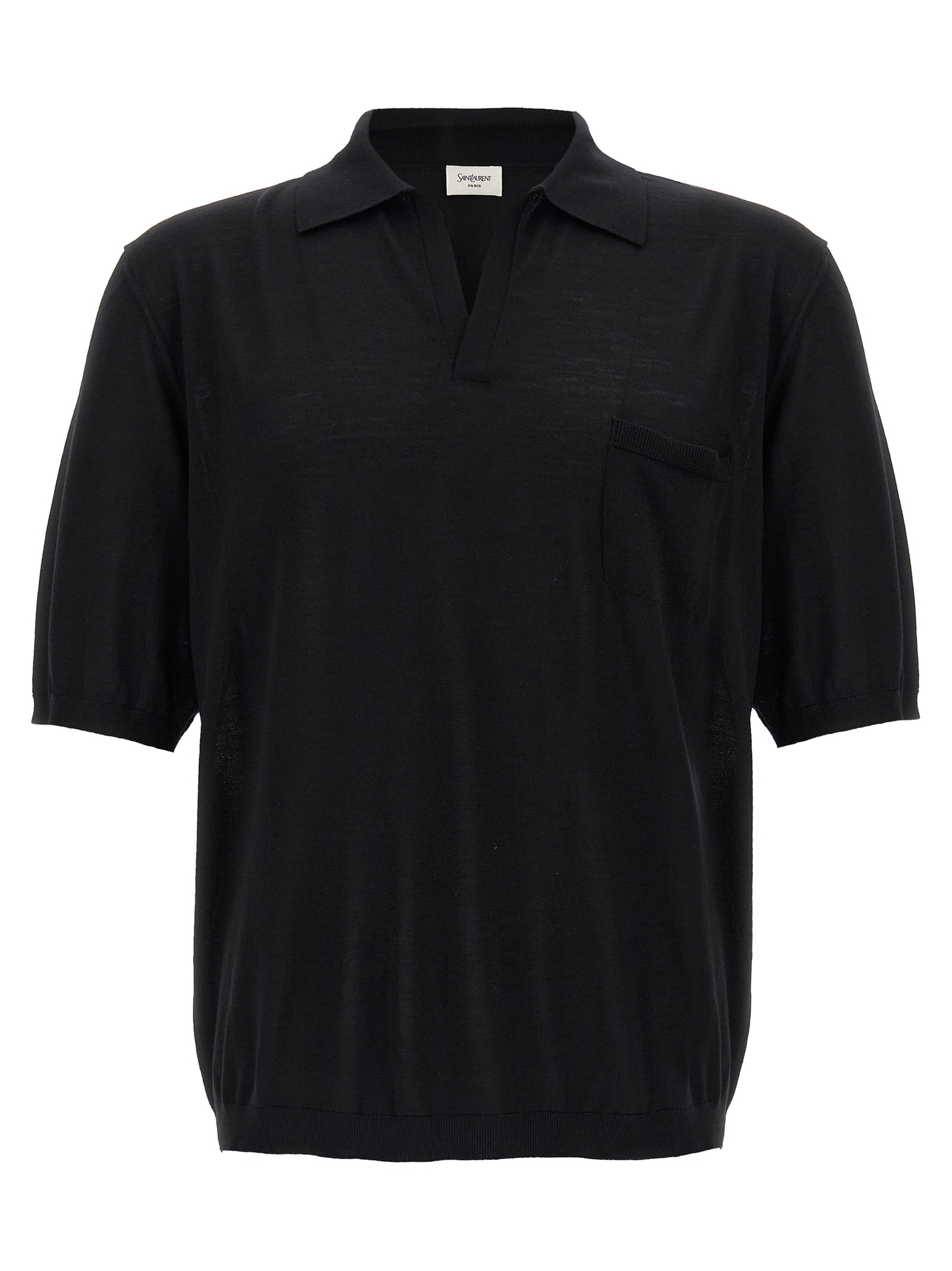 Wool polo shirt, V-neck, collar, chest pocket, short sleeves with dropped shoulders.