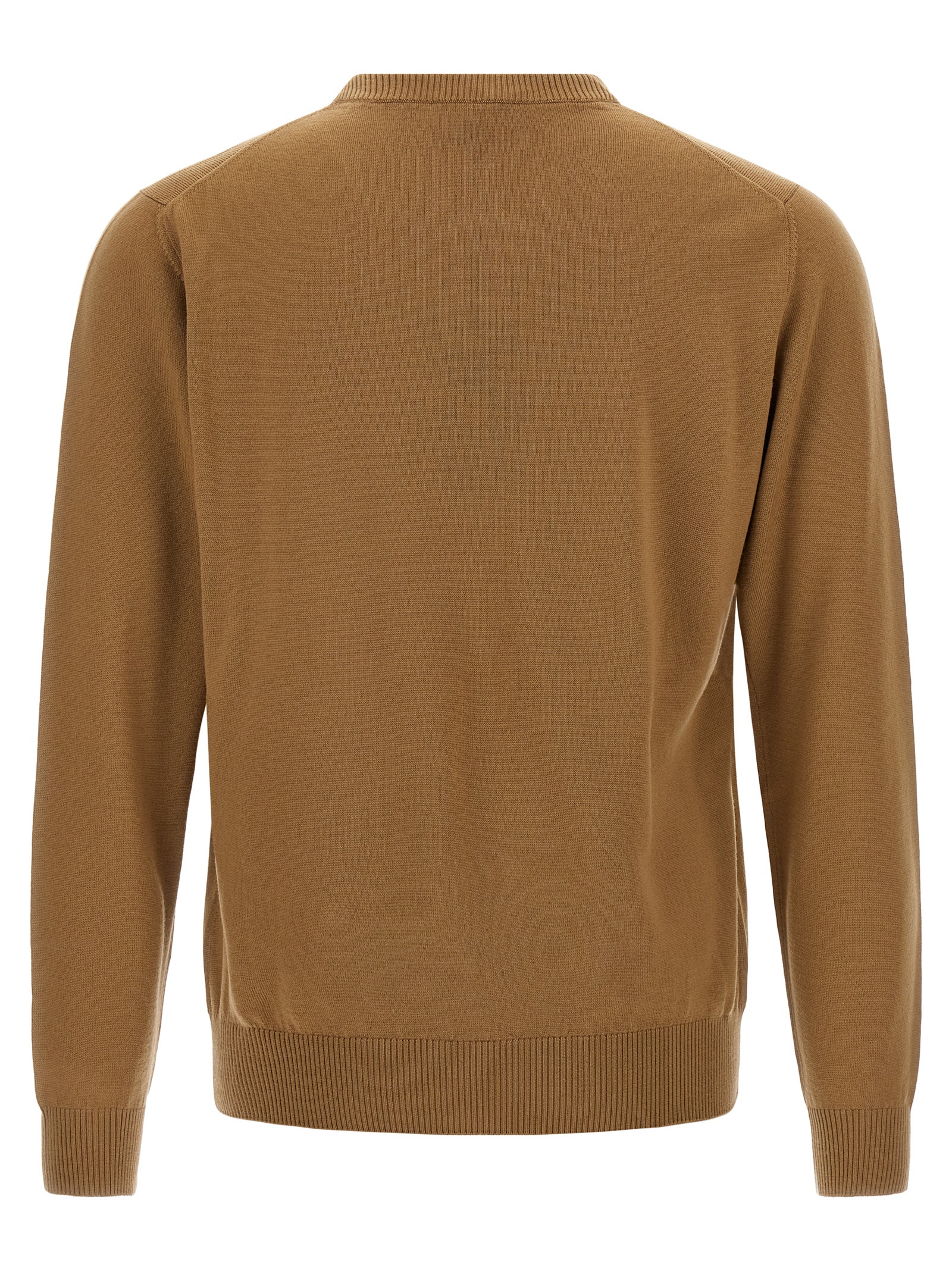 Wool yarn sweater with embossed front logo, crew neck, long cuffed sleeves.